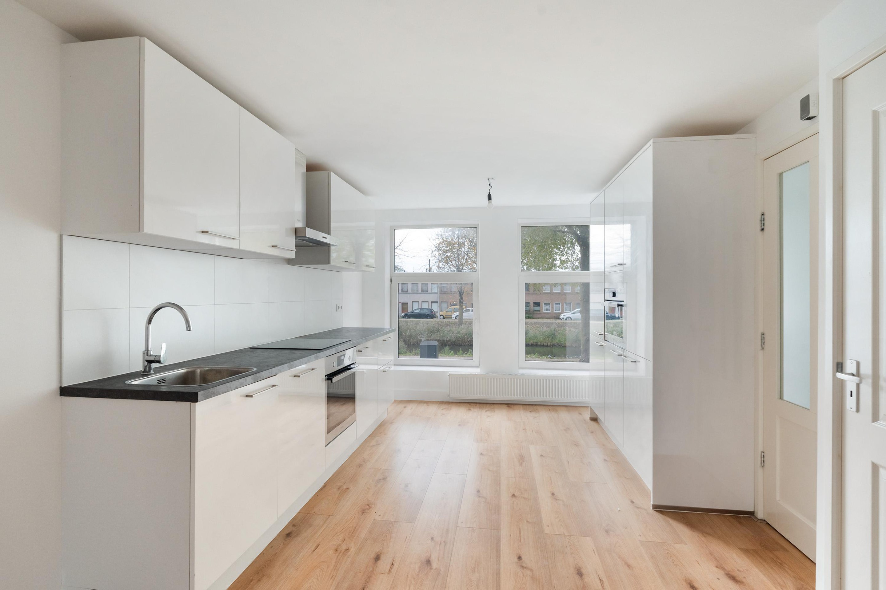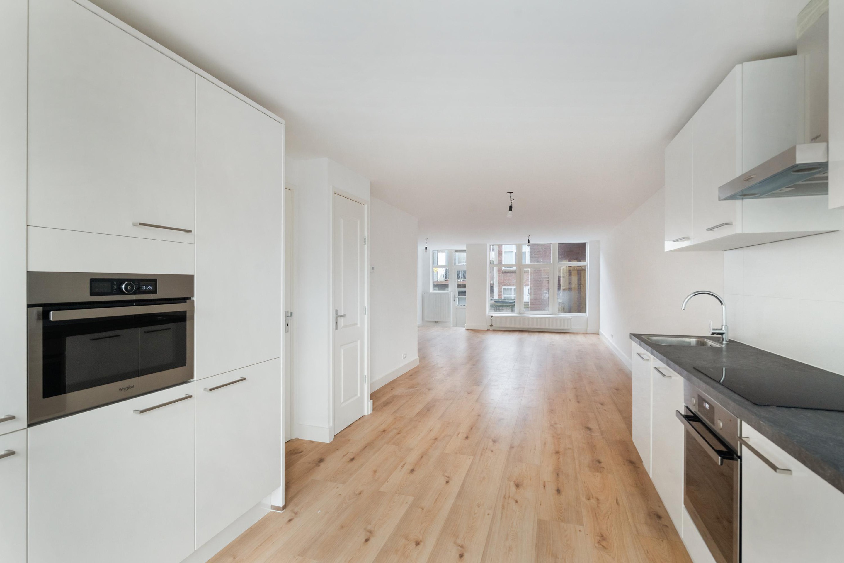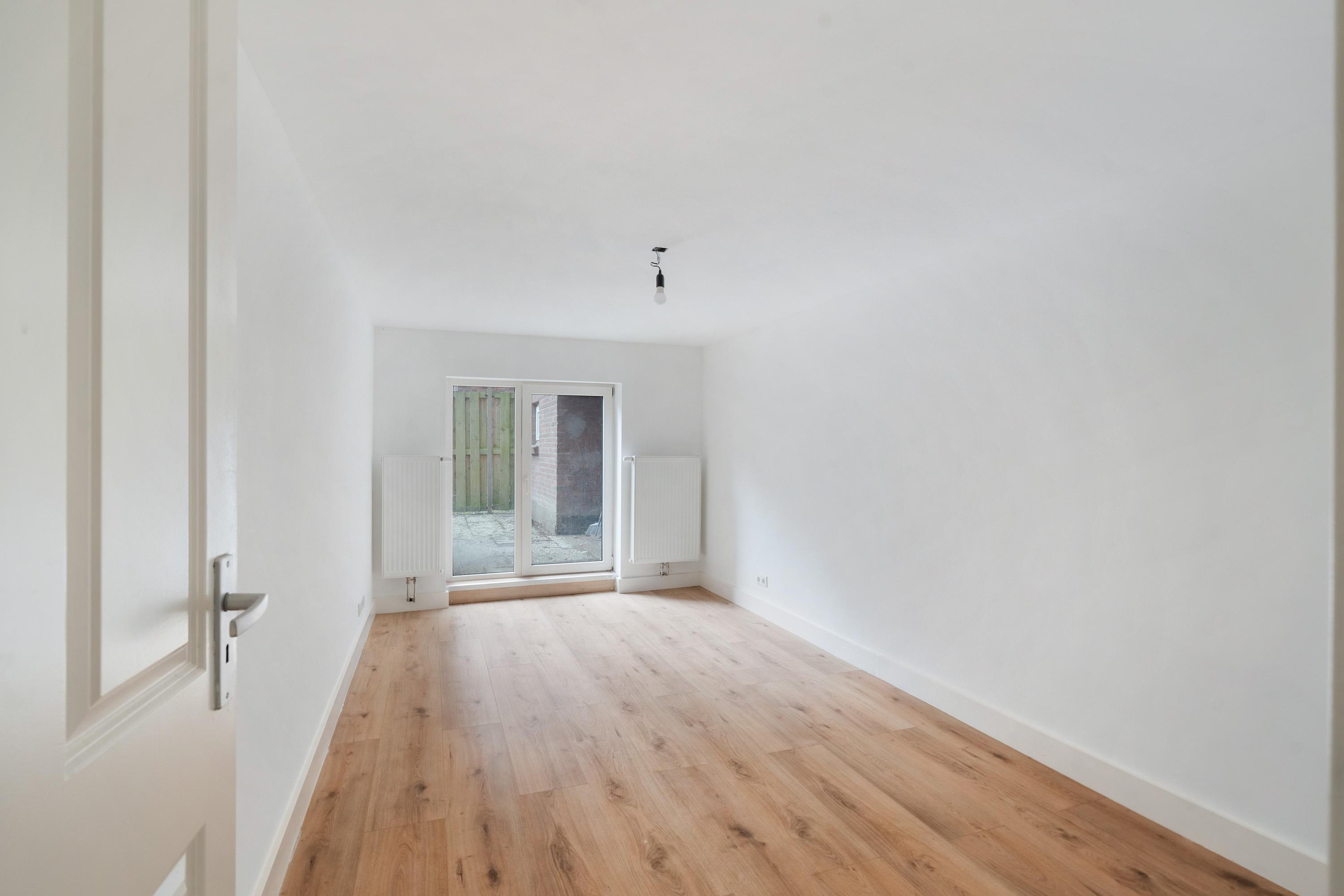 De woonkamer strekt zich uit over de volle diepte van de woning en ontvangt veel daglicht. Via de deur bereikt u de fraai aangelegde achtertuin, een heerlijke plek om buiten te ontspannen. De keuken aan de voorzijde beschikt over moderne inbouwapparatuur en biedt ruimte voor een eettafel.