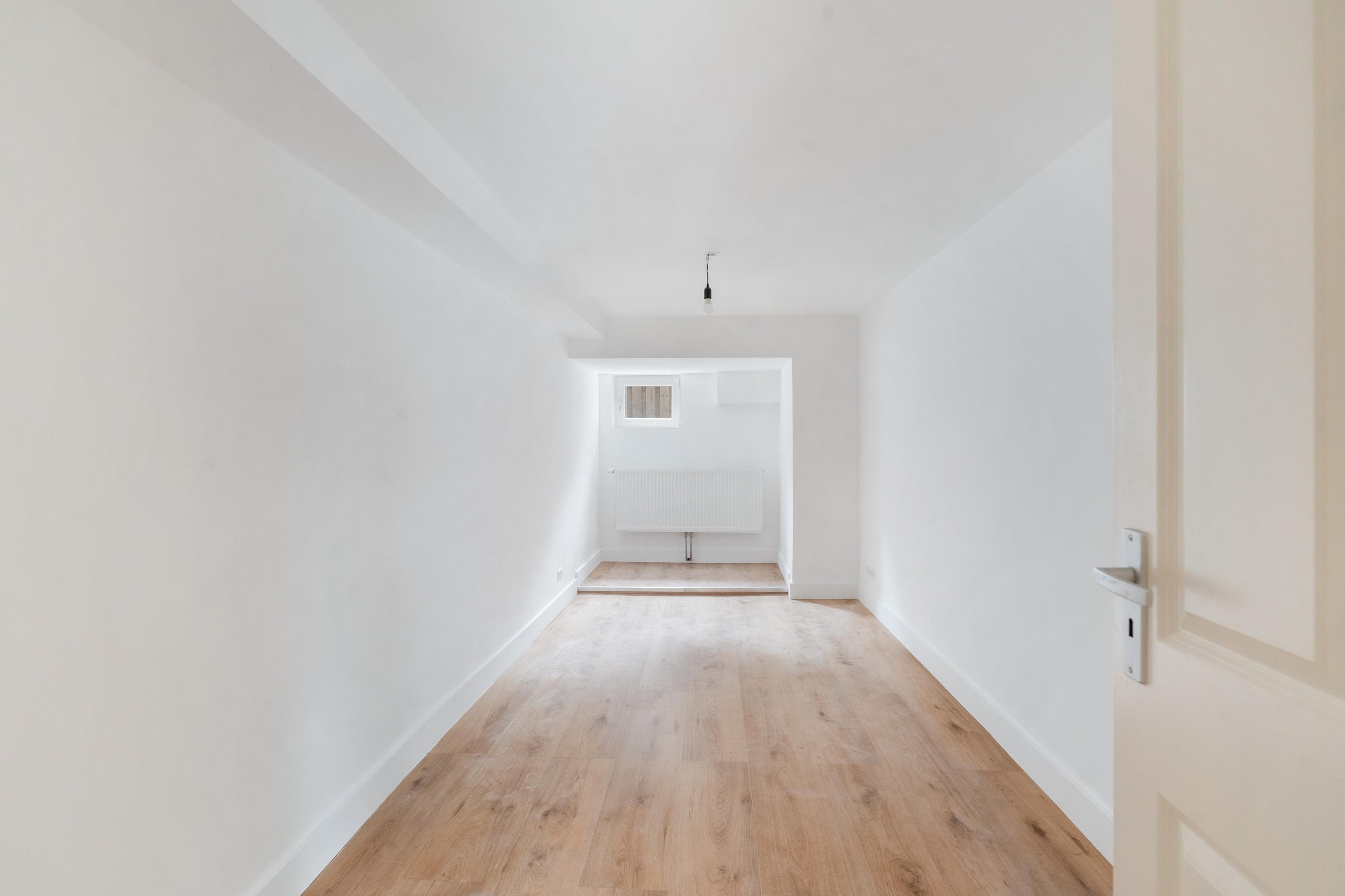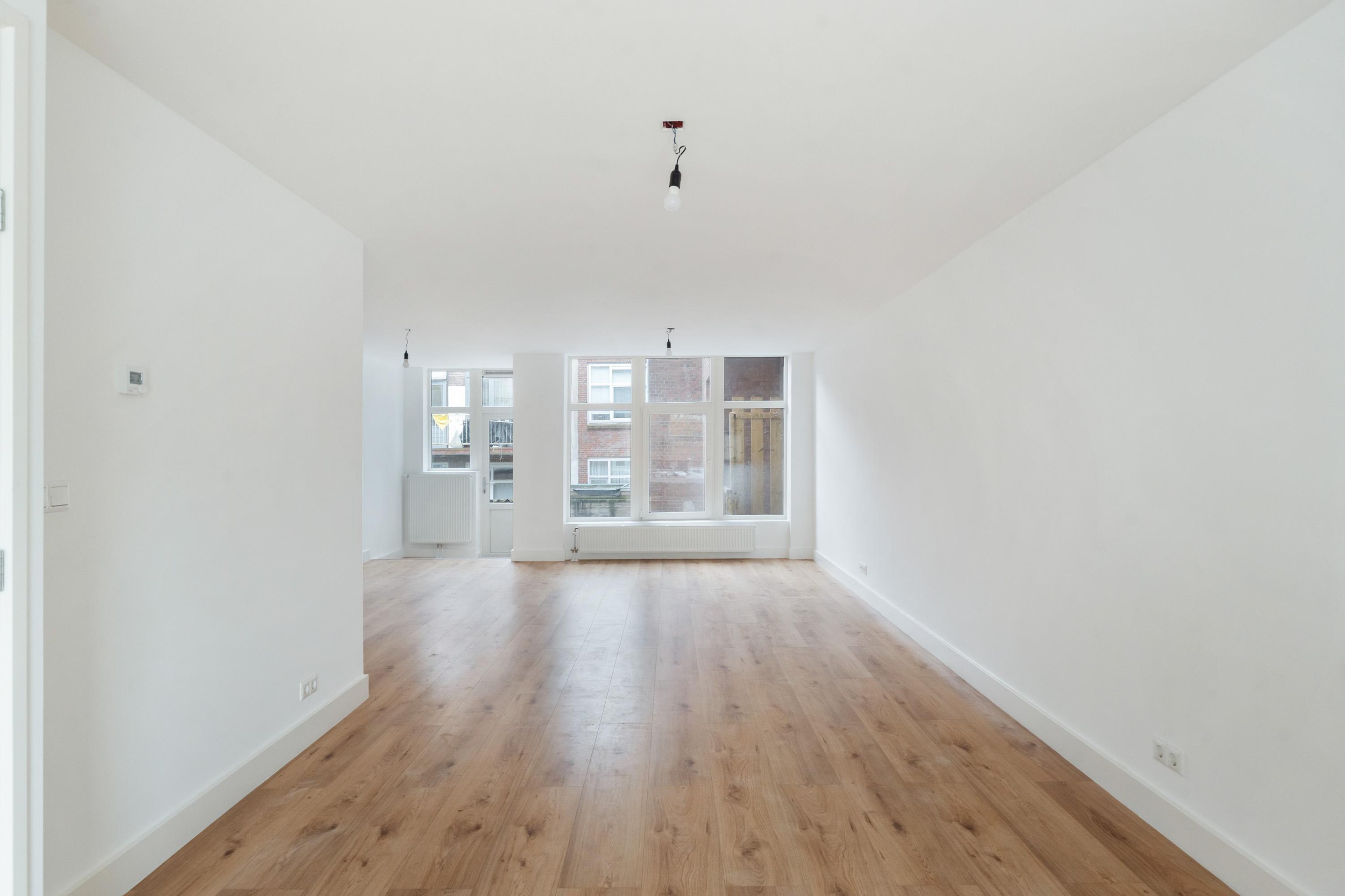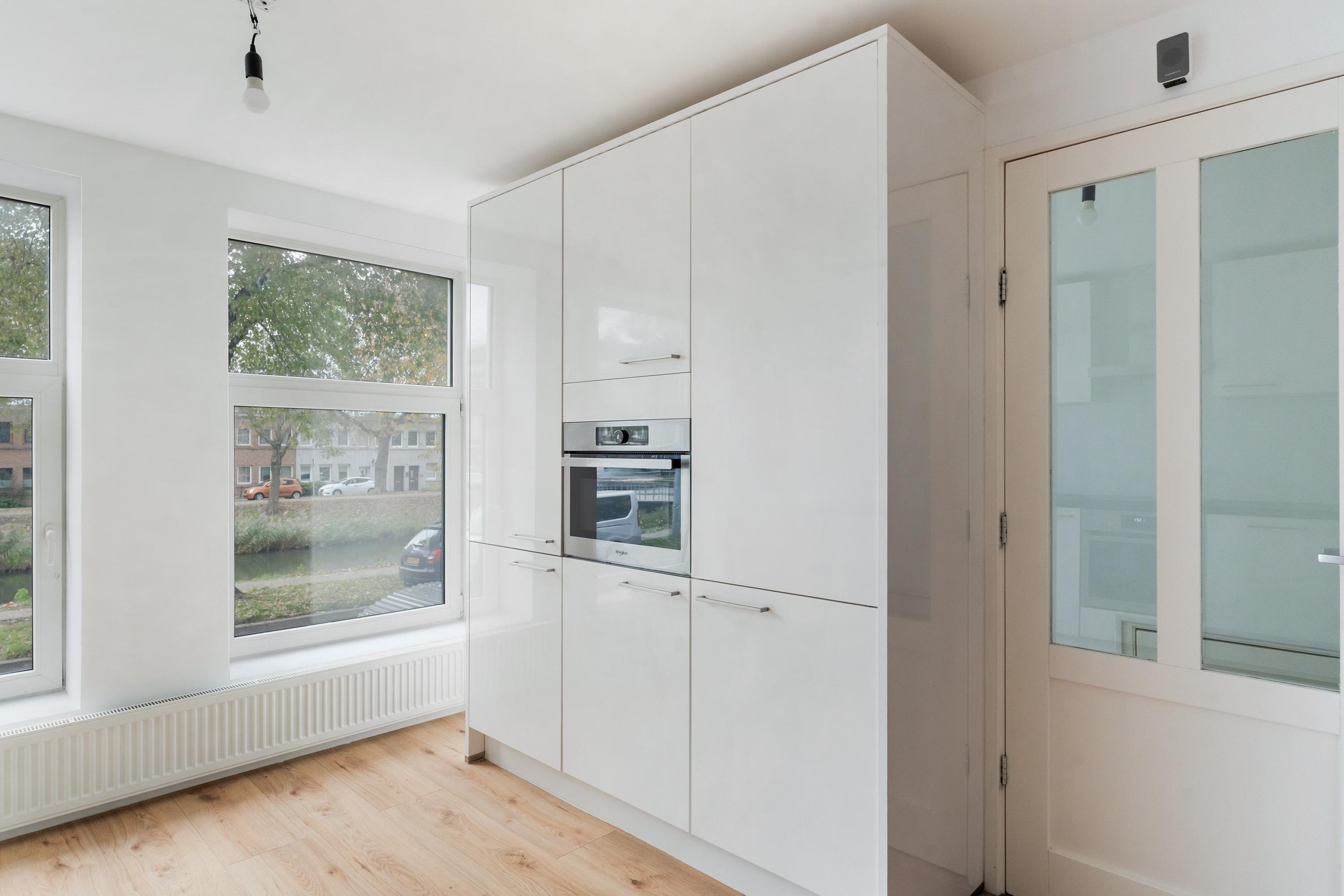 De woonkamer strekt zich uit over de volle diepte van de woning en ontvangt veel daglicht. Via de deur bereikt u de fraai aangelegde achtertuin, een heerlijke plek om buiten te ontspannen. De keuken aan de voorzijde beschikt over moderne inbouwapparatuur en biedt ruimte voor een eettafel.