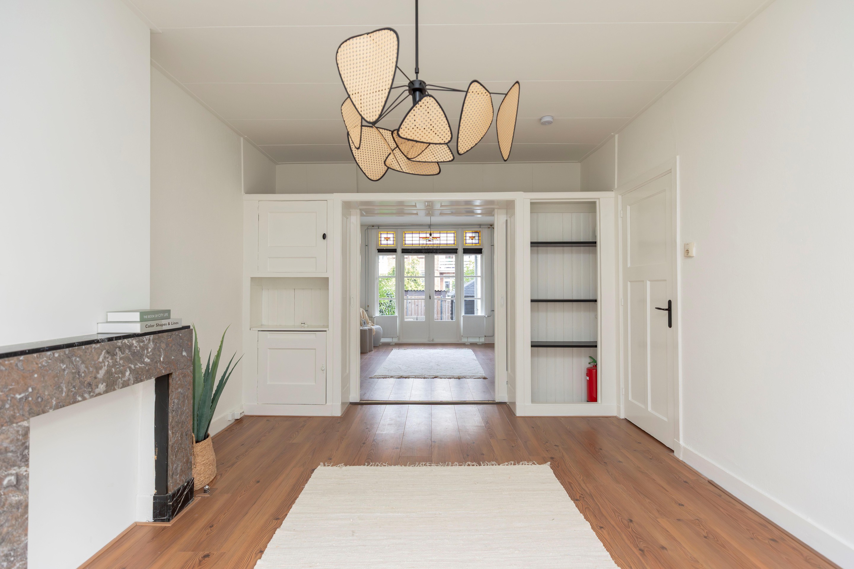 Het tochtportaal is nog voorzien van de originele betegeling. De binnendeuren zijn uitgevoerd met panelen en er zijn marmeren schouwen aanwezig.