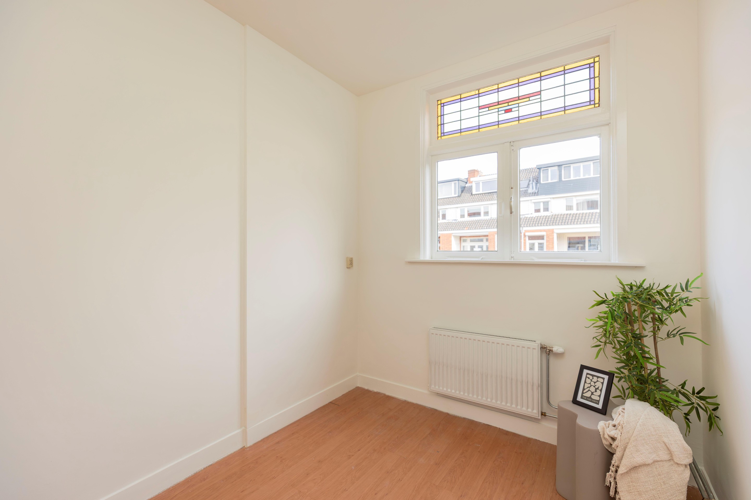De overloop leidt naar de fijne slaapkamer. Ook hier is dezelfde nette afwerking te vinden als in de rest van de woning, met sfeervolle glas-in-loodbovenramen.