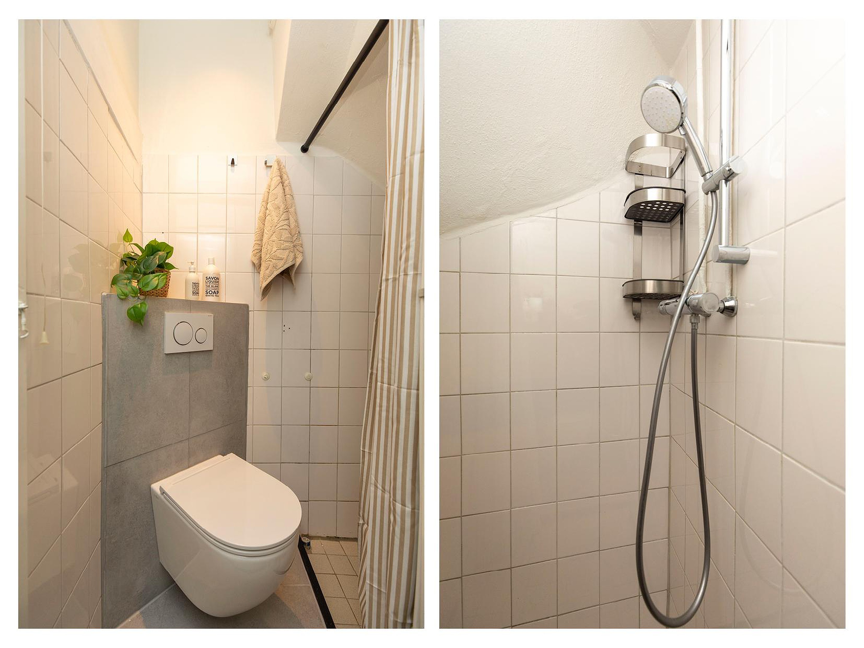 De badkamer is netjes betegeld en beschikt over een douchehoek en een toilet.