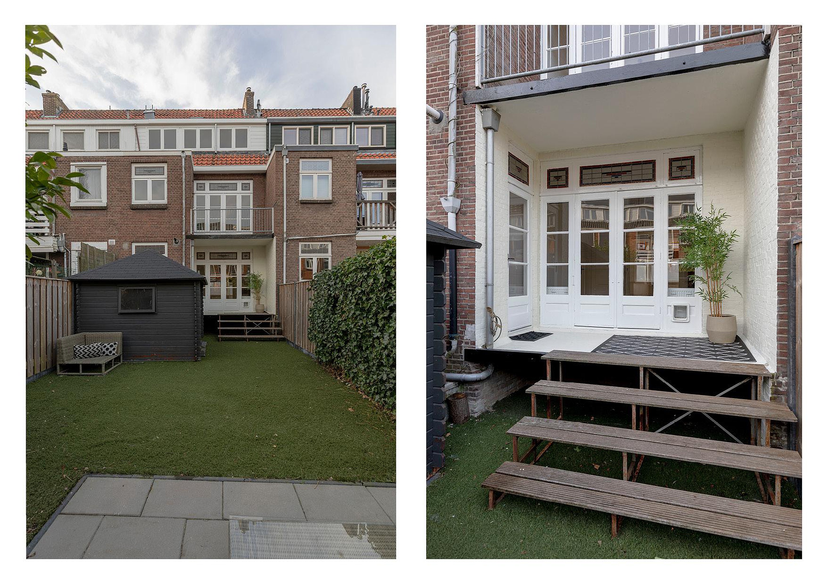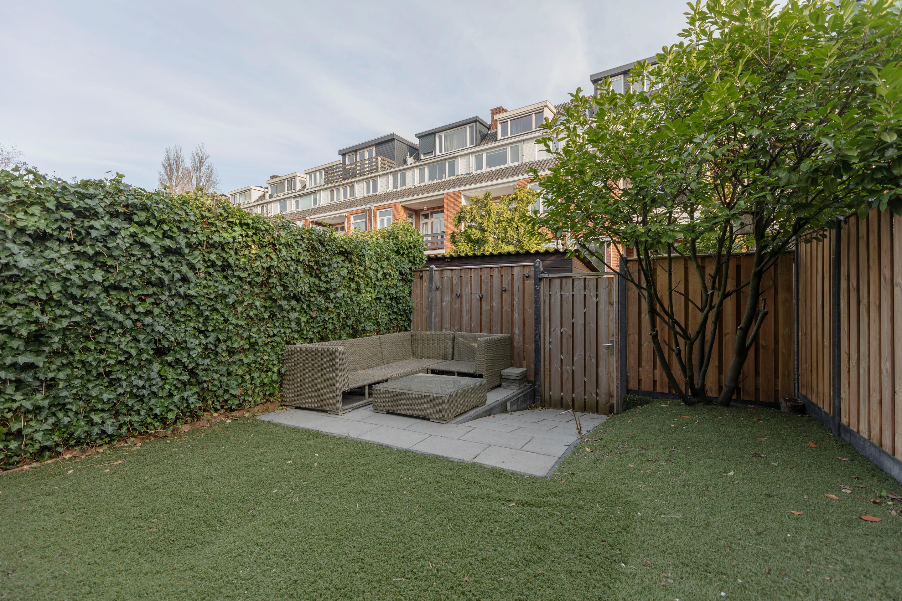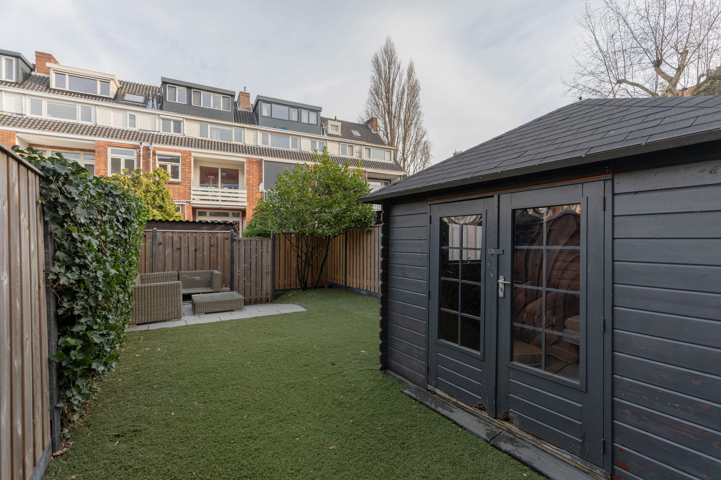 De achtertuin is diep, onderhoudsvriendelijk en biedt volop privacy, doordat de achterliggende bebouwing ver weg ligt. De tuin is netjes aangelegd en heeft kunstgras en verschillende terrassen. In de tuin staat een mooi tuinhuis die voor verschillende doeleinden gebruik zou kunnen worden.