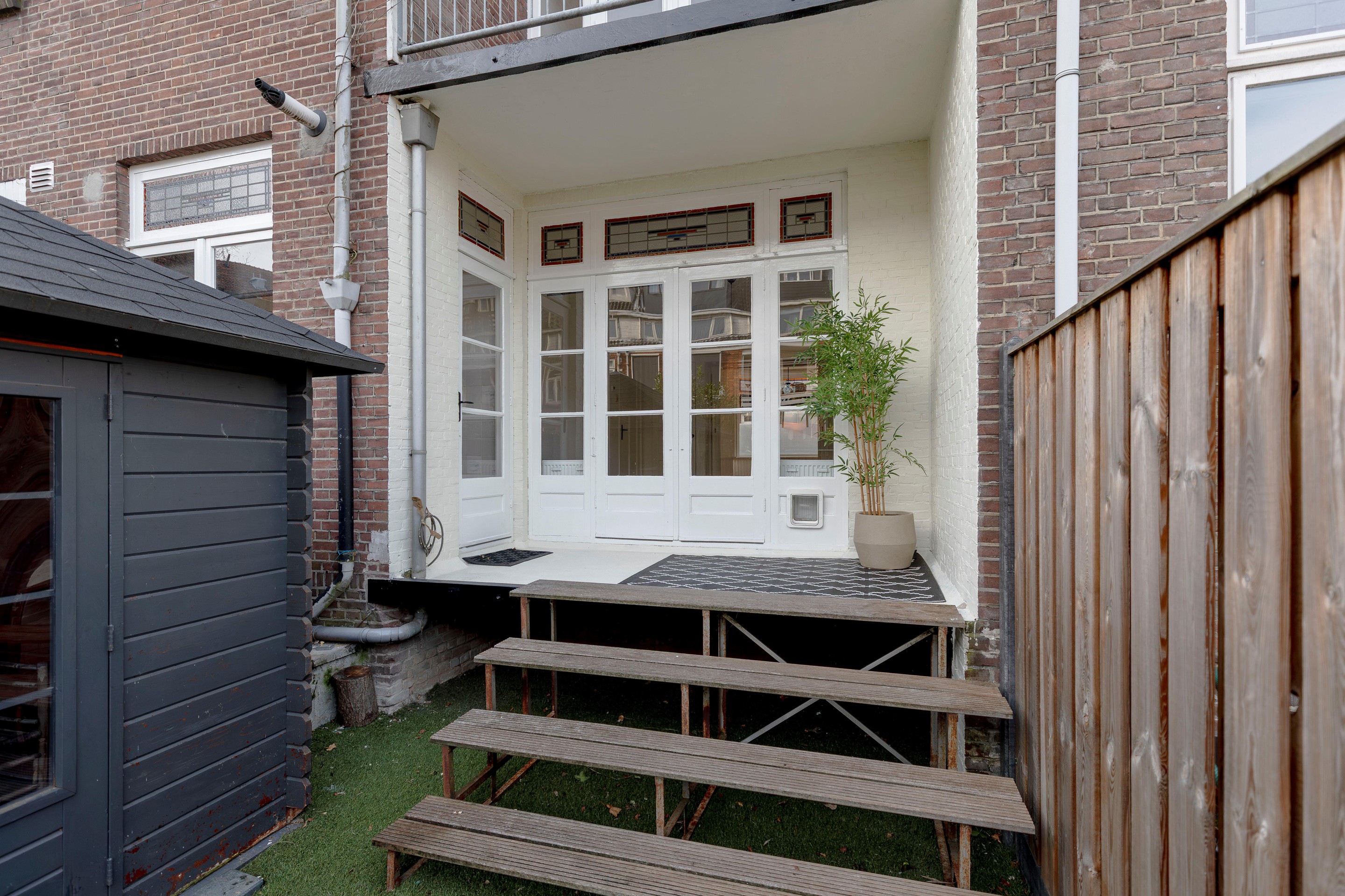 De lichte en ruime woonkamer is aan de achterzijde gelegen en beschikt over openslaande deuren naar de achtertuin. Vanuit de woonkamer is er mooi zicht op de diepe achtertuin en het riante terras. Via de klassieke tuindeuren met glas-in-loodbovenramen stap je op het beschutte terras, waar je al vroeg in het seizoen in de ochtendzon kunt genieten van je eerste kop koffie.