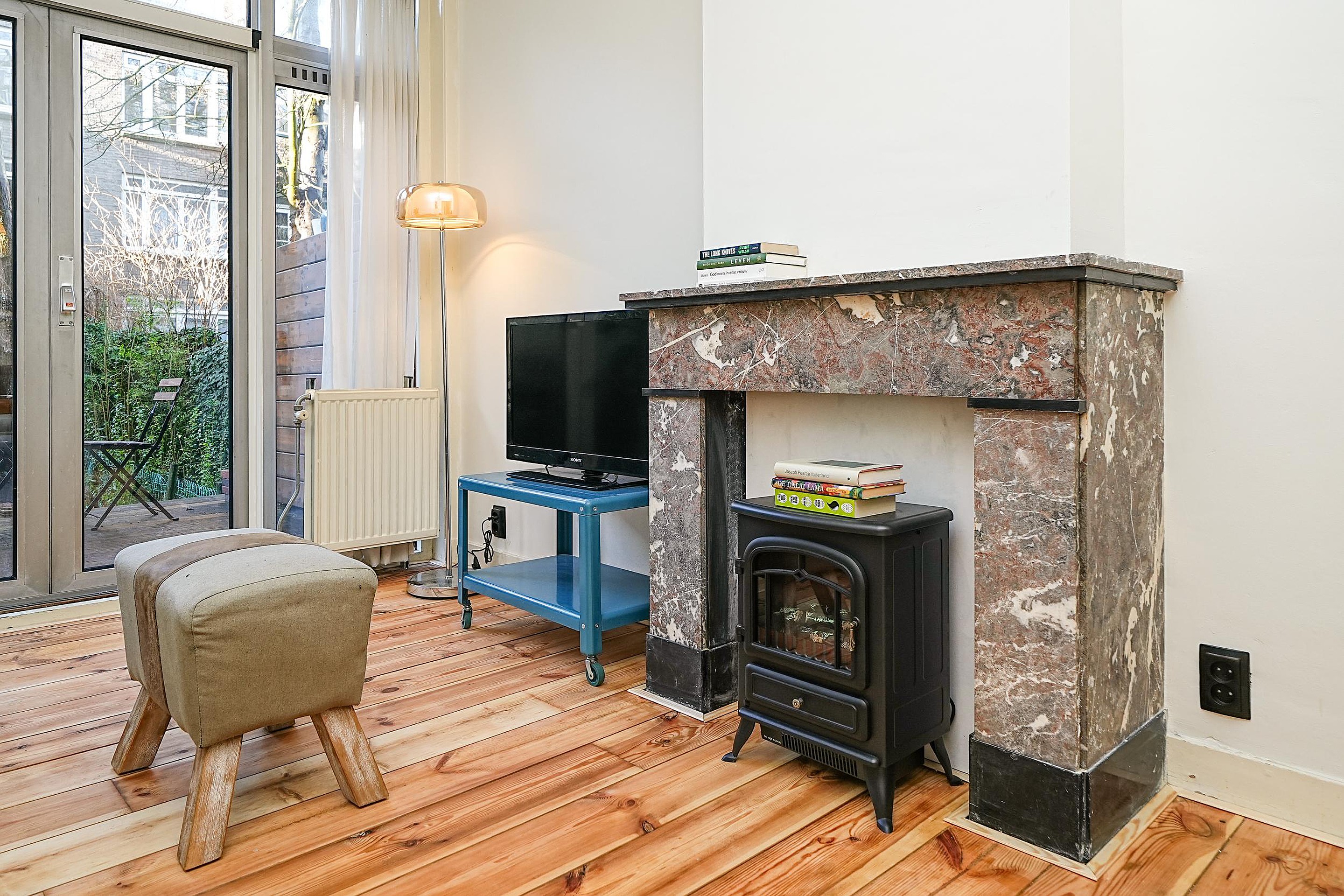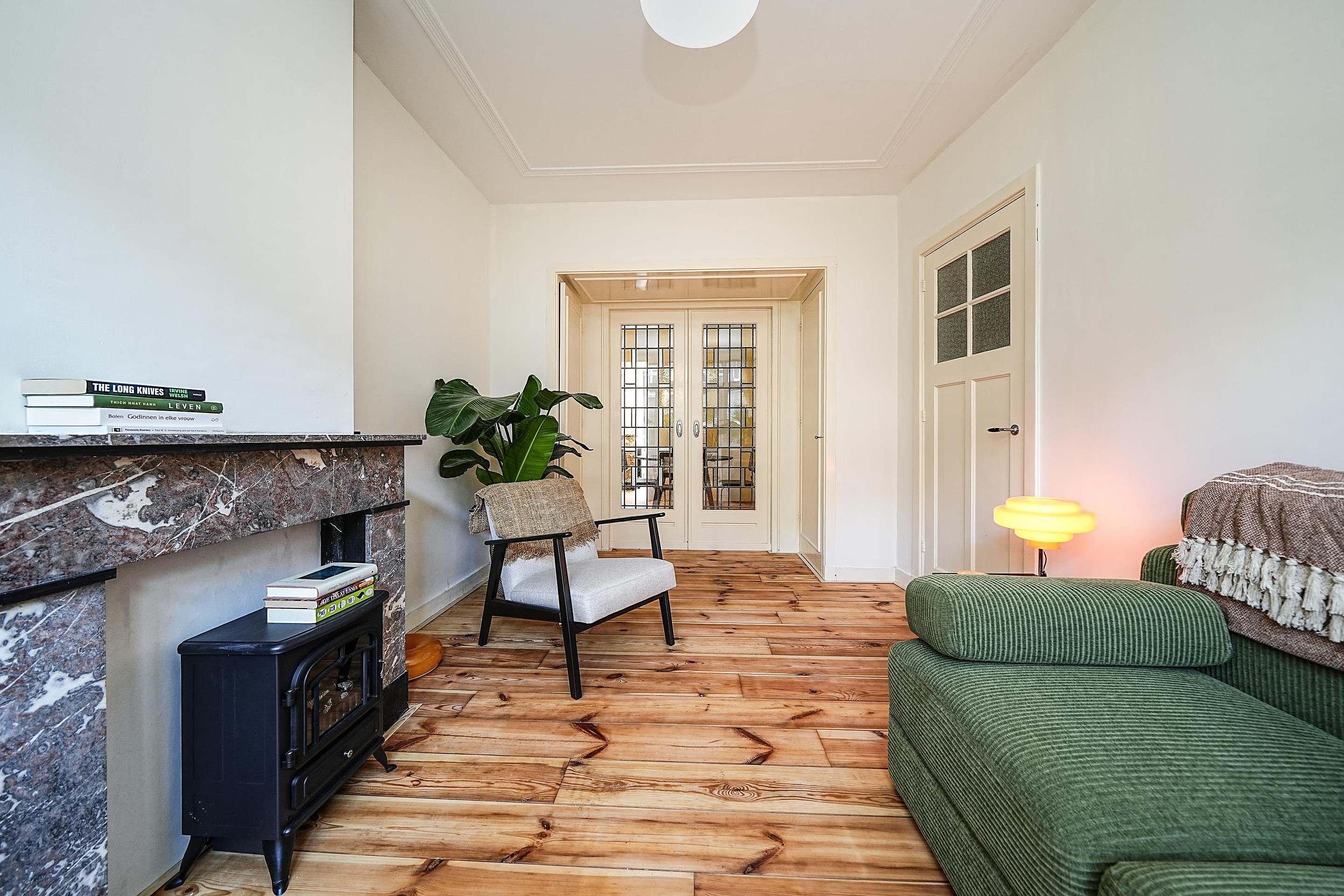 Aan de achterzijde bevindt zich de riante woonkamer, voorzien van openslaande deuren naar de tuin. De ruimte biedt volop plek voor een royale zithoek en ademt sfeer dankzij de originele schouw, strakke wanden, fraaie plafondlijsten en een doorlopende houten (grenen) vloer.