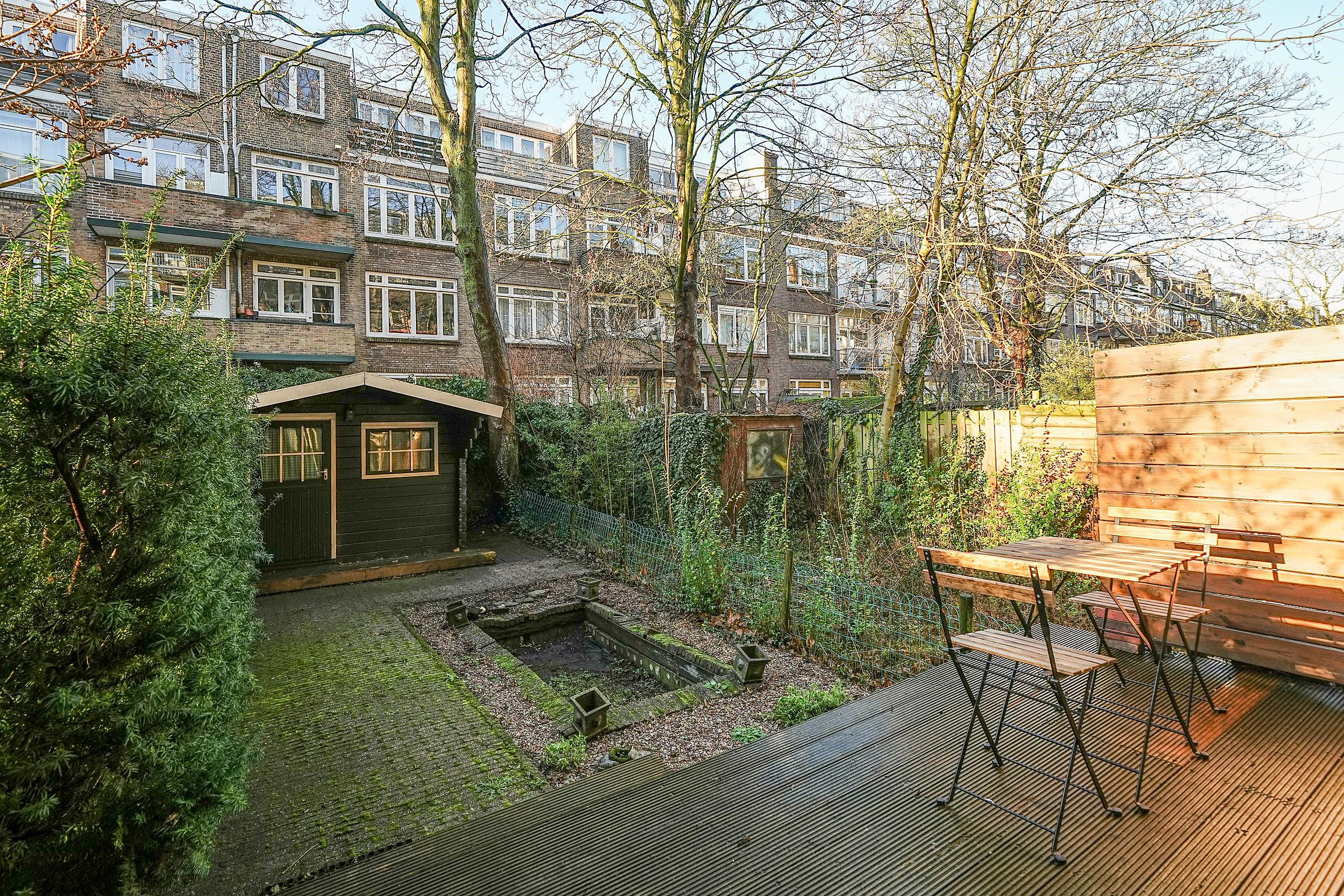 De zonnige achtertuin vormt een verlengstuk van de woonkamer. De veranda nodigt uit tot lange zomeravonden en via een trap bereikt u de lagergelegen tuin. Dankzij de westelijke ligging is het hier heerlijk vertoeven tot zonsondergang.