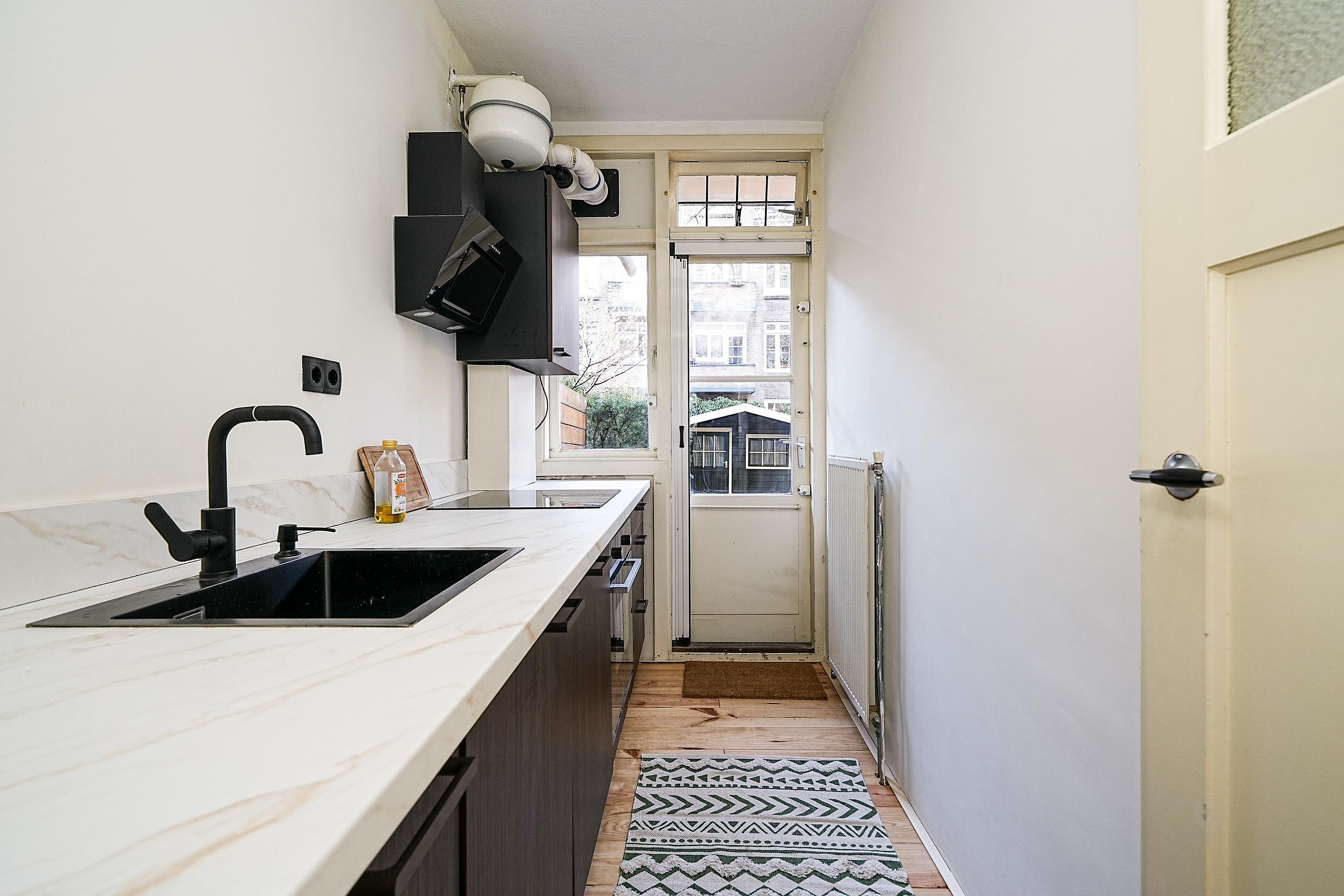 De recent vernieuwde keuken (Ikook) aan de achterzijde is modern uitgevoerd in een donkerbruine kleurstelling met natuursteenlook aanrechtblad en voorzien van alle gemakken: koelkast, inductiekookplaat, oven, vaatwasser en een bijpassende zwarte afzuigkap. Het leidingwerk en de elektriciteit in de keuken zijn recent vervangen. Vanuit de keuken is er directe toegang tot de achtertuin.