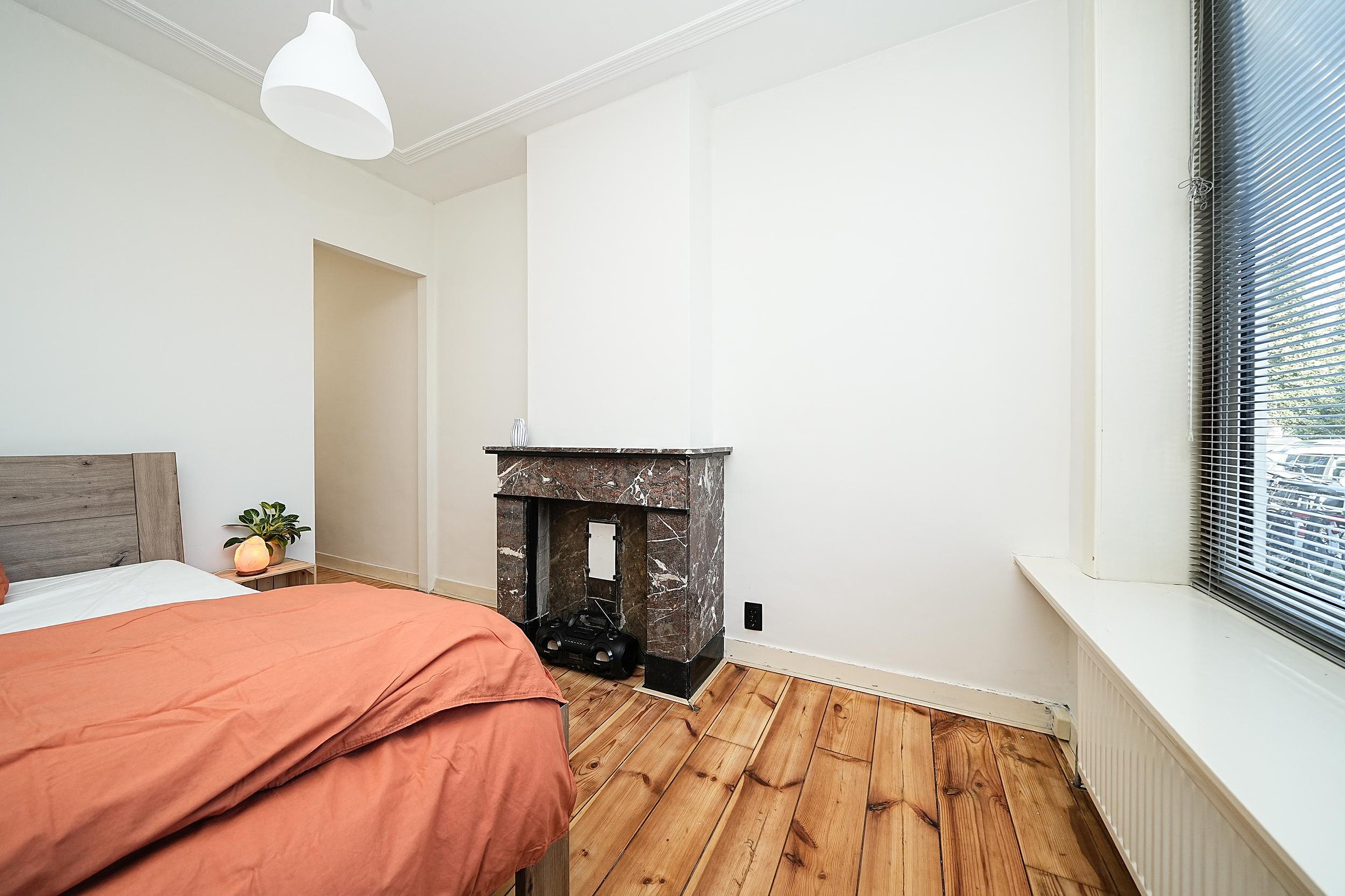 Aan de voorzijde ligt de ruime slaapkamer, een fijne en rustige plek om te ontspannen. De wand die de eetkamer van de woonkamer scheidt is recent vernieuwd. Het is een hele fijne slaapkamer en de originele marmeren schouw en plafondlijsten geven ook hier karakter en charme.