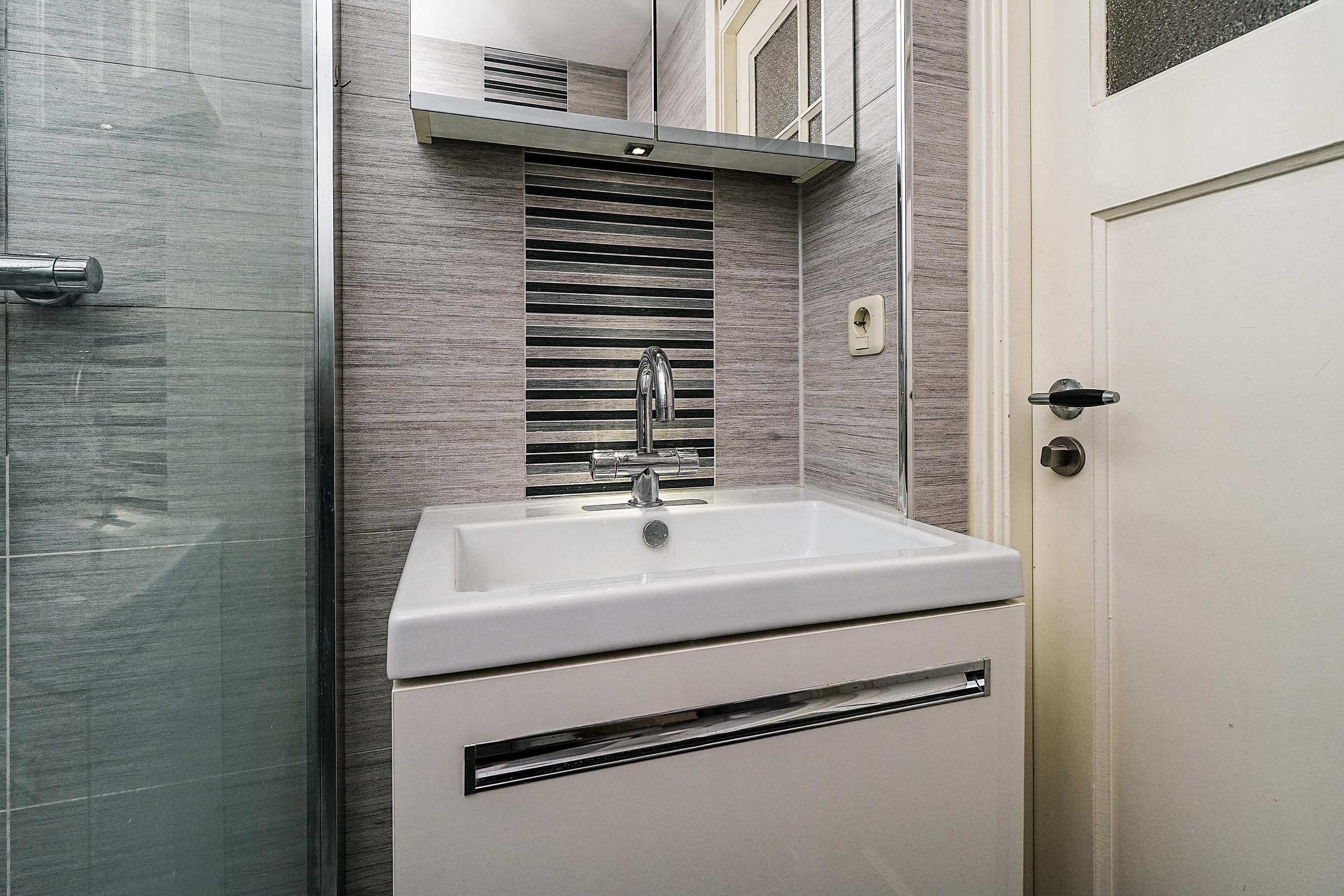 De badkamer is netjes en modern afgewerkt met grote grijze wandtegels en zwarte vloertegels. Voorzien van een wastafelmeubel, spiegelkast, douchehoek met glazen wand, toilet en inbouwspots. De voegen zijn recent vervangen.