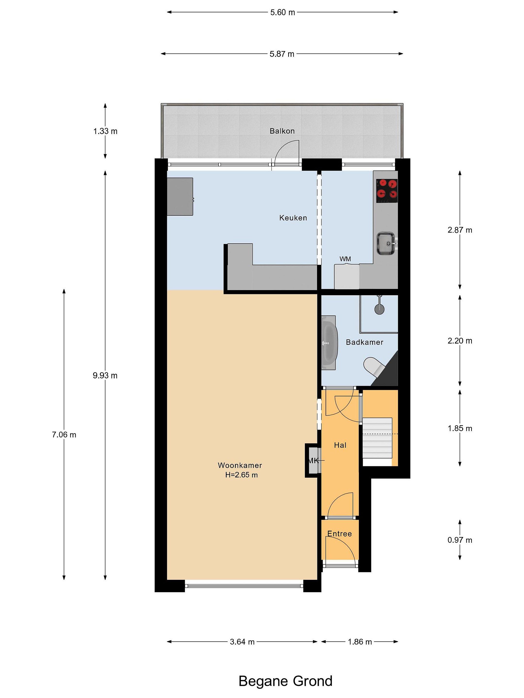 Entree, ruime woonkamer met eethoek en airco, half open keuken met diverse inbouwapparatuur zoals inductie kookplaat en vaatwasser en toegang tot het balkon. De badkamer is voorzien van een inloopdouche en een hangend toilet.