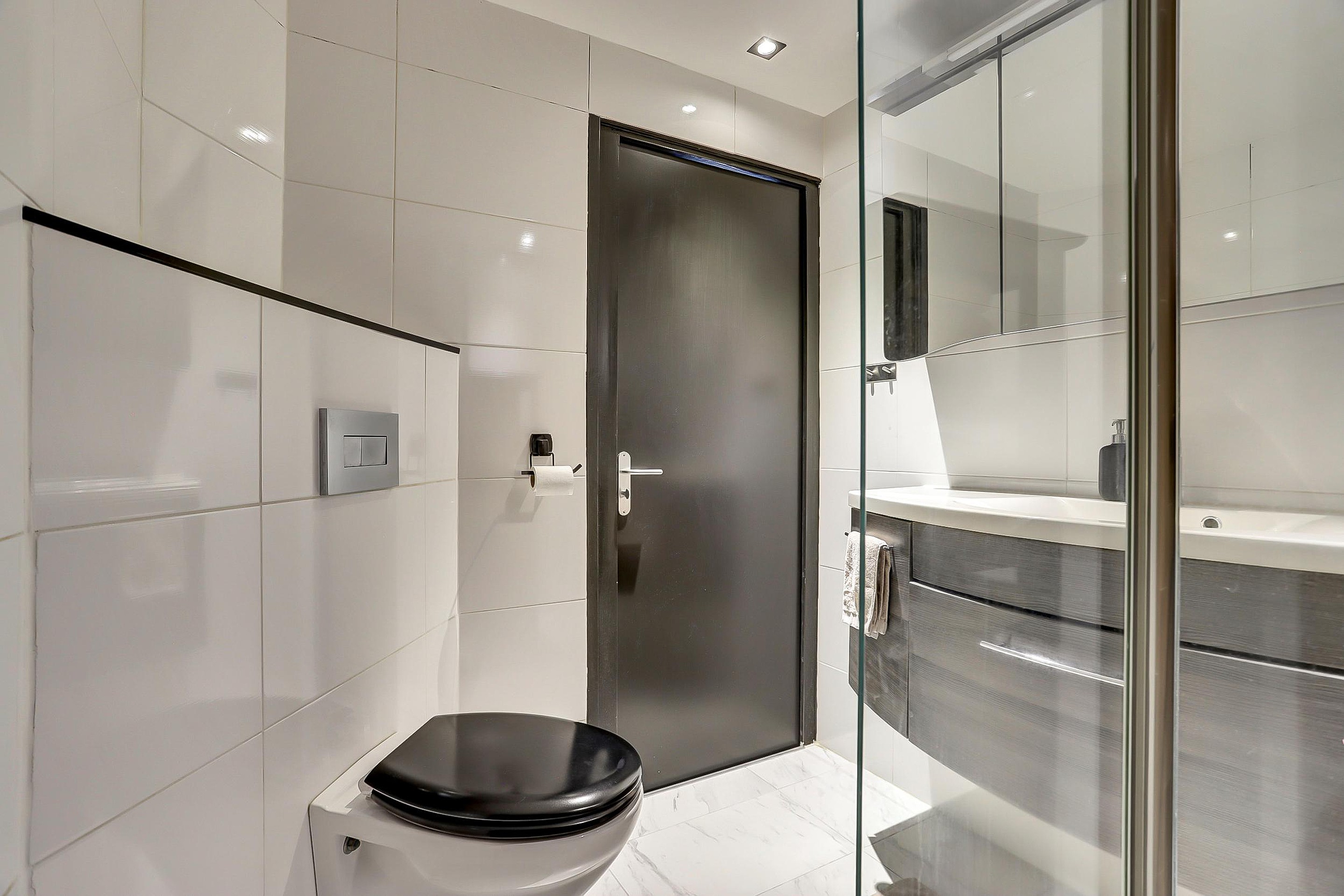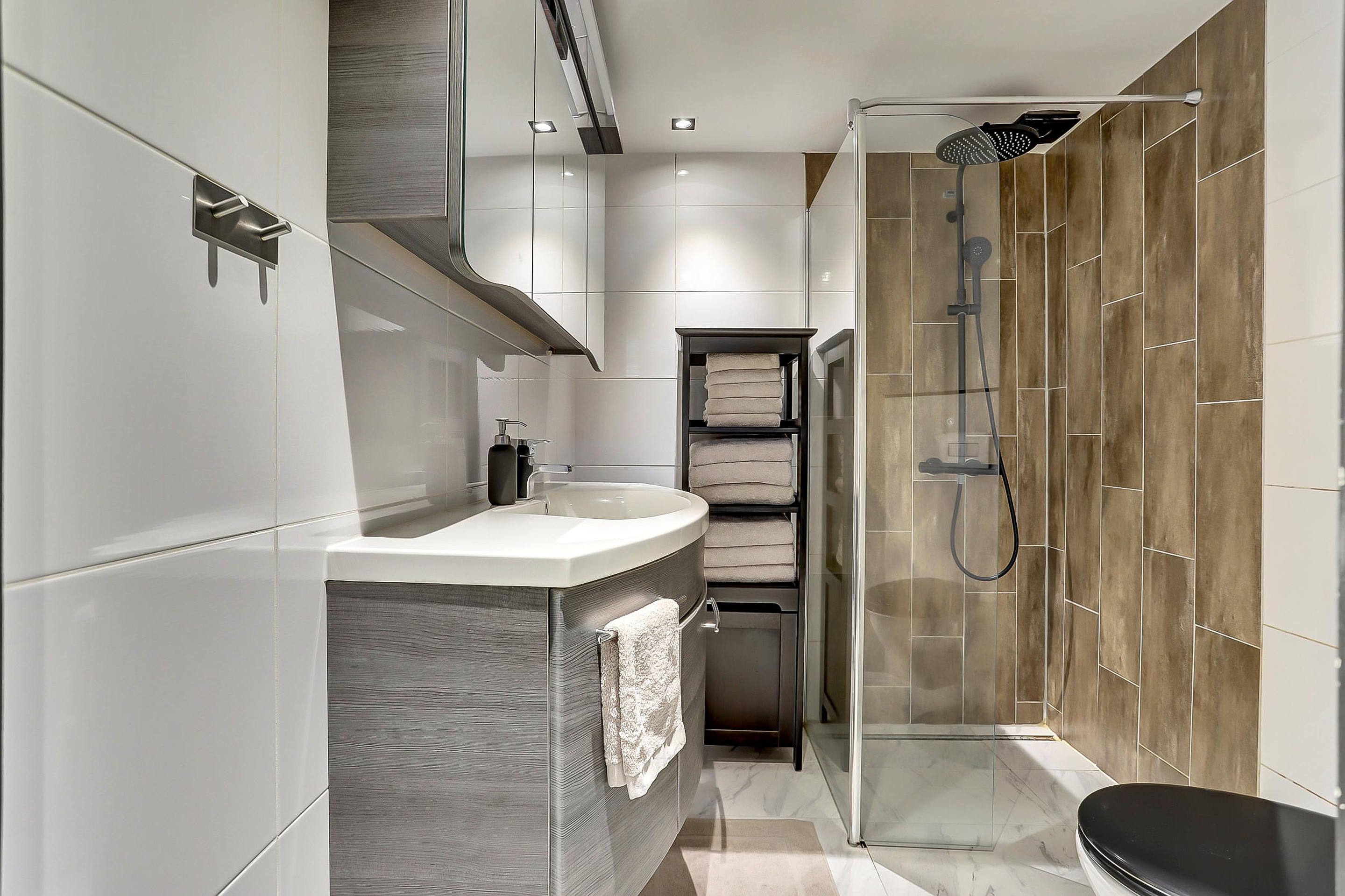 De moderne badkamer is compleet uitgevoerd met een regendouche, hangend toilet en wastafelmeubel en beschikt over mechanische ventilatie.