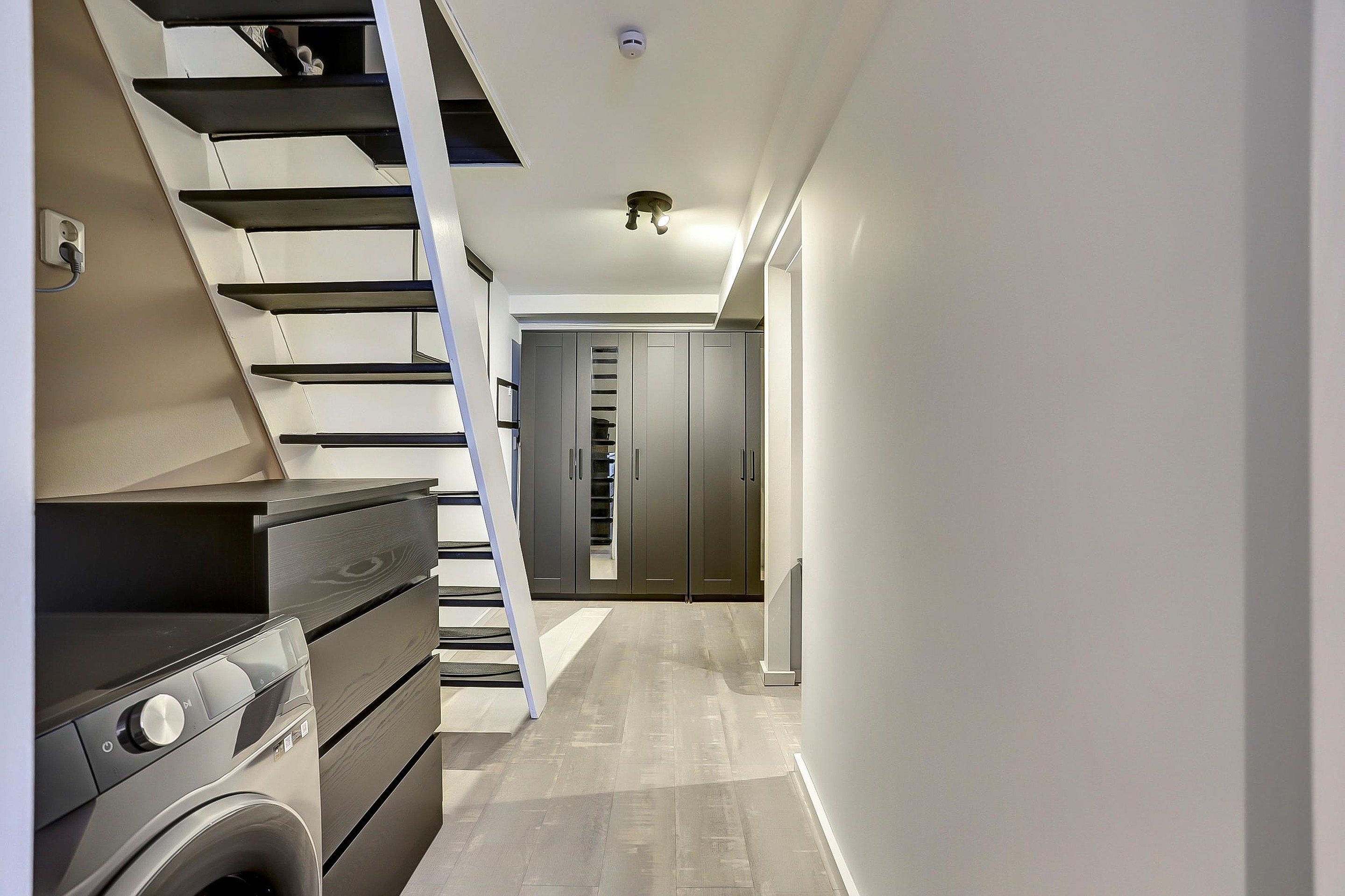 Via de eigen entree bereikt u de hal met vaste trap naar het souterrain. De lichte woonkamer is strak afgewerkt met gestucte wanden en plafonds en een moderne laminaatvloer. Grote raampartijen zorgen voor een aangename lichtinval en een prettige verbinding met buiten.