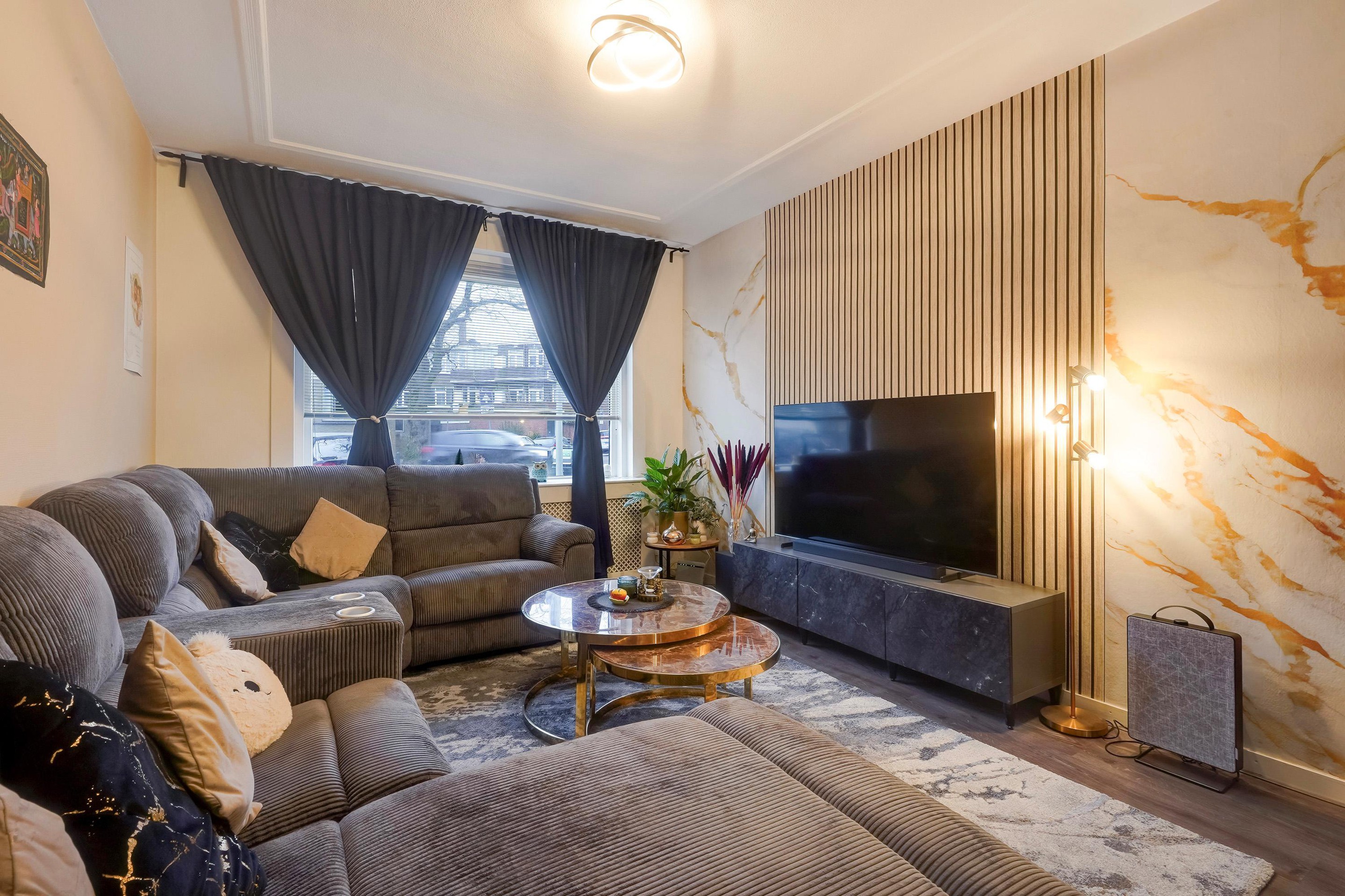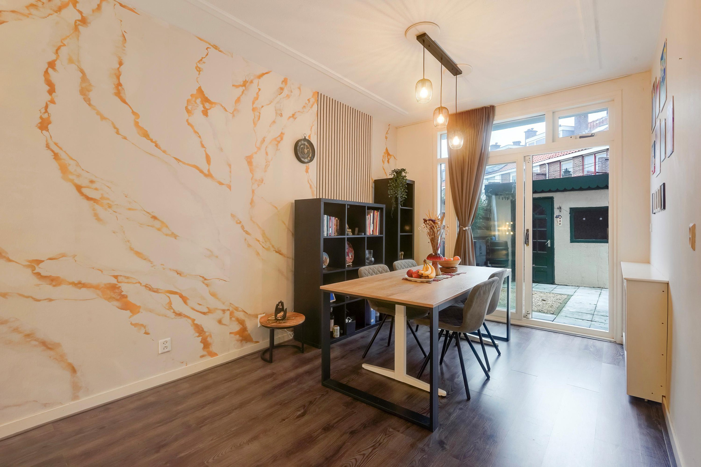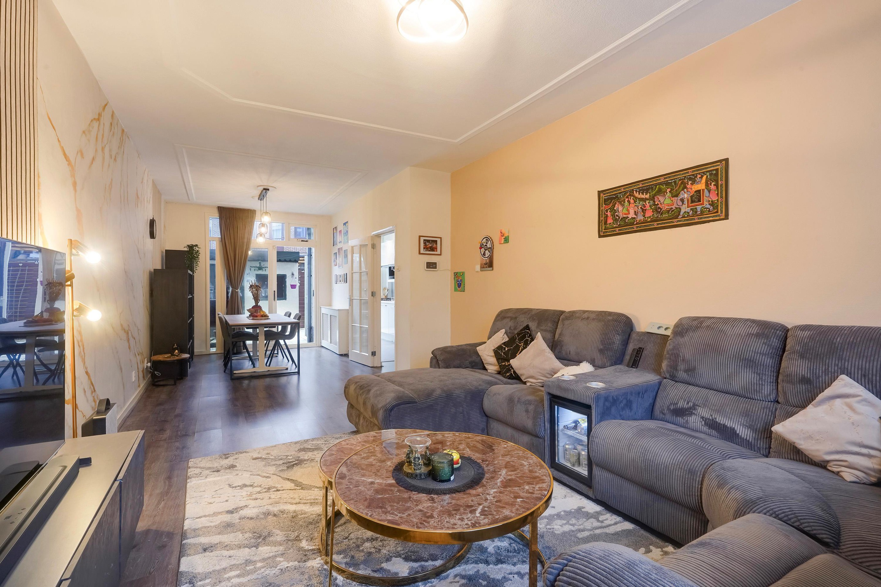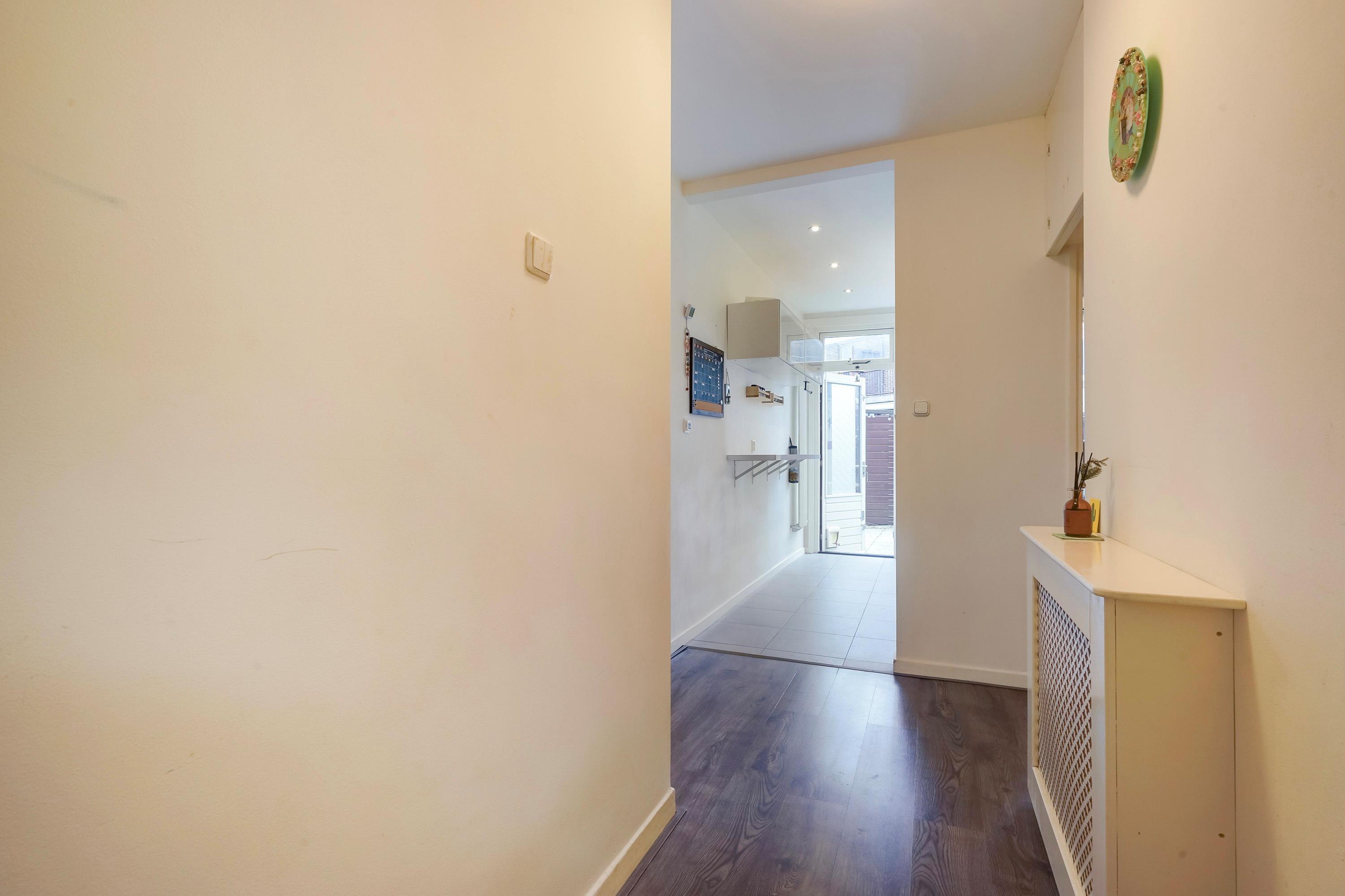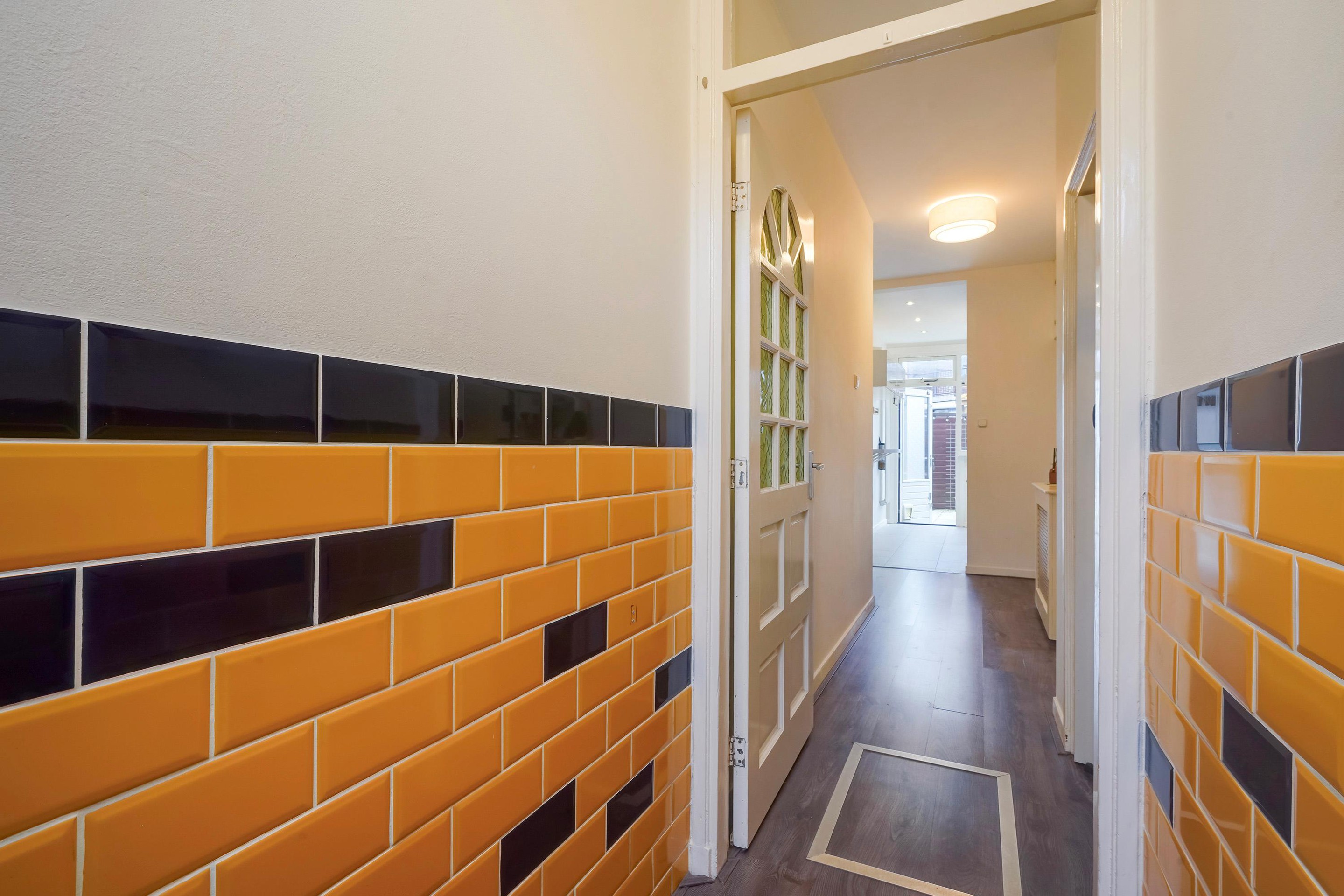 Via de hal stap je de lichte en ruime woonkamer binnen. De hal is gedurende de dag goed verlicht door het zonlicht, wat direct een prettige, open sfeer geeft. De mooie lichtinval, nette afwerking en het plafond met karakteristieke details in de woonkamer zorgen voor een warme en huiselijke uitstraling. Dit is een fijne plek om te ontspannen, maar ook om gezellig samen te zijn. Vanuit de woonkamer loop je zo de tuin in, wat zorgt voor een prettig gevoel van ruimte en verbinding met buiten.