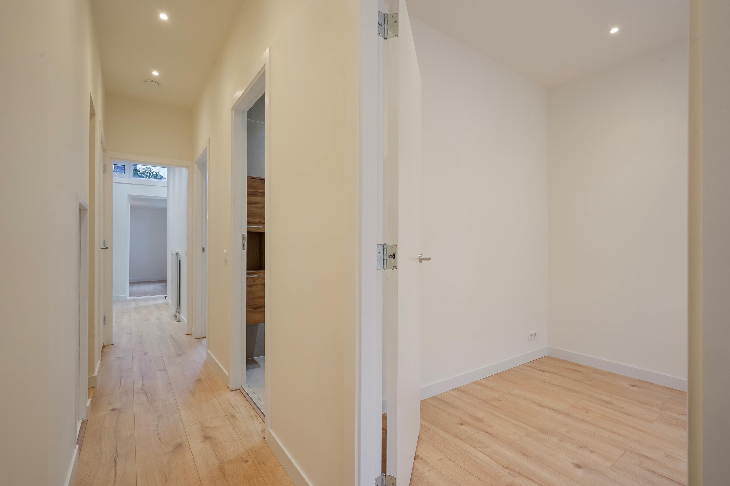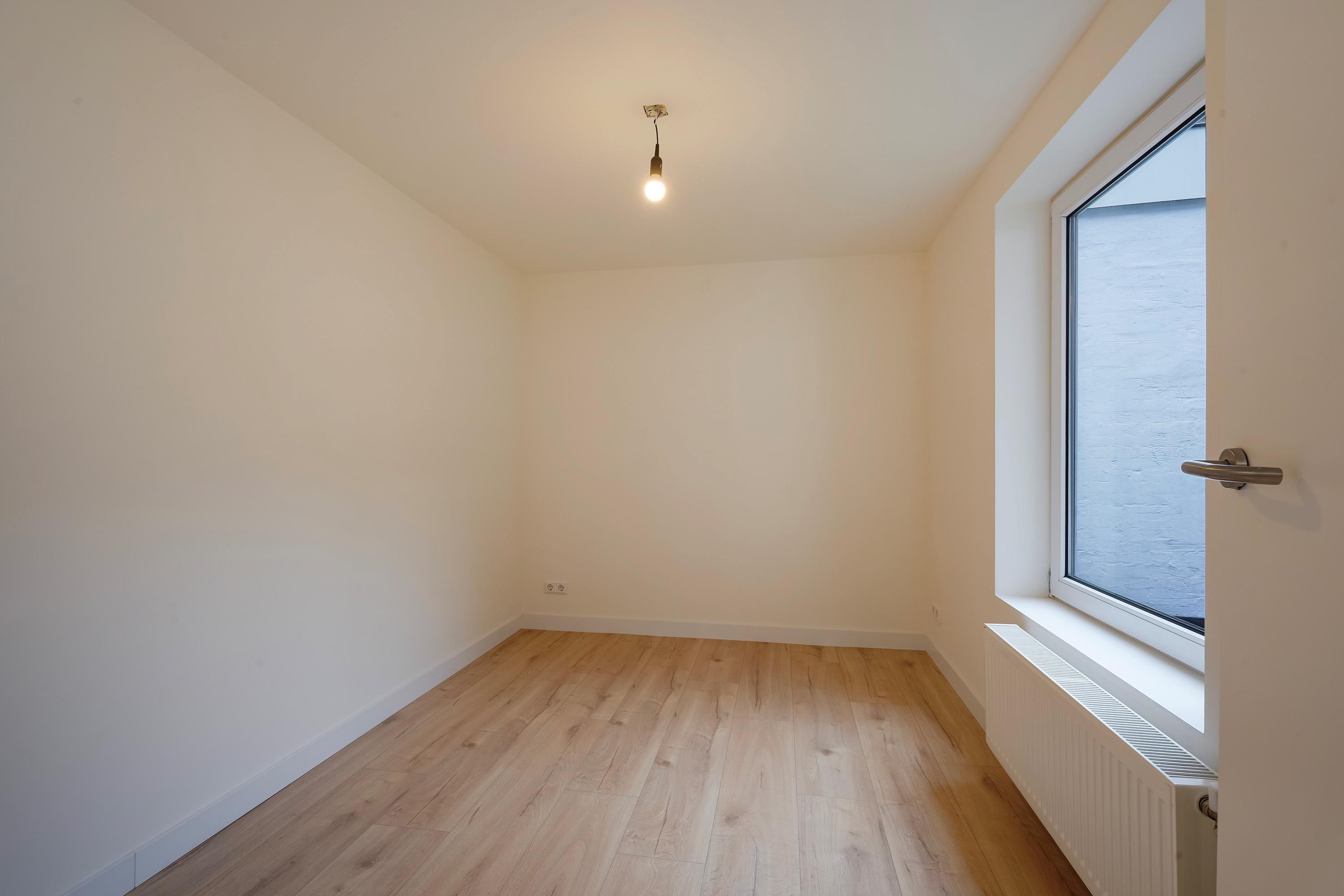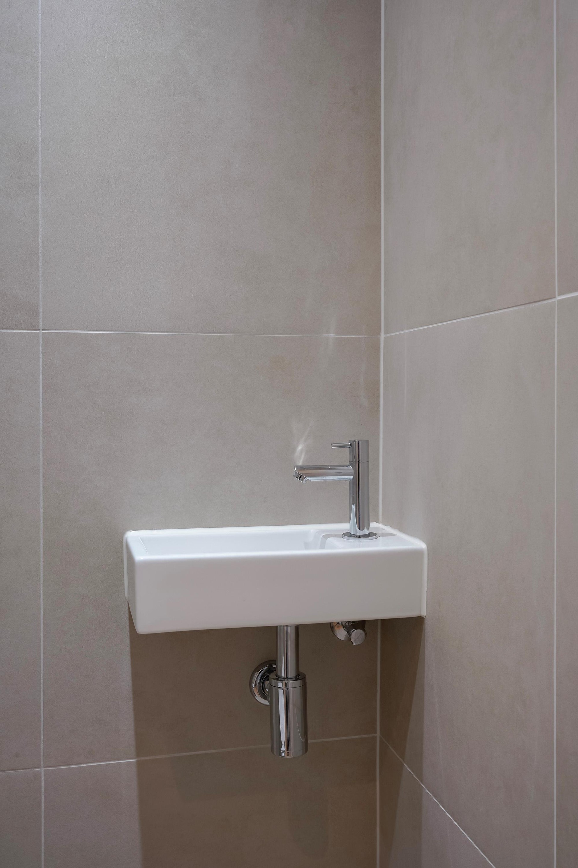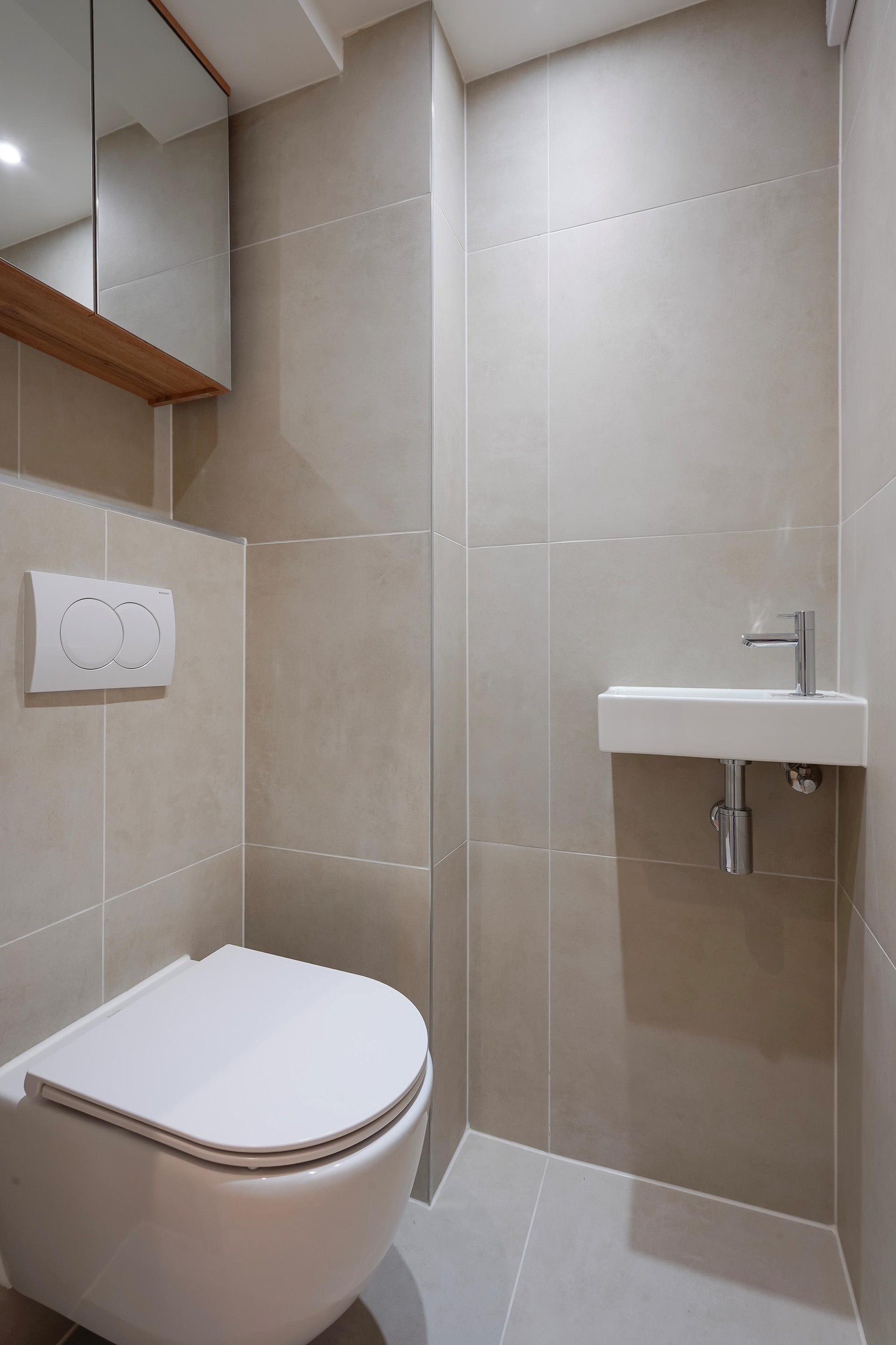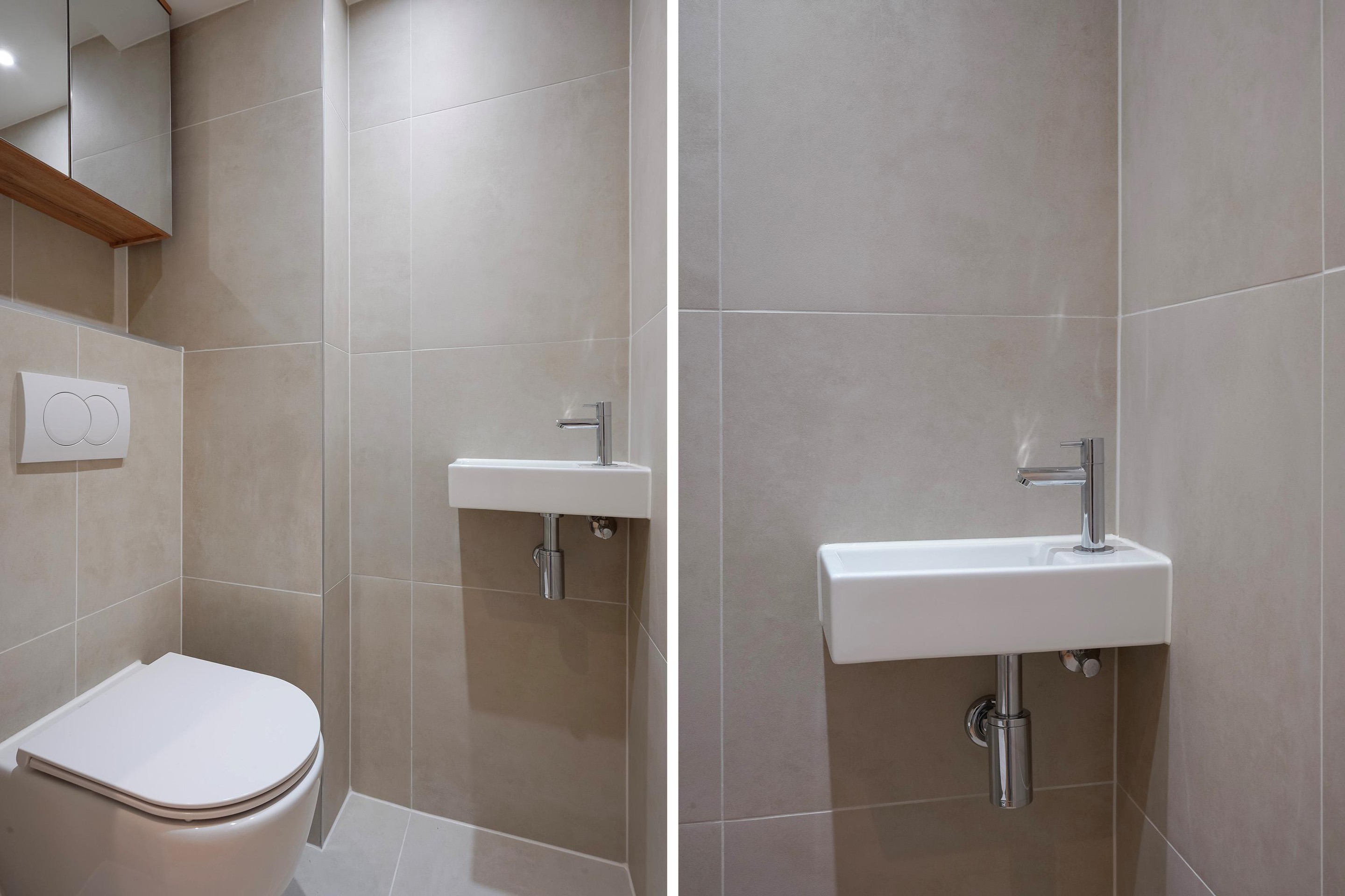 Achter de badkamer bevindt zich de 1e slaapkamer en er tegenover is er een separate, modern volledig betegeld toilet met fonteintje en mechanische ventilatie.