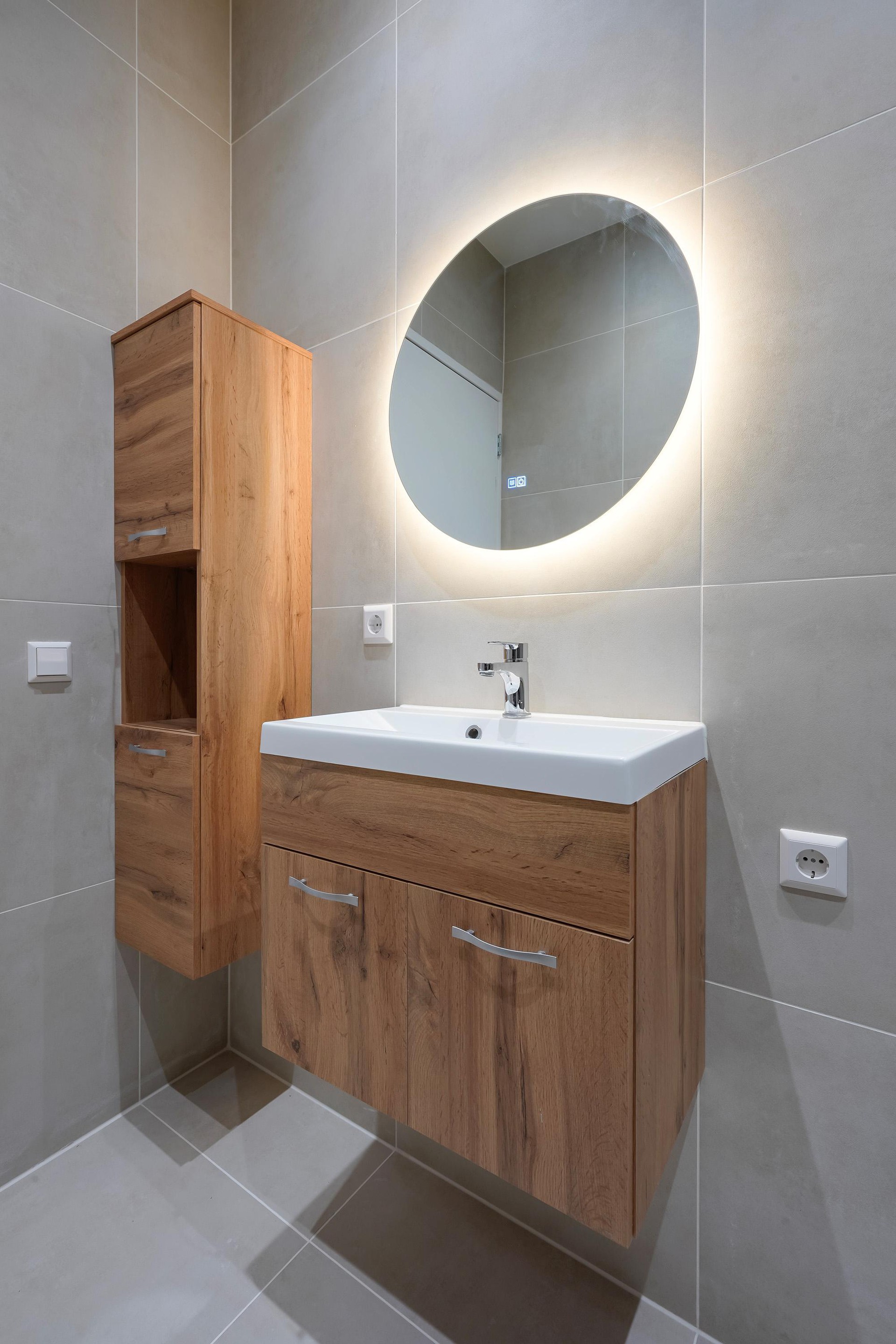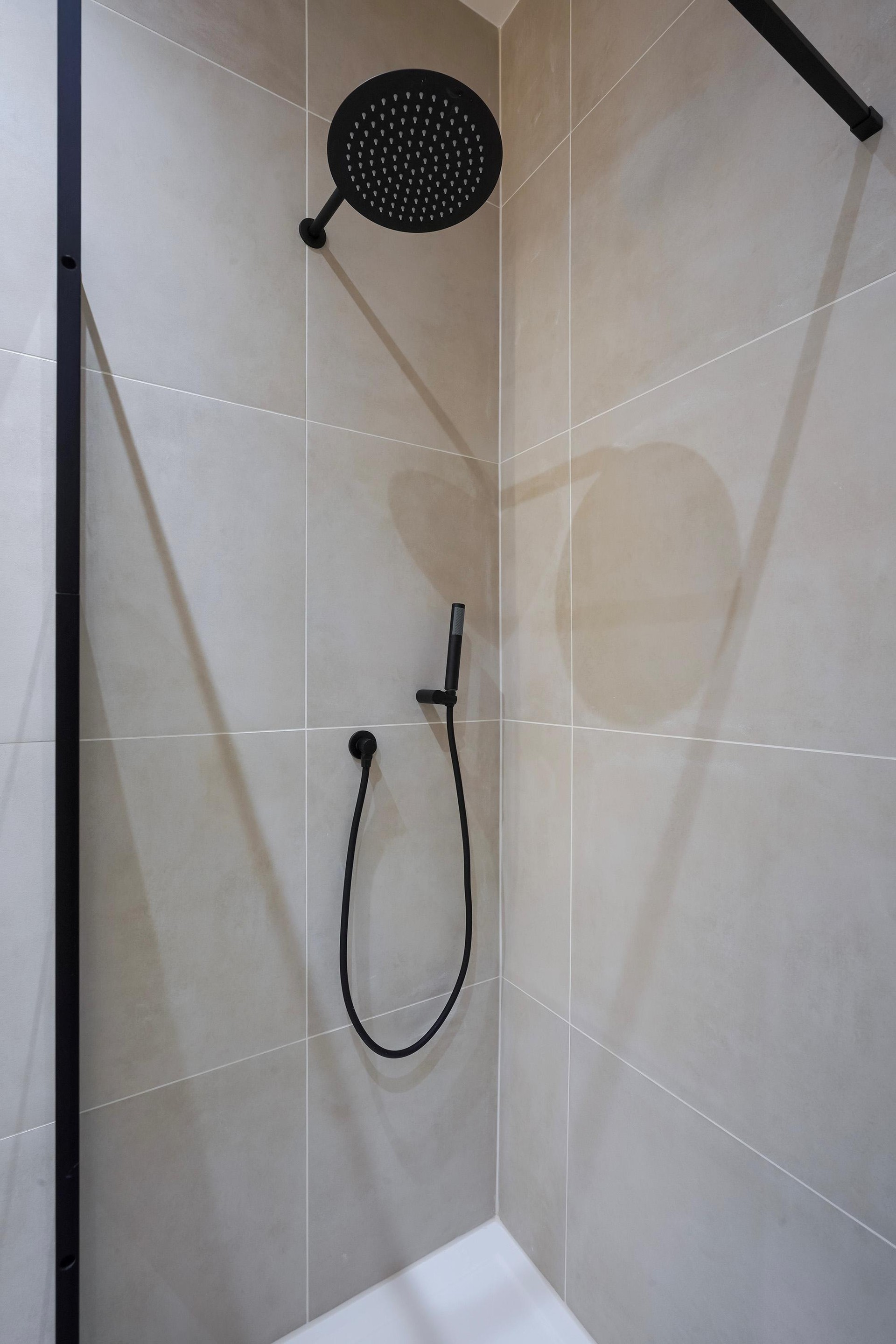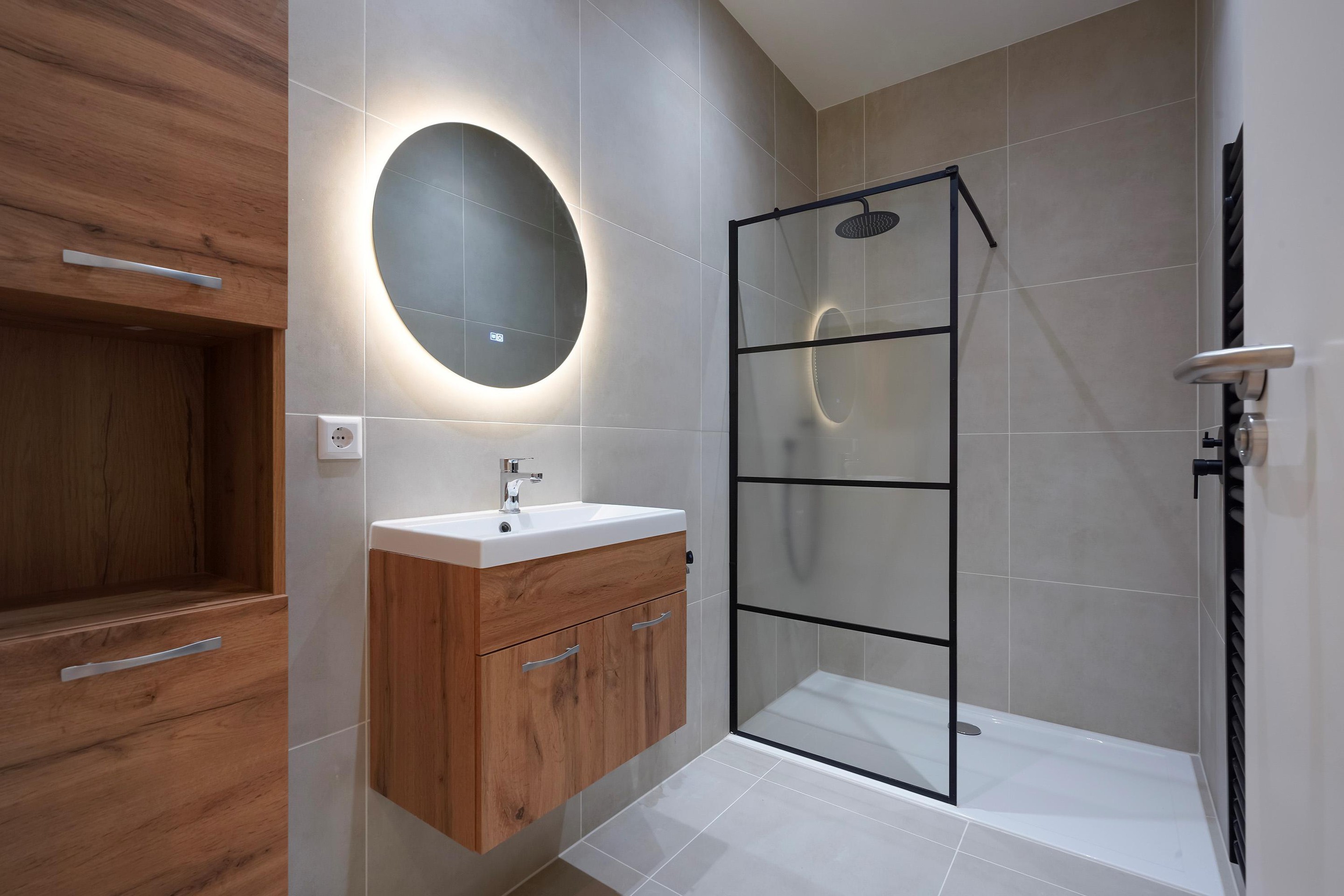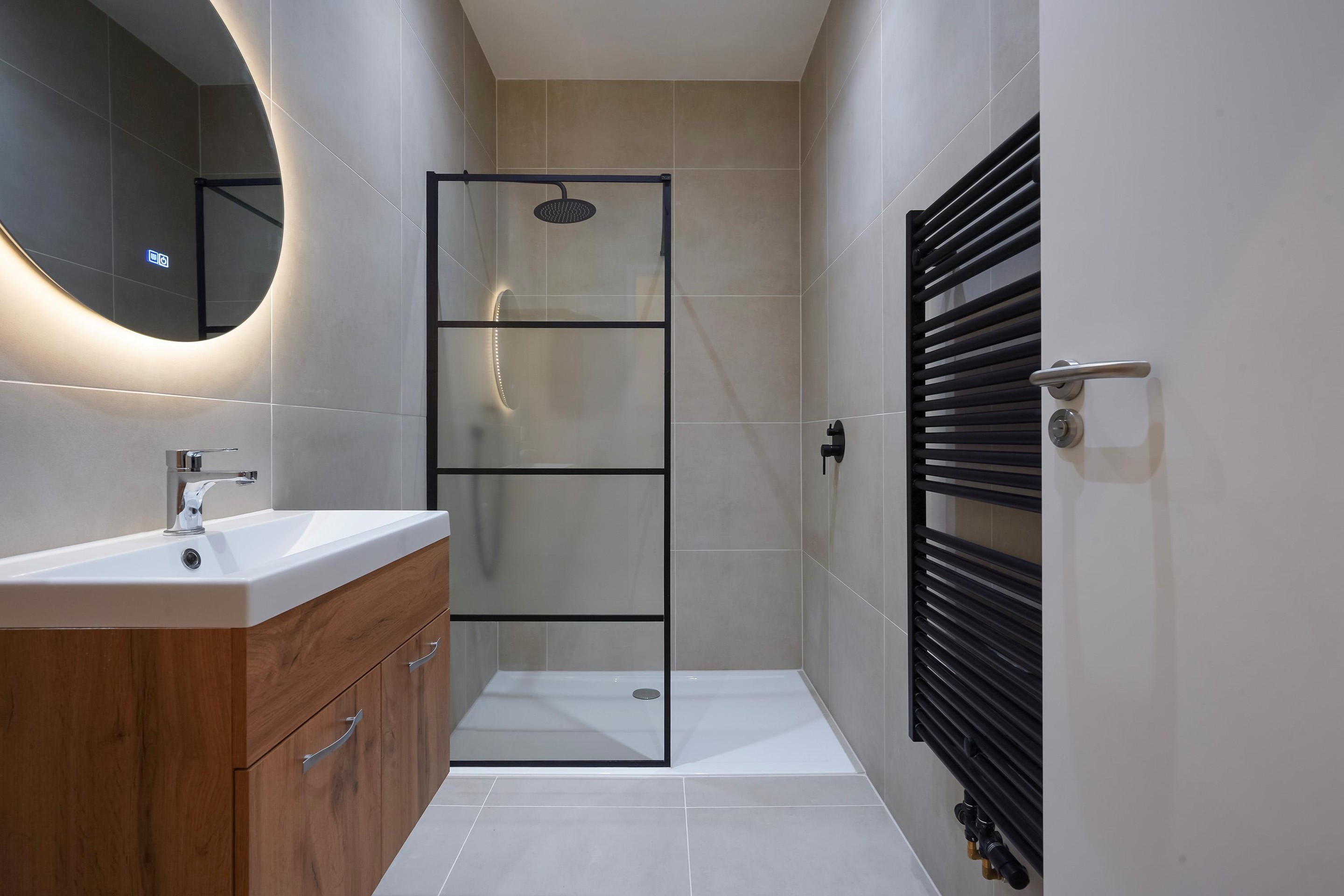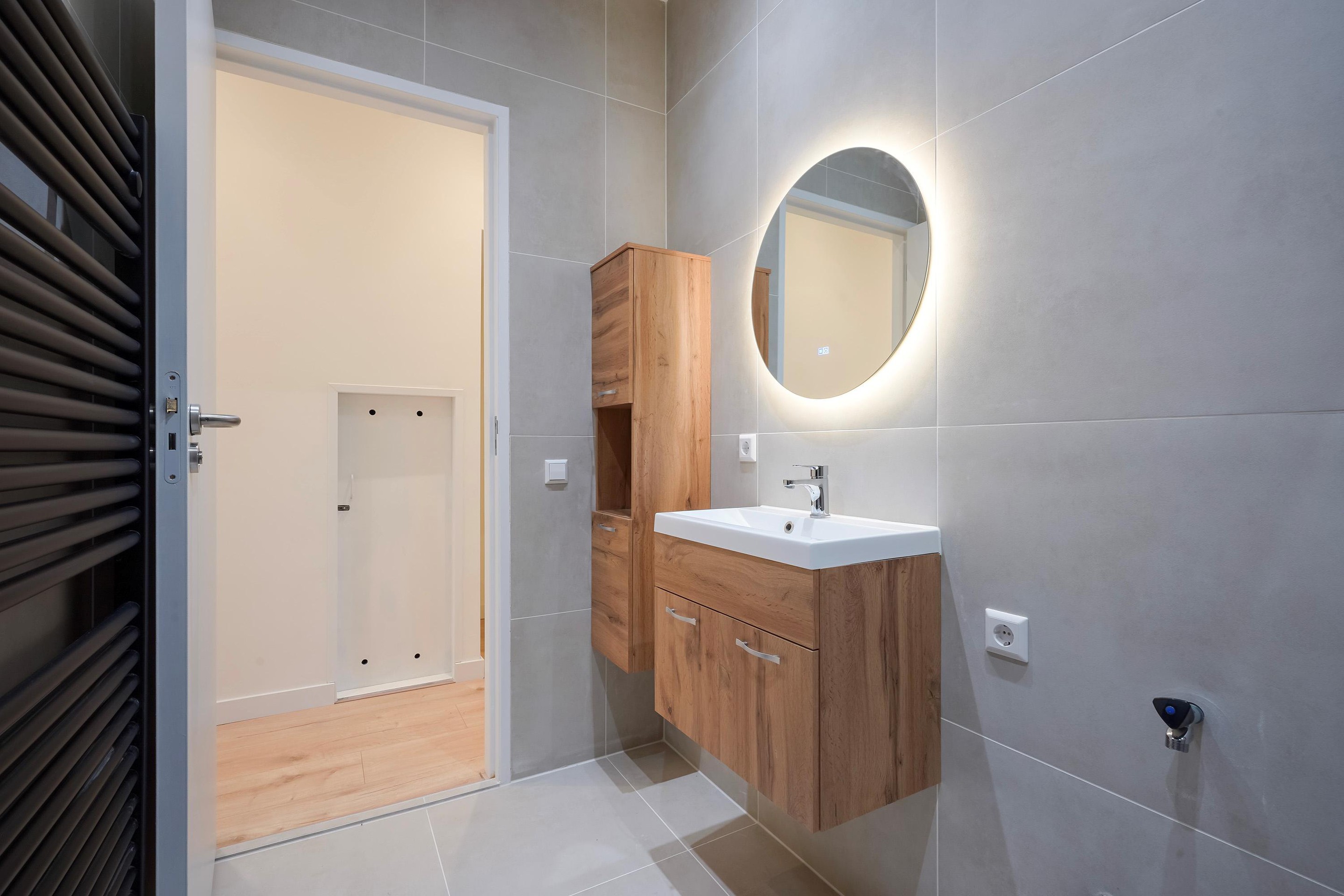 Aansluitend bevindt zich de vernieuwde badkamer, modern afgewerkt en voorzien van een ruime inloop-(regen)douche met spatscherm, een wastafelmeubel met verlichte spiegel, een praktische badkamerkast, handdoekradiator en inbouwspots.