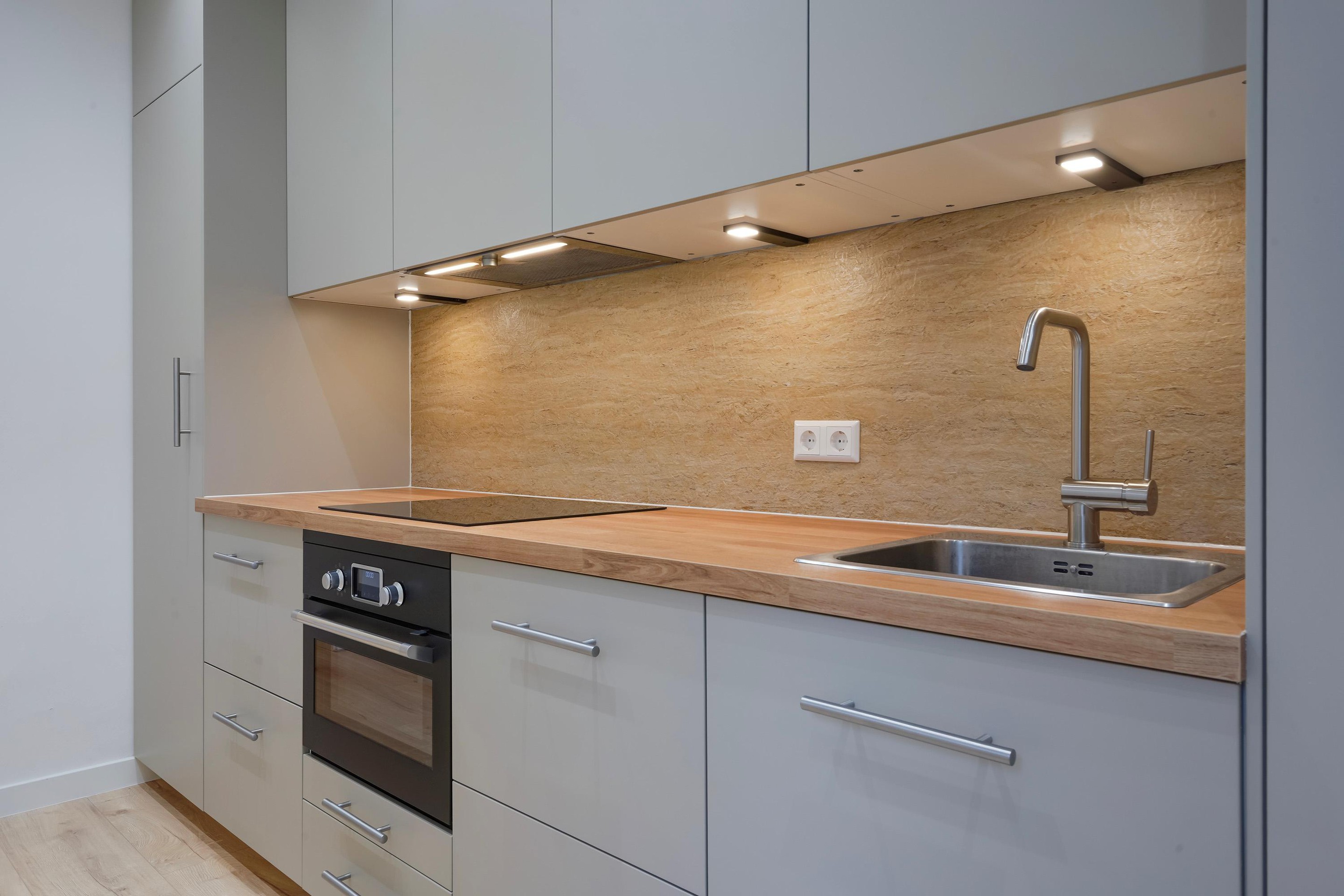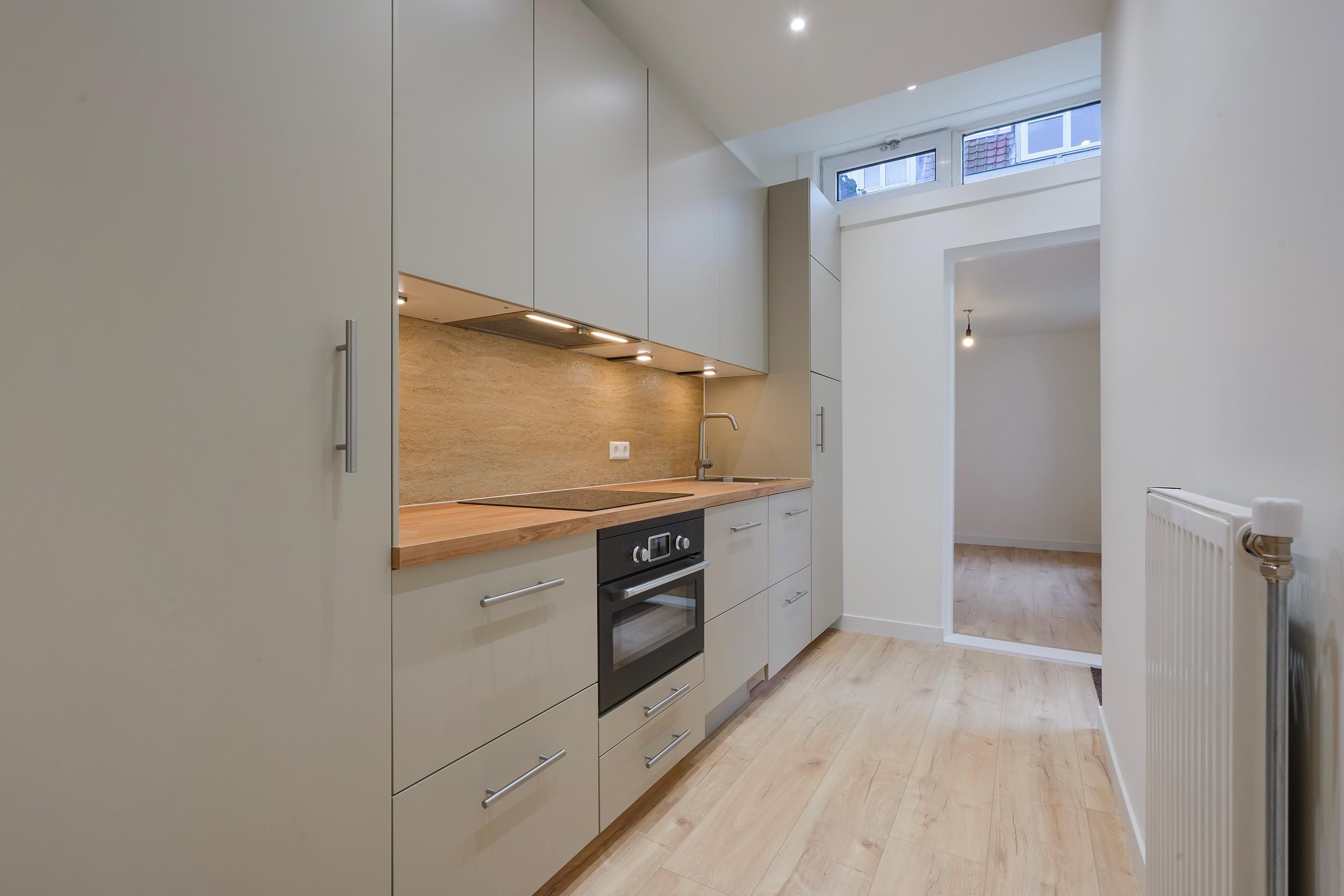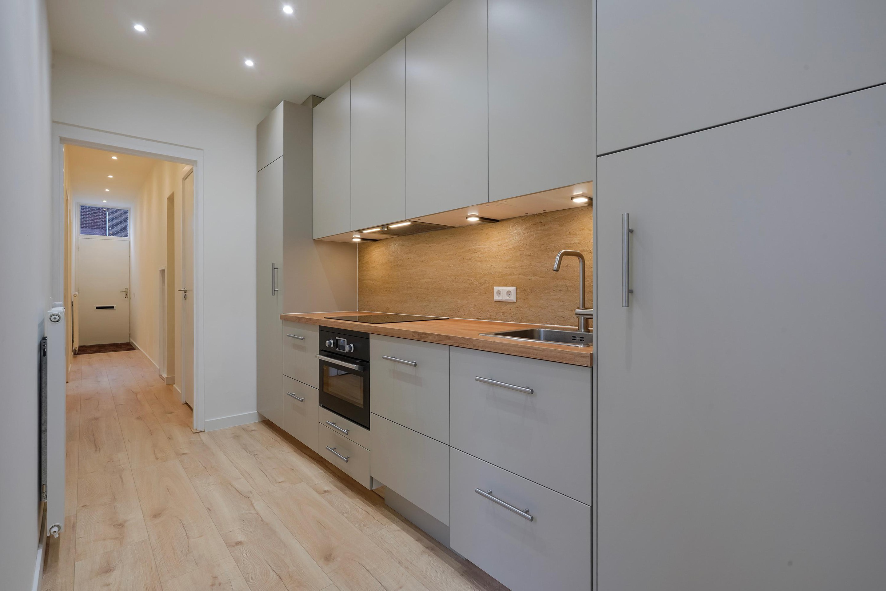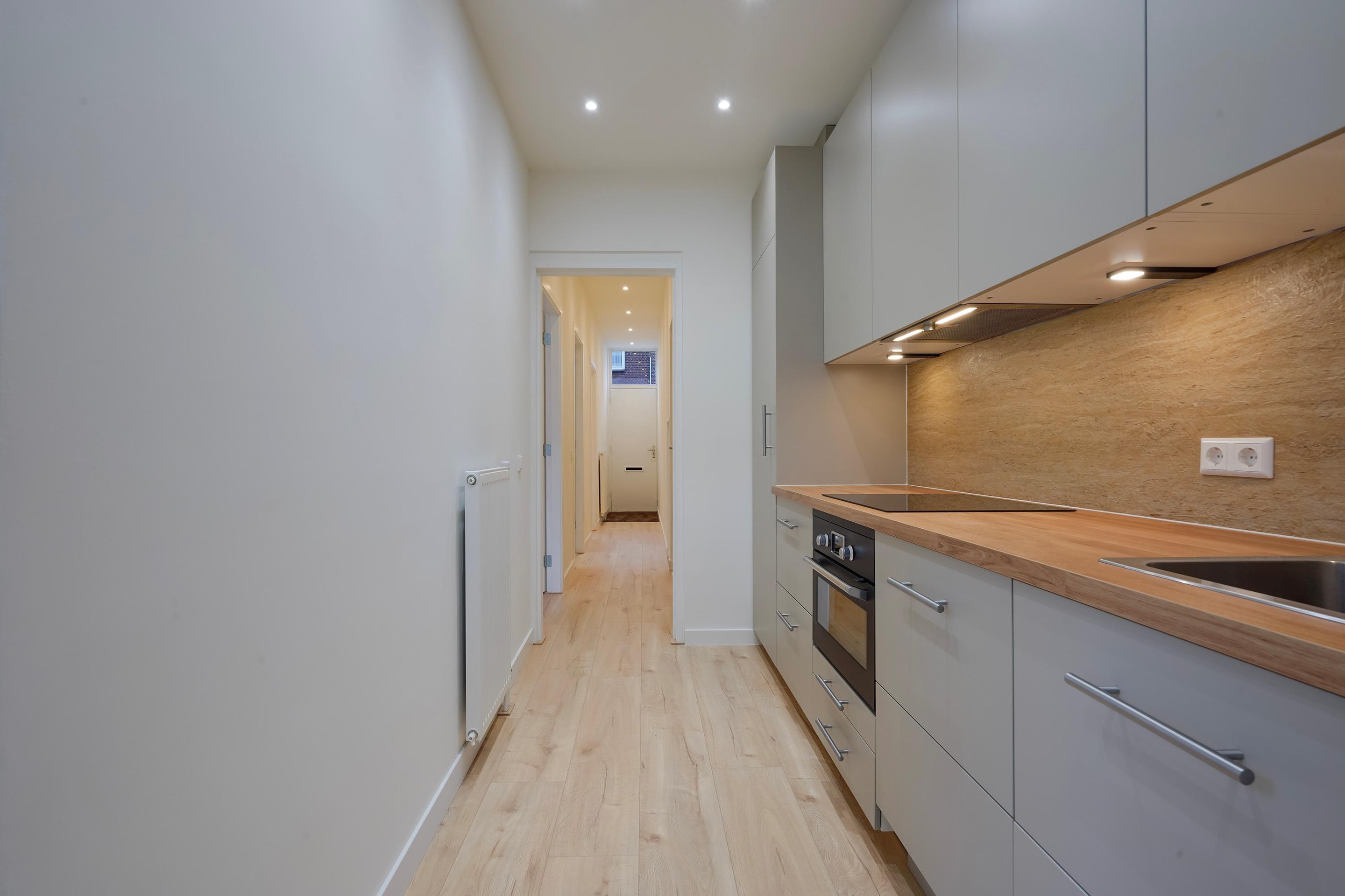 De route vervolgt zich naar de vernieuwde, moderne keuken. Deze is compleet uitgerust met een inductiekookplaat, oven, onderbouw afzuigkap, vaatwasser en een koelkast met vriesvak. Tevens zijn hier de cv-combiketel opstelling en inbouwspots aanwezig.