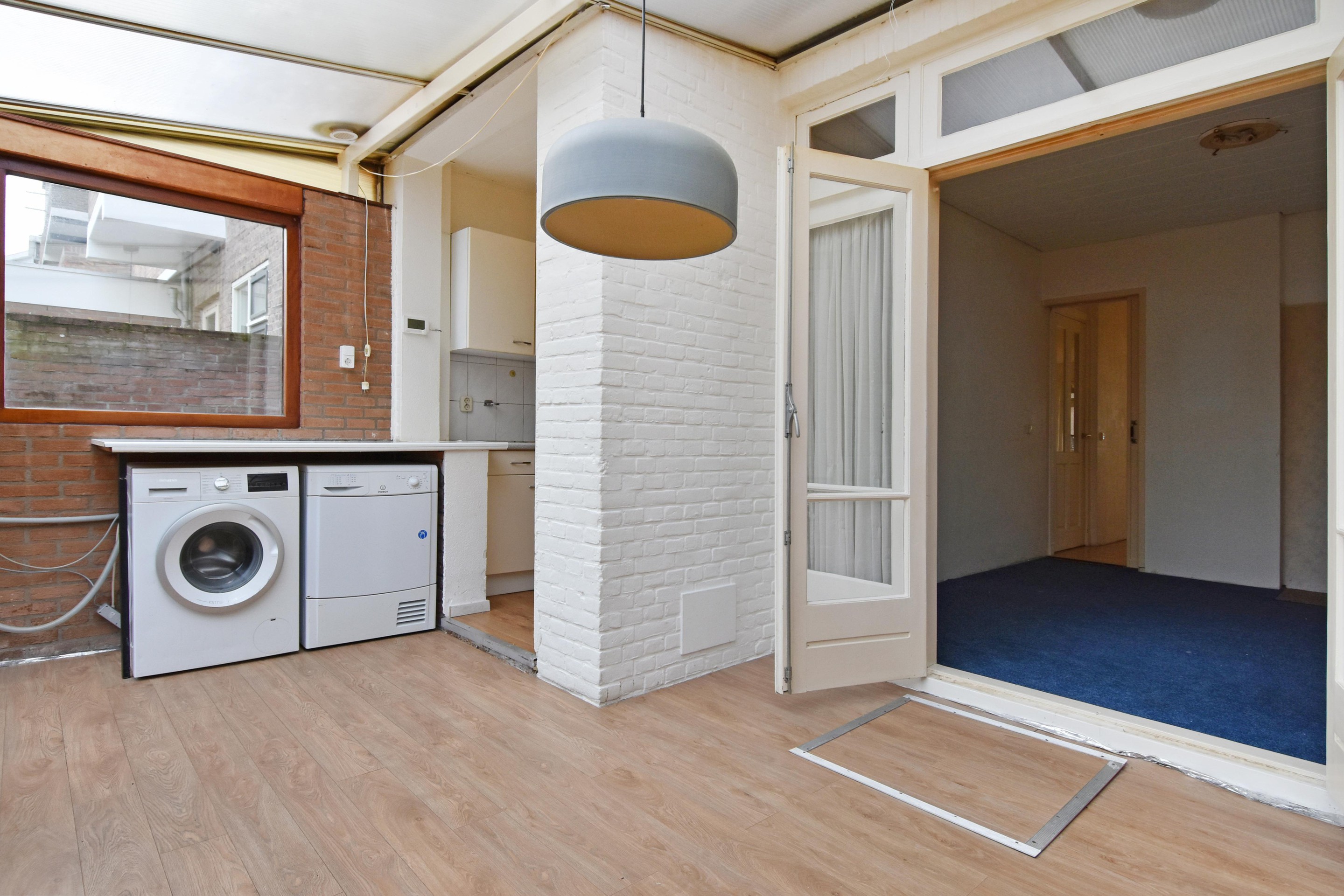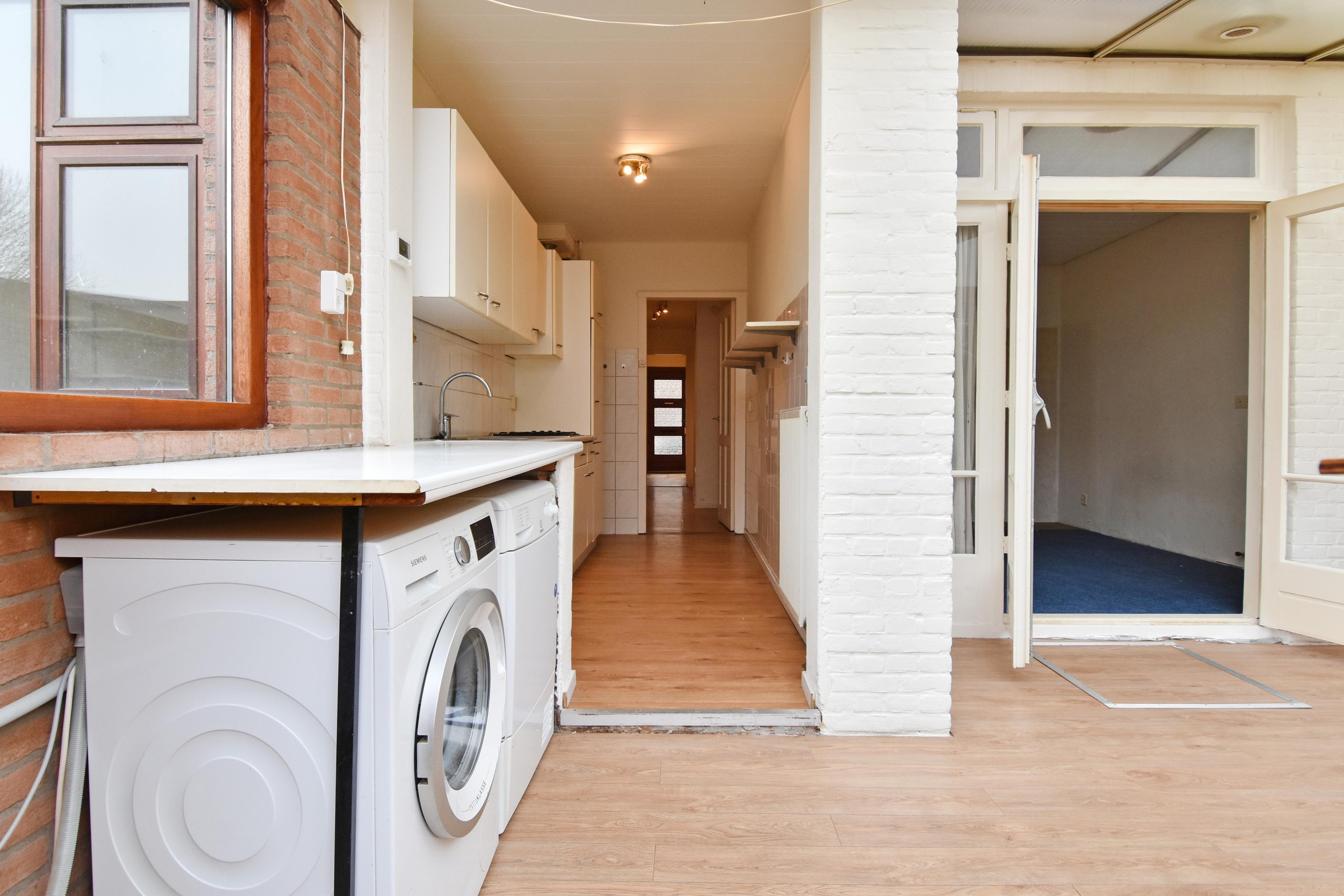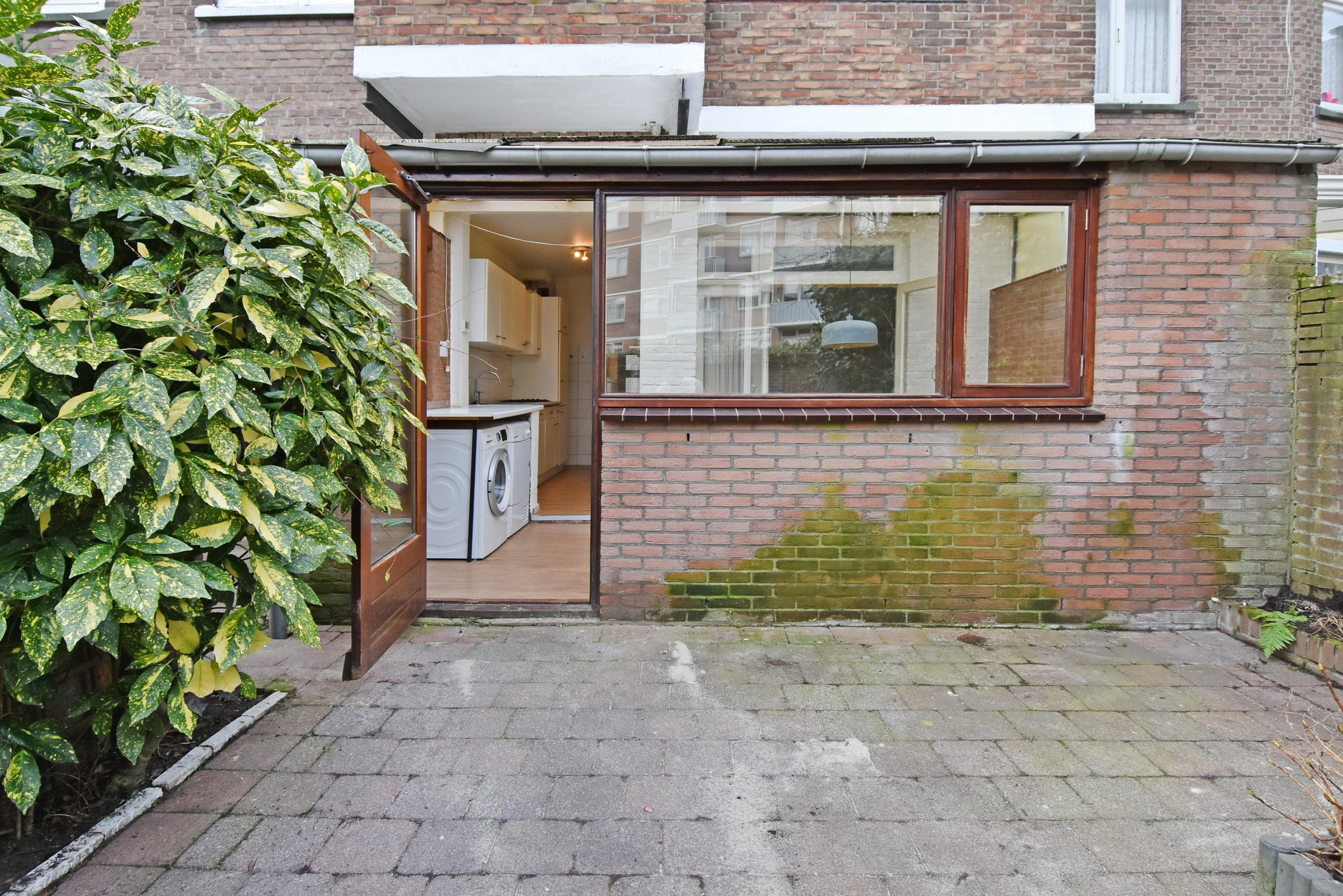 De gemetselde uitbouw aan de achterzijde is voorzien van een golfplaten dak en biedt plaats aan de wasmachine en droger.