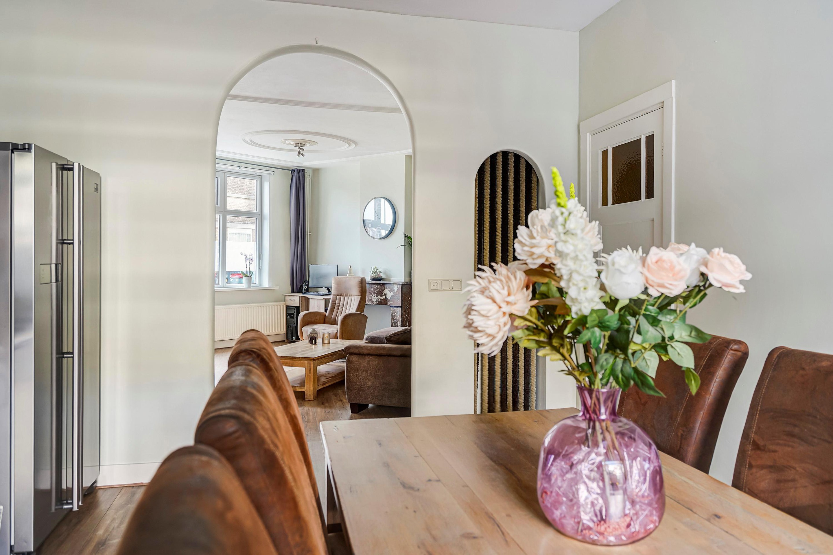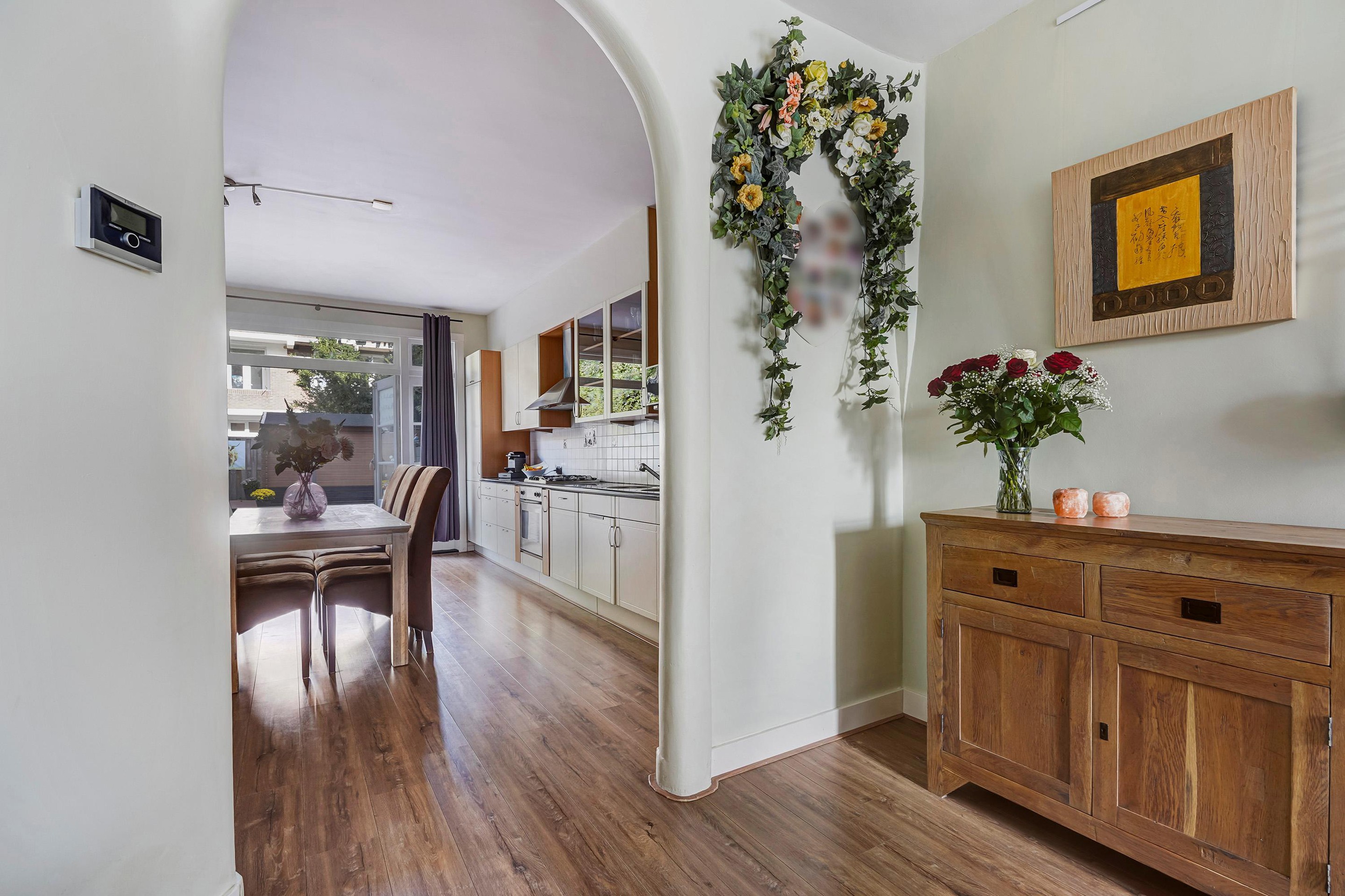 Entree woning, tochtportaal welke toegang geeft tot de ruime hal. De hal is v.v. toilet (hangend), berging alwaar opstelplaats cv-combi ketel (Vaillant, bouwjaar 2021) en tweede berging alwaar wasmachineaansluiting en meterkast. Vanuit de hal toegang tot de ruime woonkamer met aan de voorzijde een zitkamer en aan de achterzijde een open keuken met eetkamer. De keuken is v.v. 4 pits gaskookplaat, afzuigkap, oven, dubbele spoelbak, vaatwasser en Amerikaanse koelkast. Vanuit de achterkamer eveneens toegang tot de riante en zeer zonnige achtertuin met tuinhuis en voldoende ruimte (door de semi hoekligging). De eerste slaapkamer is aan de achterzijde gelegen en er zijn 2 slaapkamers aan de voorzijde (de ouder slaapkamer en kastenkamer)