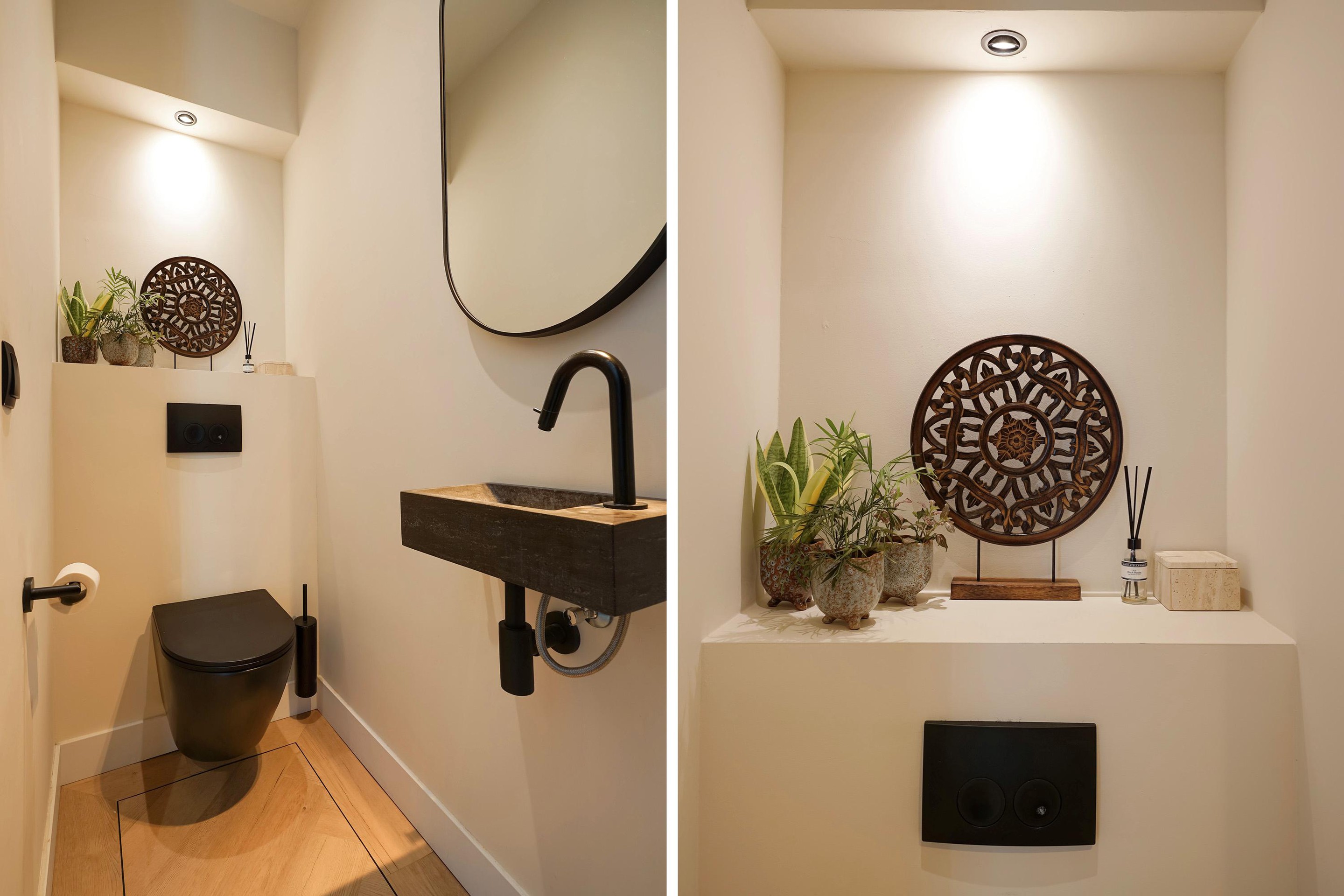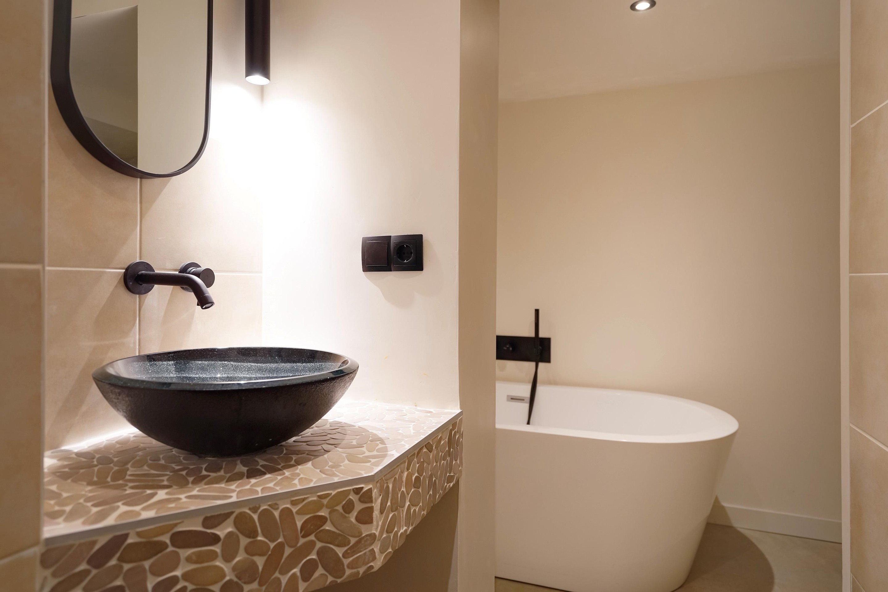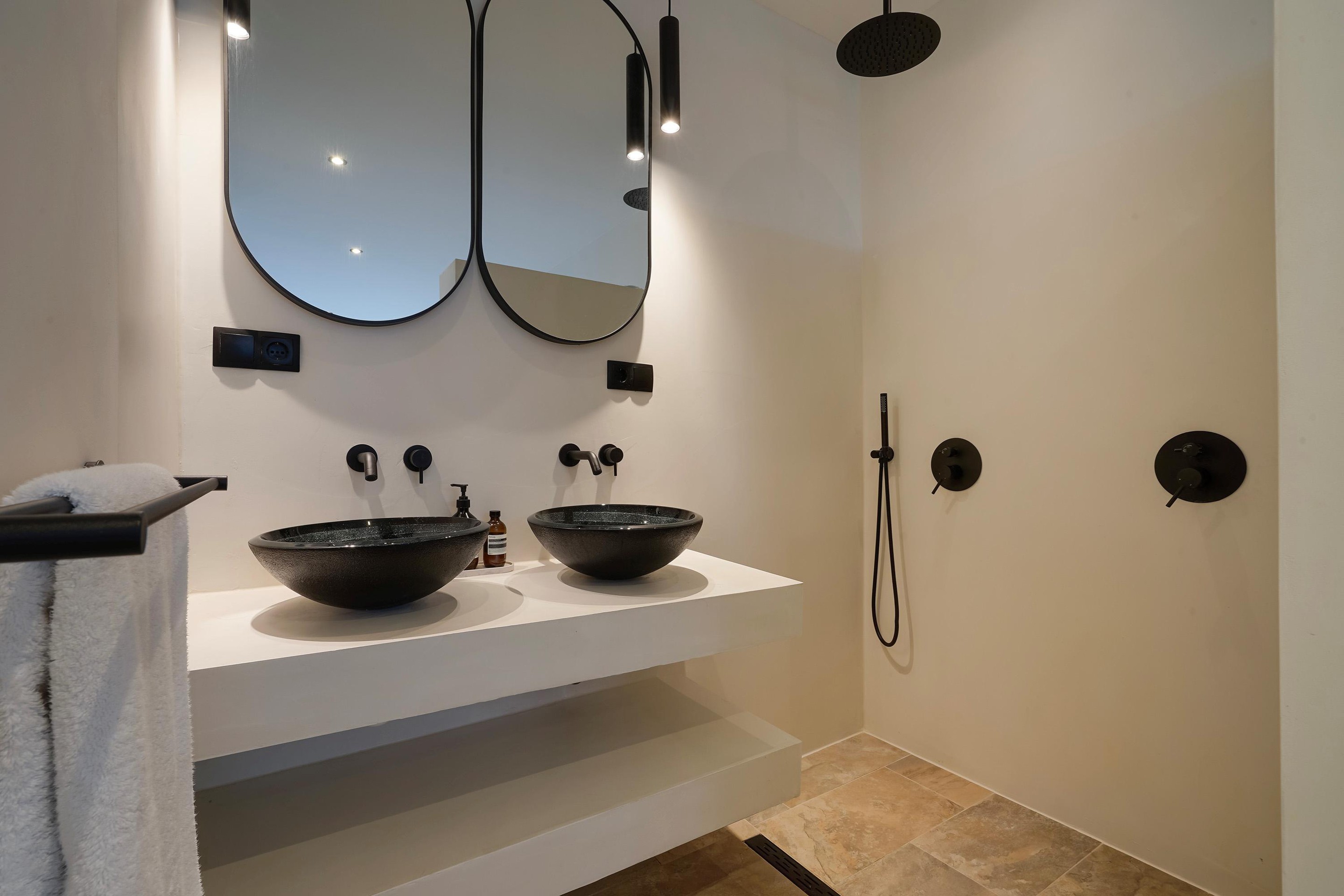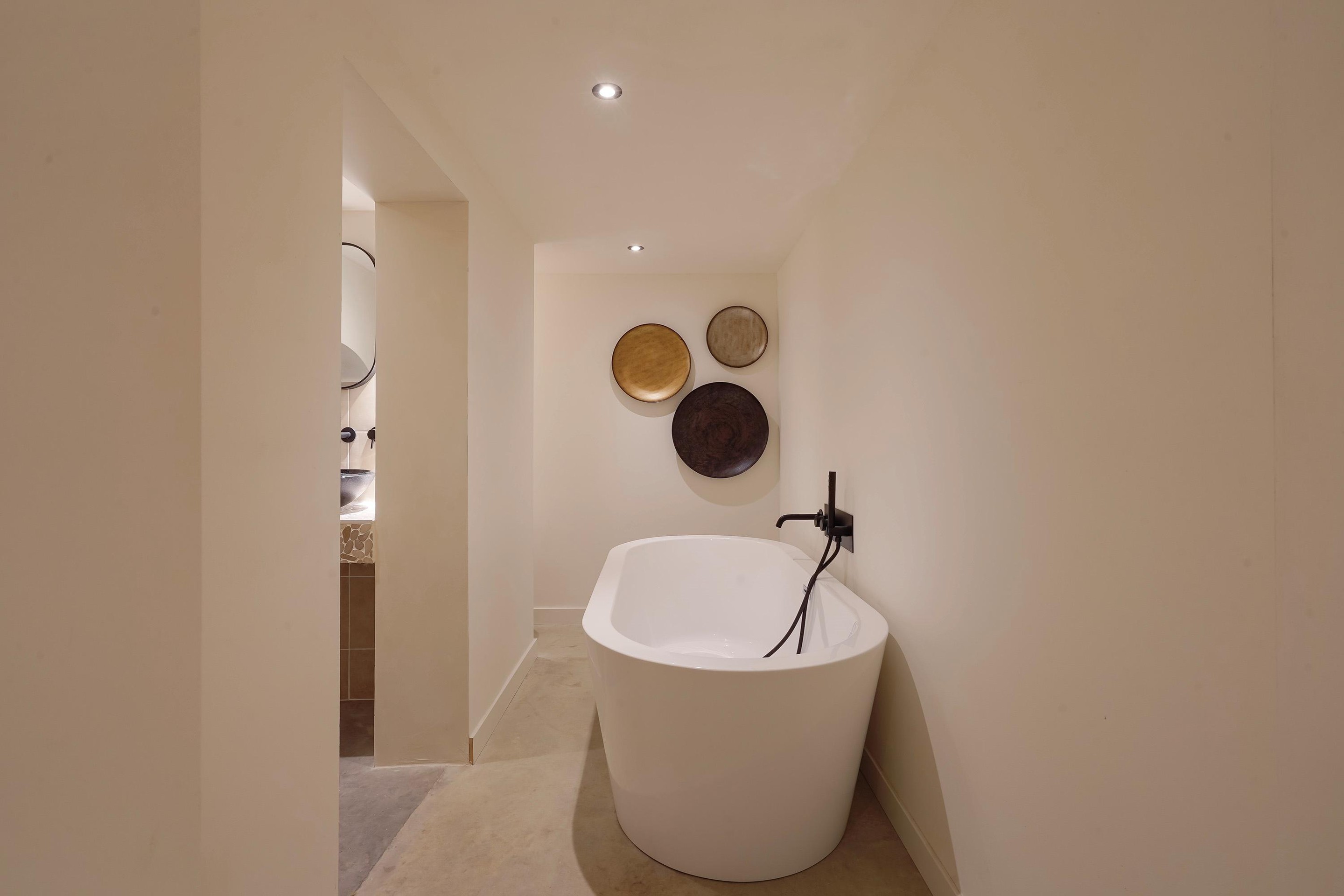 Aan de achterzijde van de woning is de badkamer en suite gesitueerd. Er is een bad geplaatst, een dubbele regendouche en een dubbele wastafel met meubel. Vanaf deze suite heb je ook toegang tot een inloopkast.