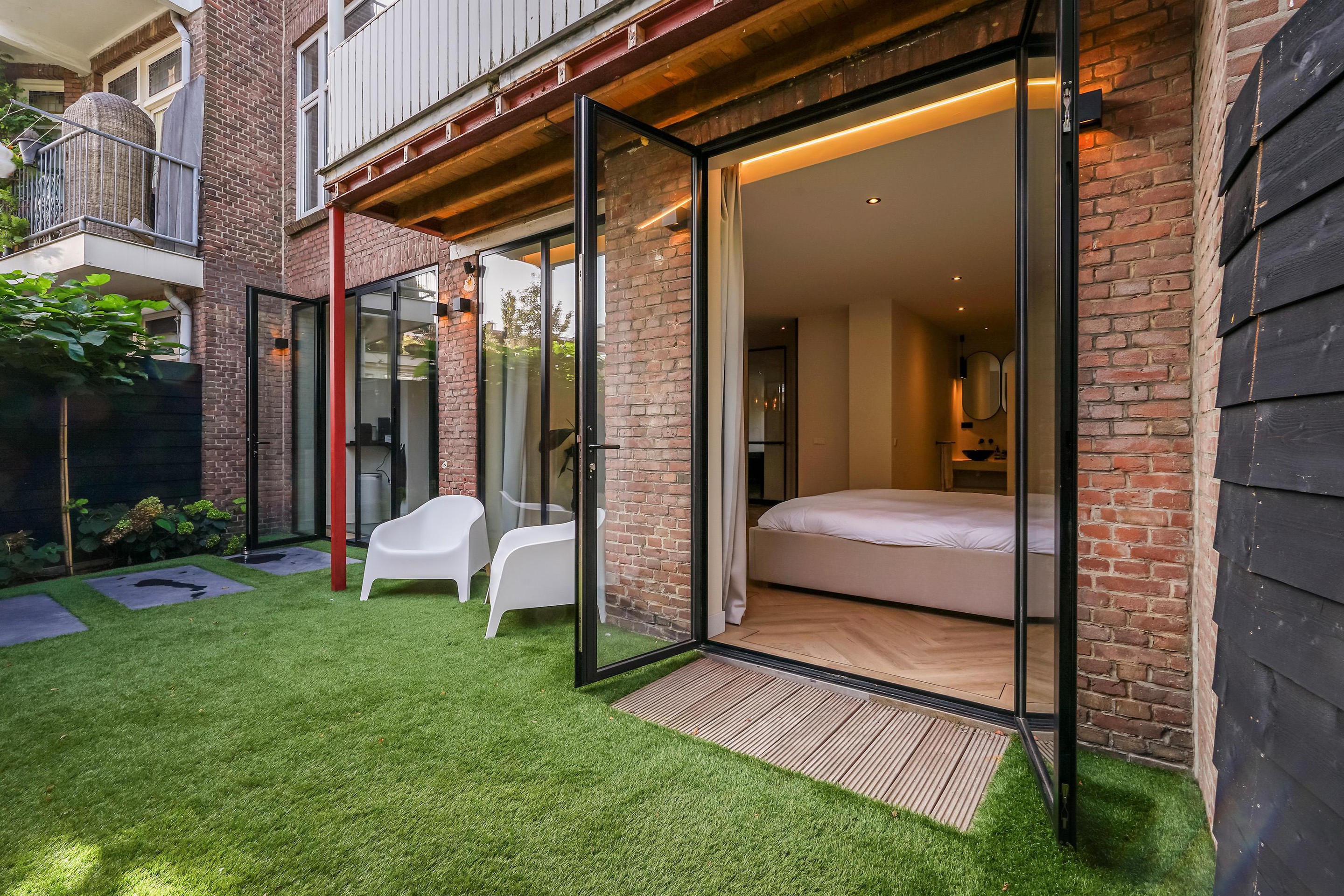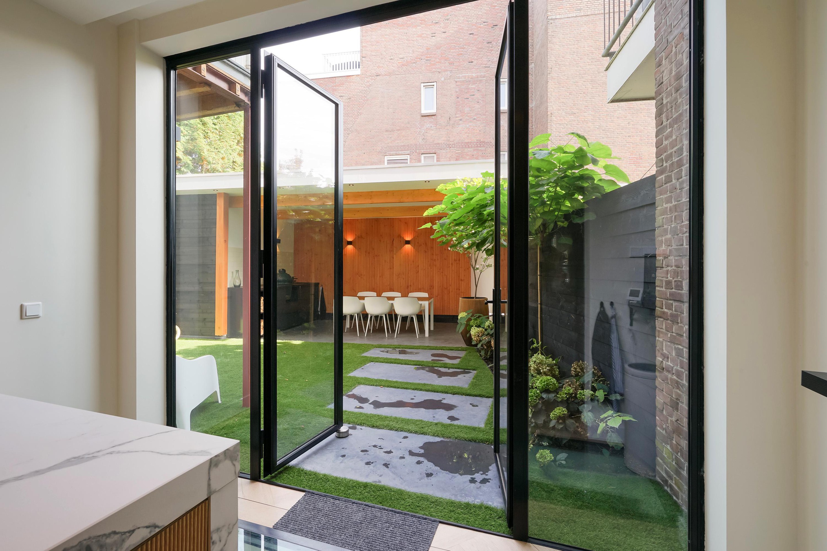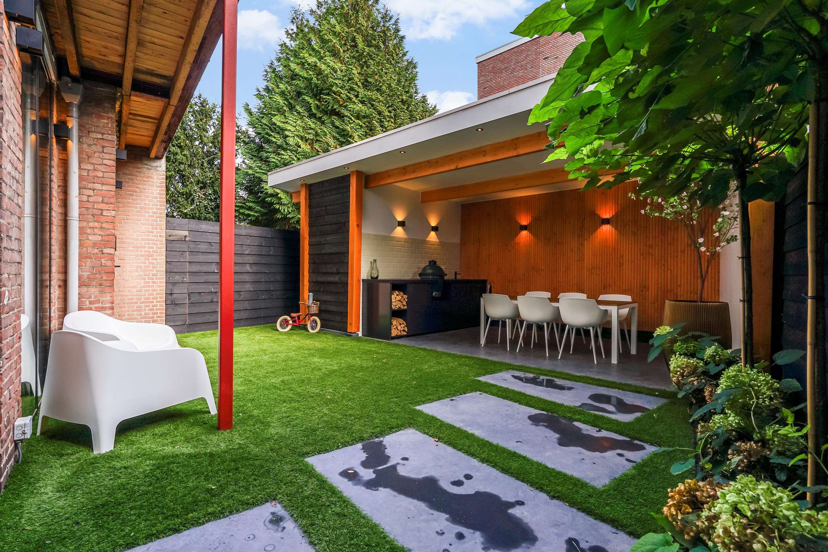 The garden was completely renovated in the spring of 2024, including artificial grass and a beautiful covered patio. A storage shed is located at the back of the garden, and part of the heat pump is located next to the shed.