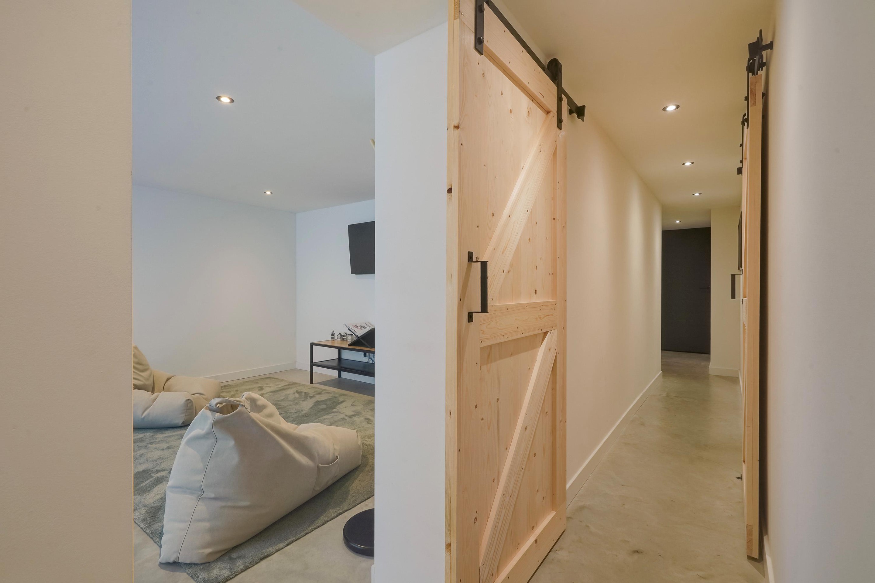 Vanuit de keuken/eetkamer is er toegang tot de gang middels 2 stalen taatsdeuren. Vanuit de hal is er toegang tot de kinderslaapkamer, aan de voorzijde van de woning. Vanuit de hal is er ook toegang tot de meterkast. Hier zijn 21 groepen aangelegd, waarvan er momenteel 16 in gebruik zijn. Ook treffen we een ruime toiletruimte, voorzien van zwevend toilet en wasbak met fontein.