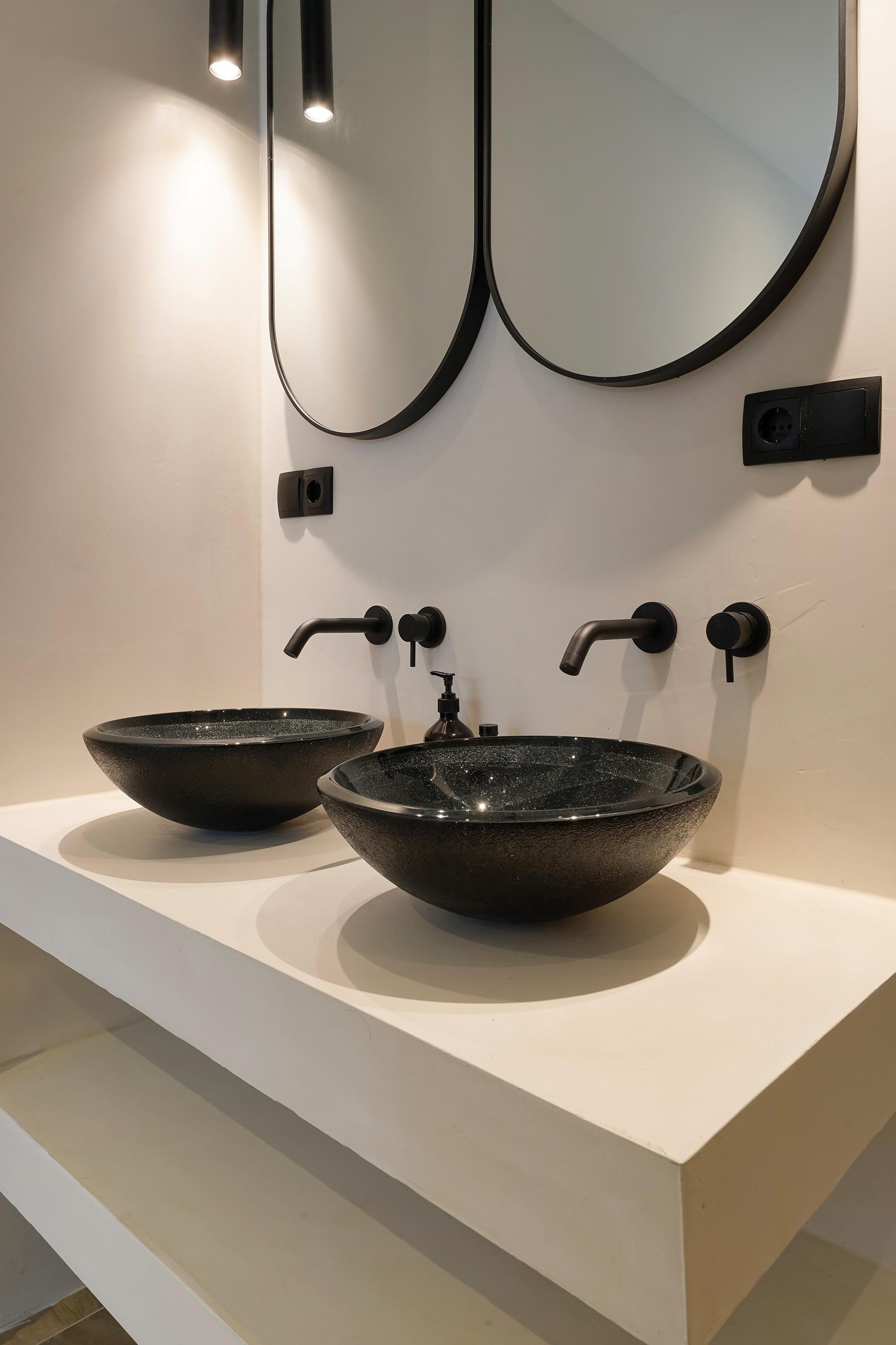 The en-suite bathroom is located at the rear of the house. It features a bathtub, a double rain shower, and a double vanity with vanity. This bathroom also provides access to a walk-in closet.