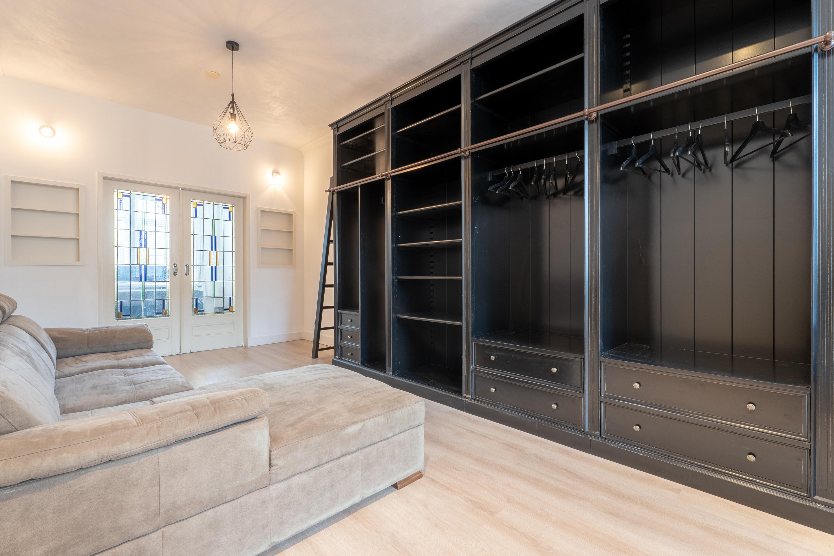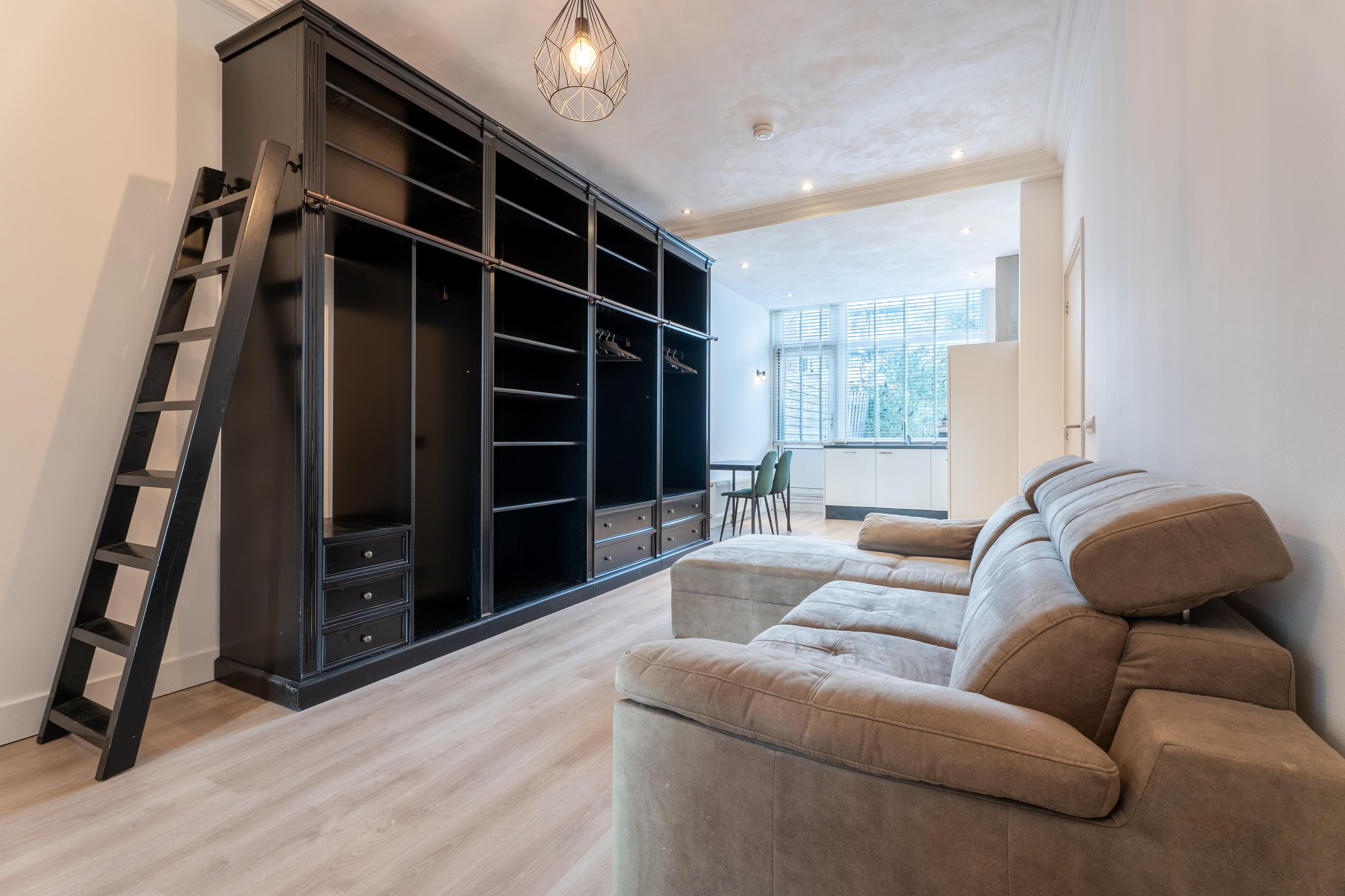 Vanuit de hal heb je toegang tot de woonkamer. De woonkamer is strak afgewerkt met gestucte wanden en voorzien van inbouwspotjes. Dankzij de hoge plafonds voelt de ruimte ruim aan.