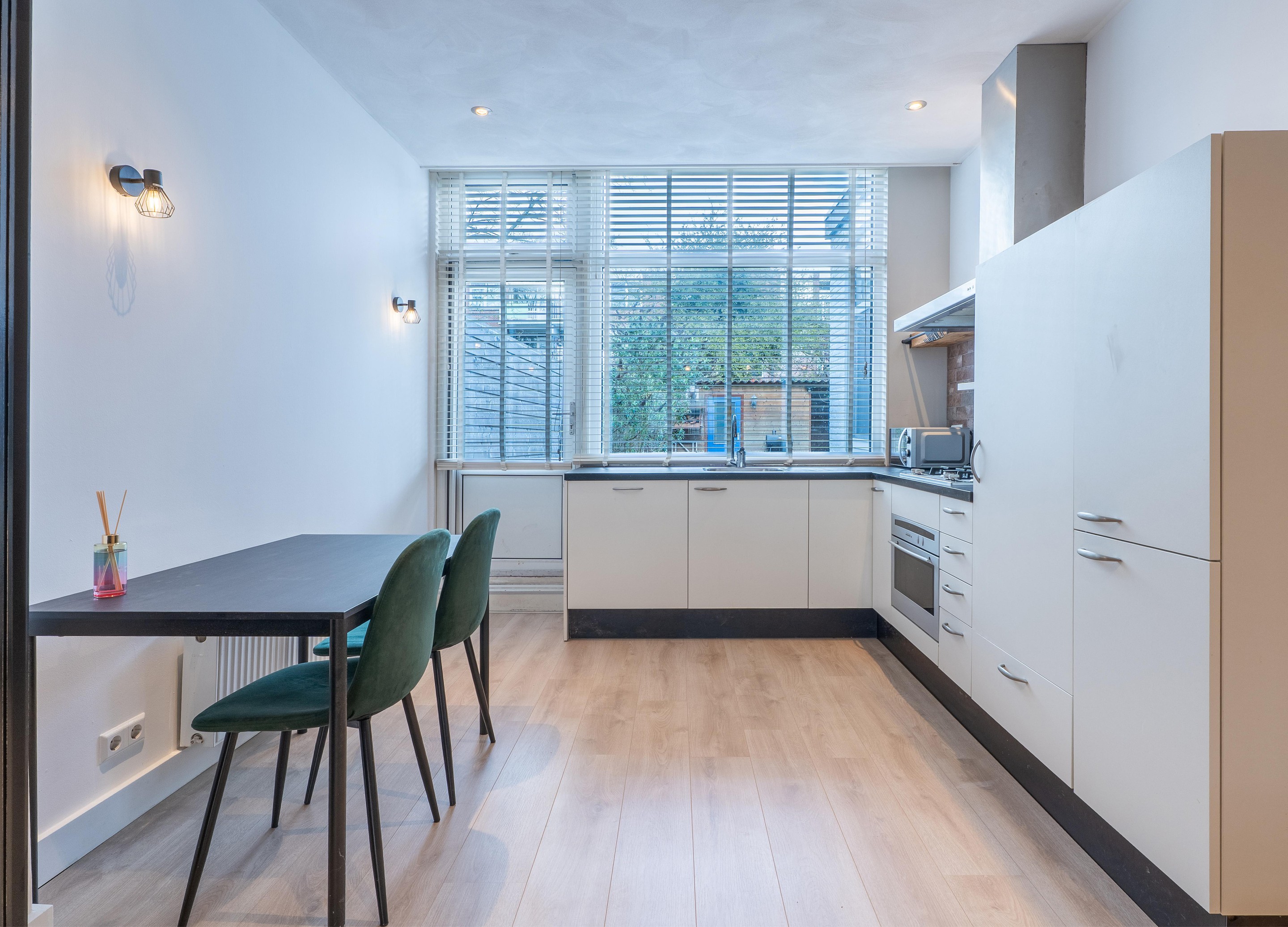 De woonkamer loopt over in de open keuken aan de achterzijde van de woning. De keuken is voorzien van een gasfornuis en diverse inbouwapparatuur en biedt toegang tot de achtertuin.