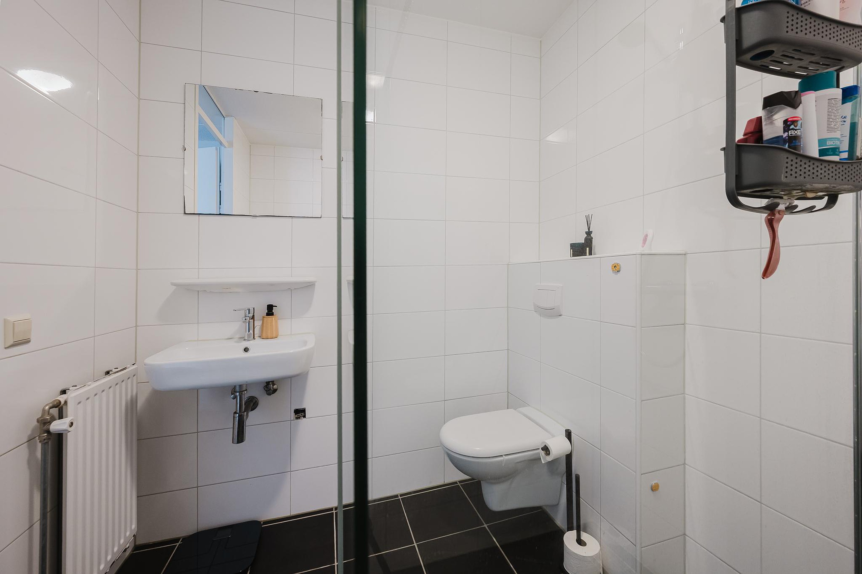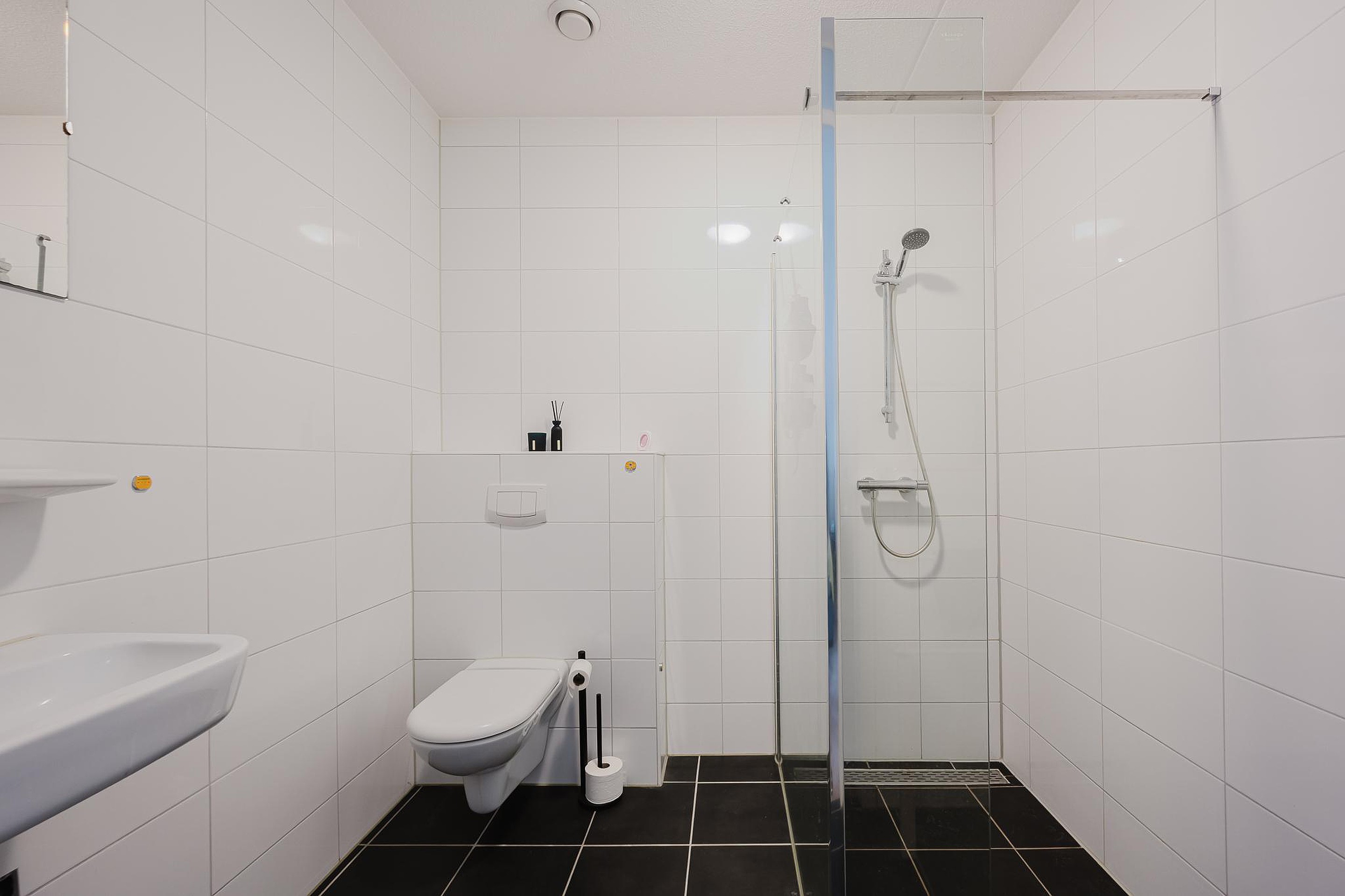 De badkamer is volledig betegeld en is voorzien van een inloopdouche, een wastafel en een toilet.