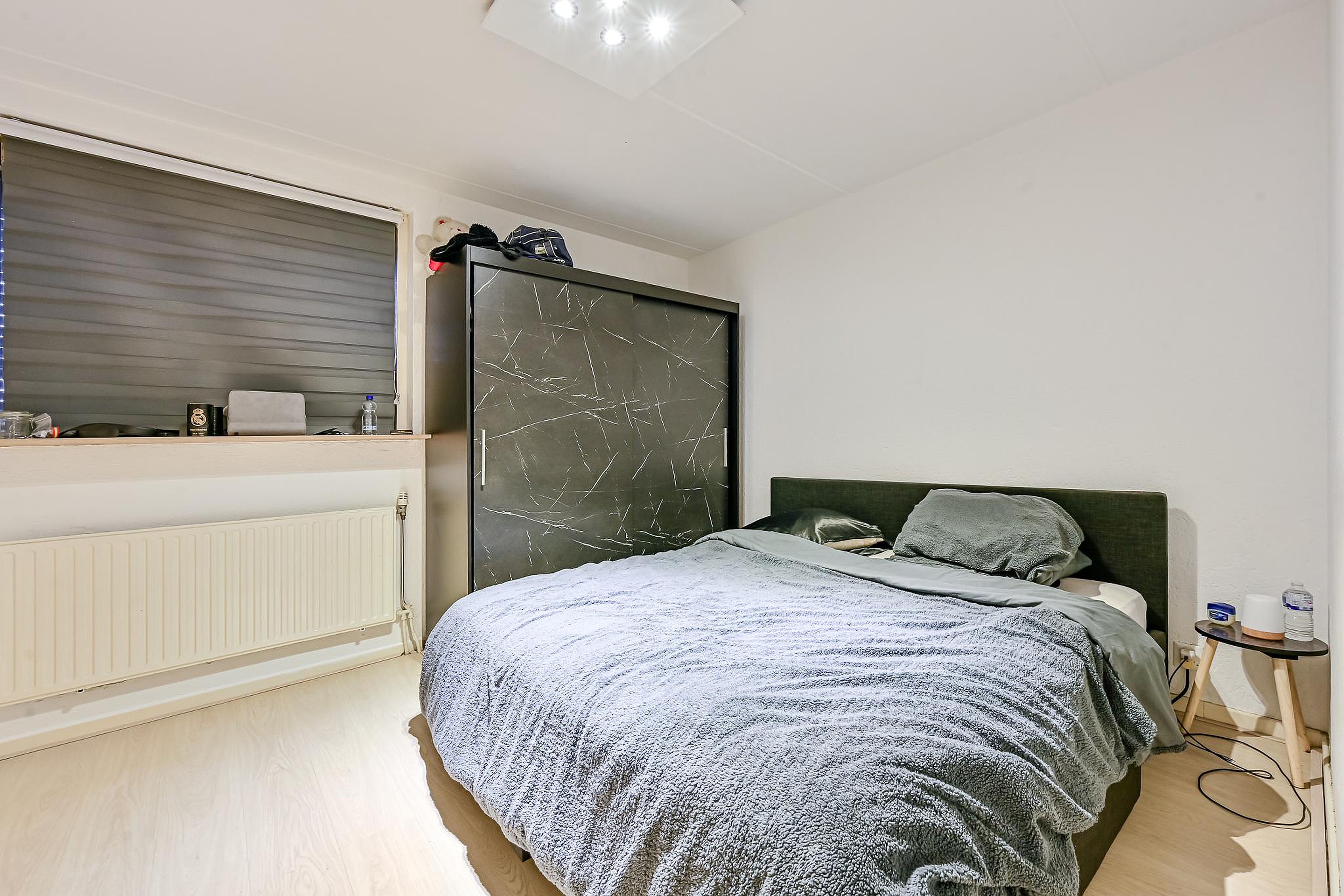 Daarnaast bevindt zich hier de ruime slaapkamer, gelegen aan de voorzijde van de woning en voorzien van een raam met rolluik.