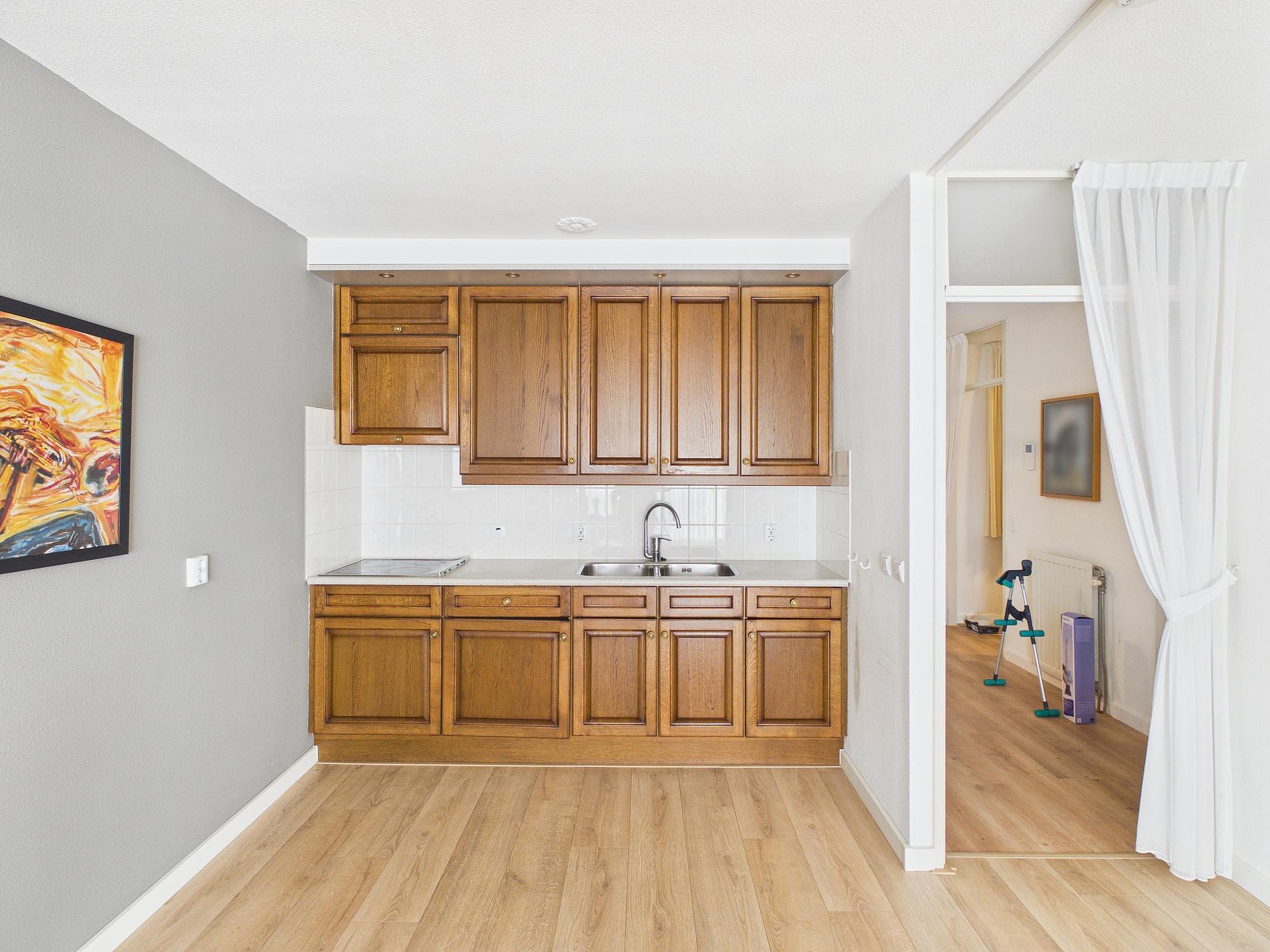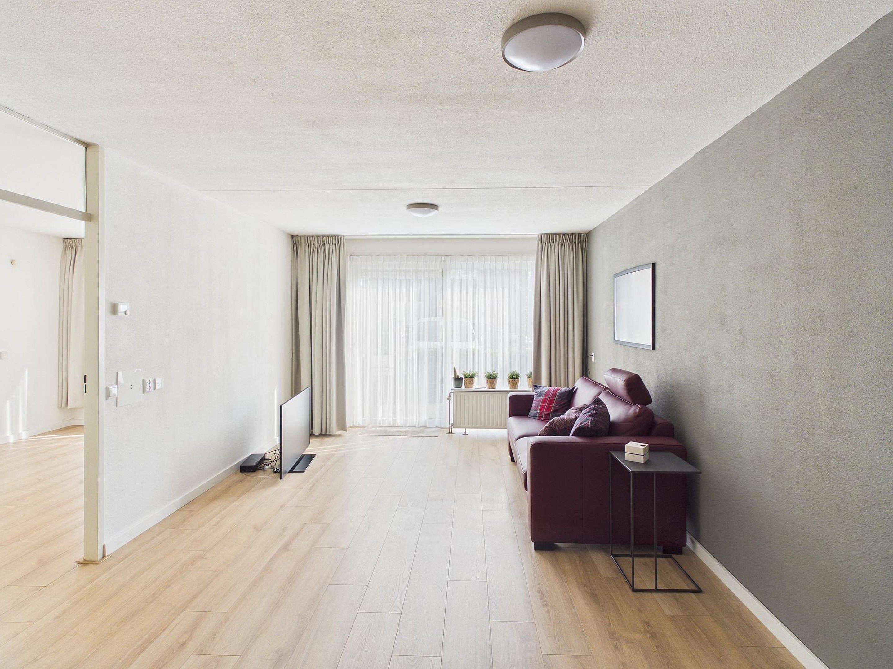 Ruime lichte woonkamer met open keuken en schuifpui naar de tuin aan de voorkant van het appartement.