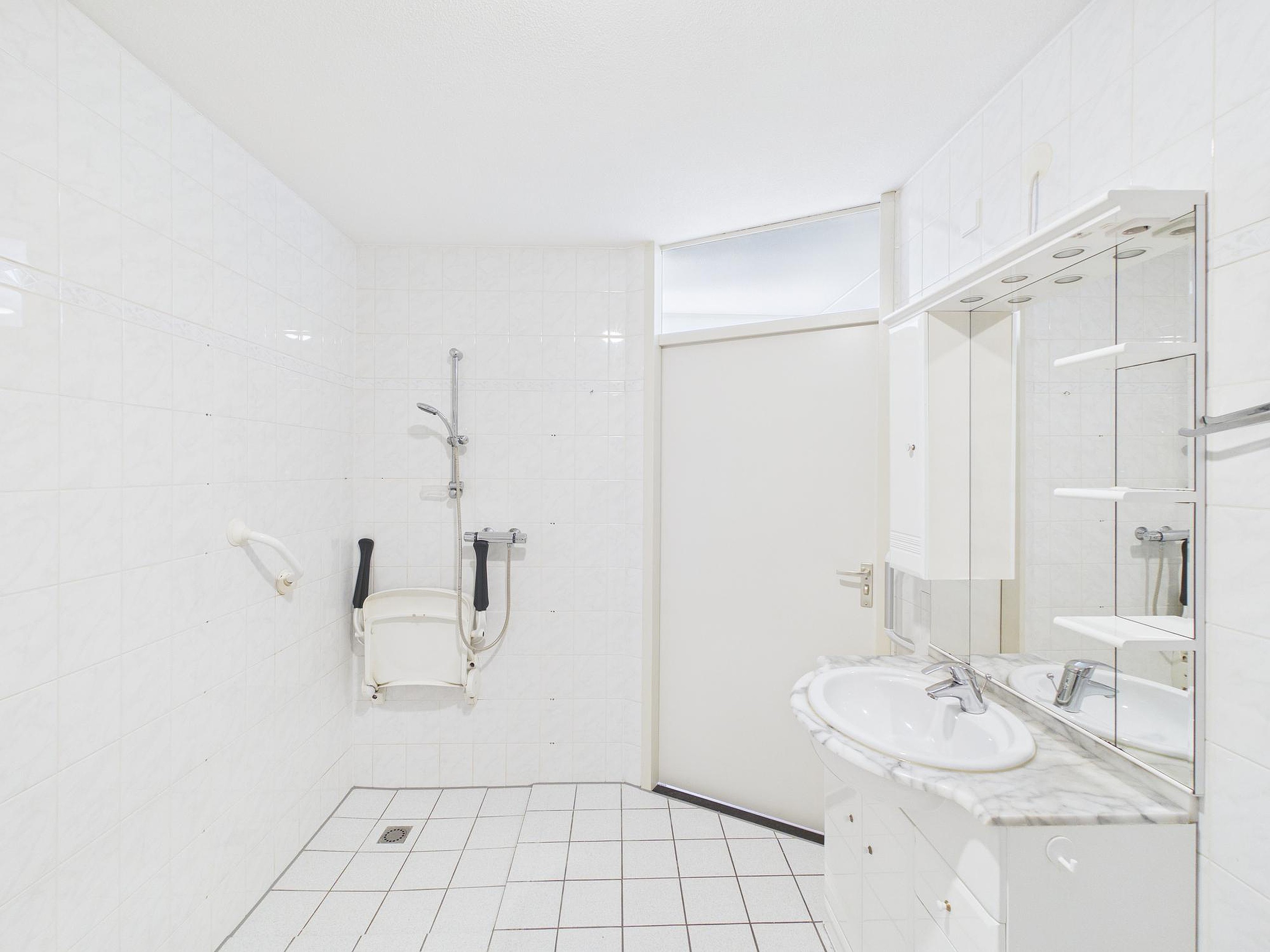 De badkamer is voorzien van een douche, wastafel en toilet.