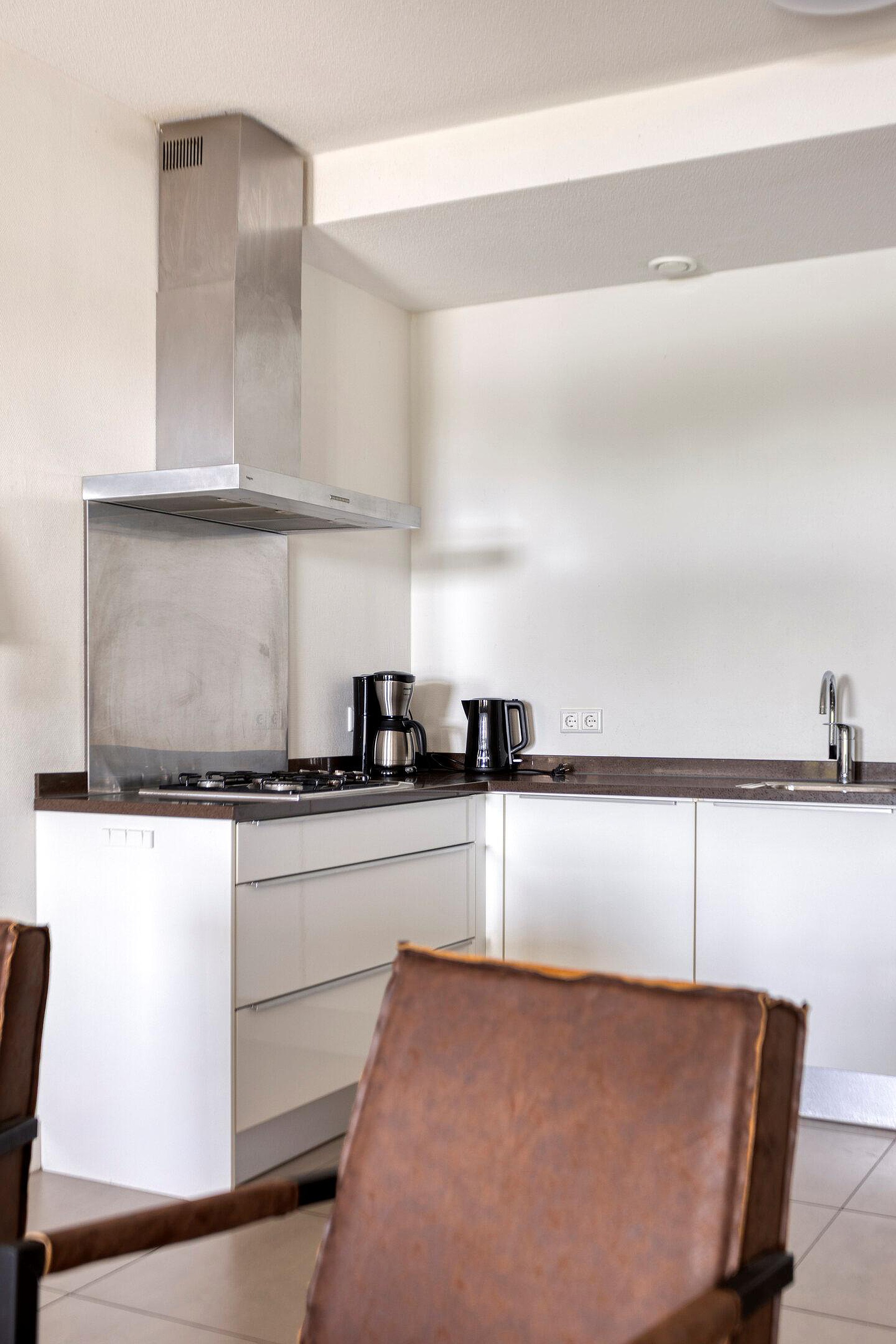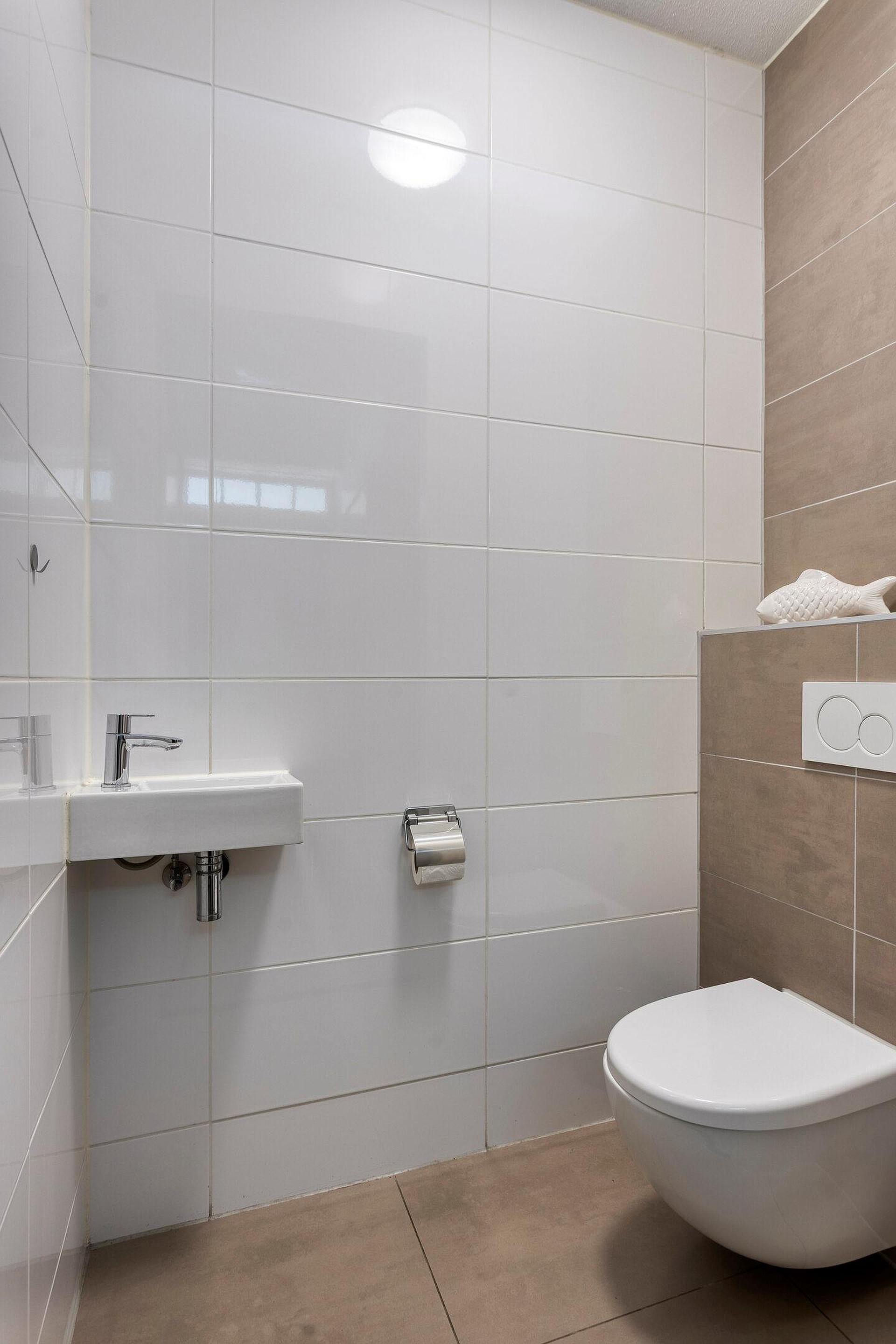 De keuken is uitgerust met een modern hoekmeubel met hoogwaardige inbouwapparatuur, waaronder een combi-oven, gaskookplaat, afzuigkap, vaatwasser en koelkast. Het donkere natuursteen werkblad en de strakke witte kasten zorgen voor een eigentijdse uitstraling. Op de begane grond bevindt zich tevens de eerste en tweede slaapkamer, ideaal voor gasten of als werkkamer. Aangrenzend vind je een moderne badkamer met een inloopdouche, ligbad en wastafelmeubel. Ook is er een grote berging voor het opslaan van diverse spullen.