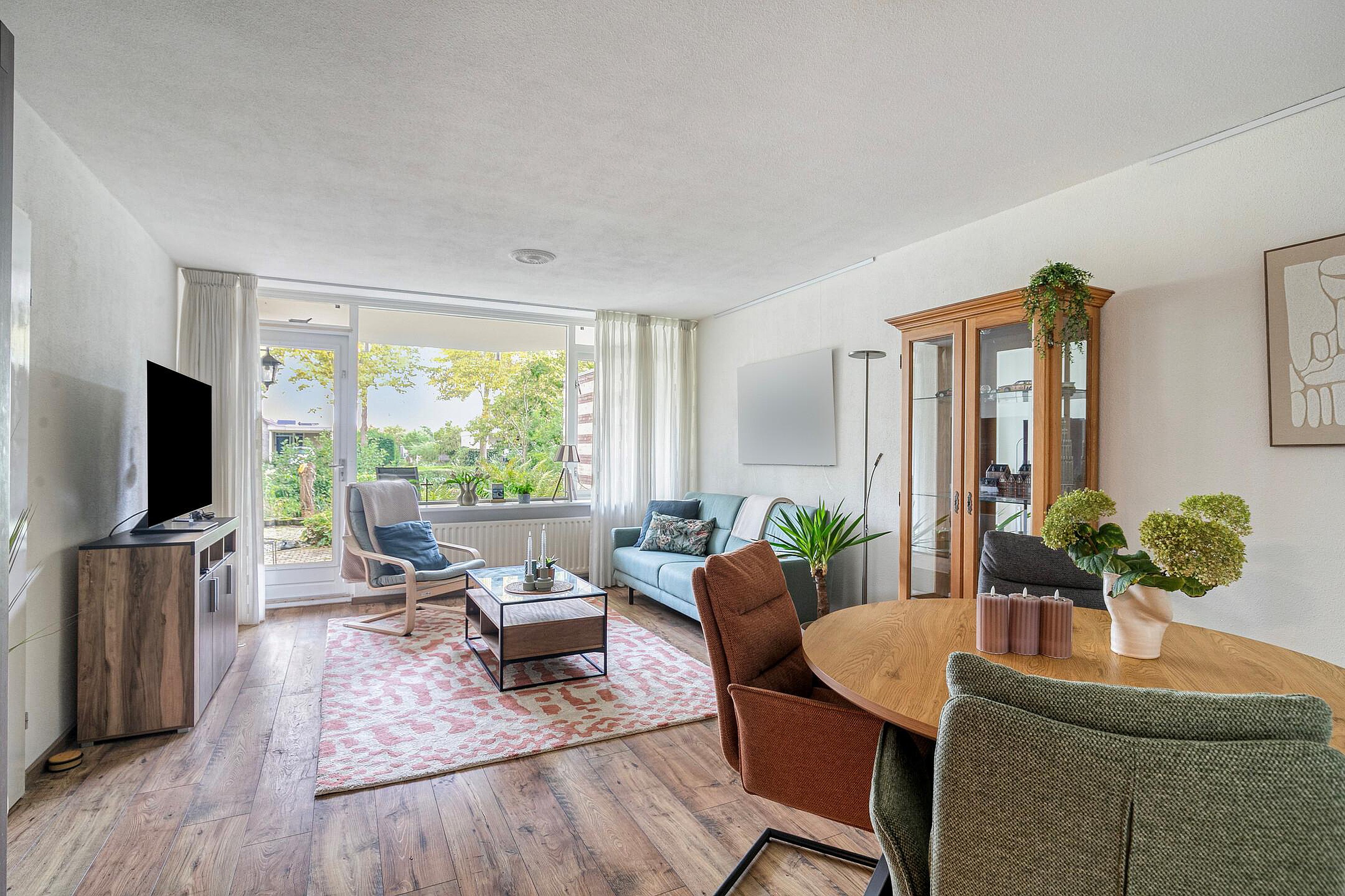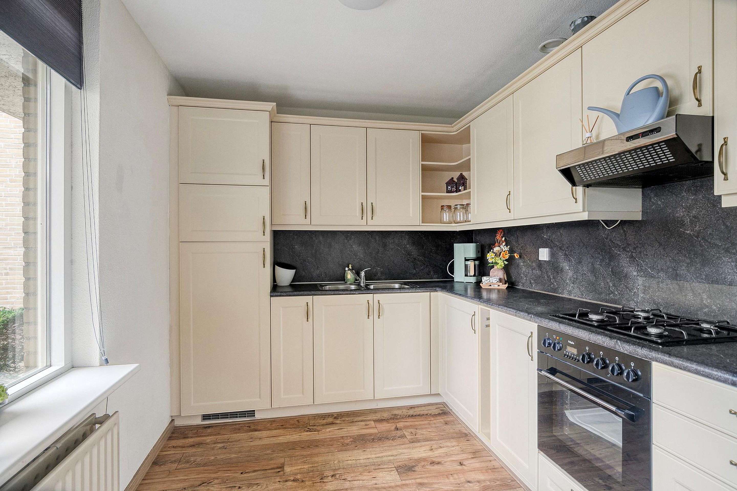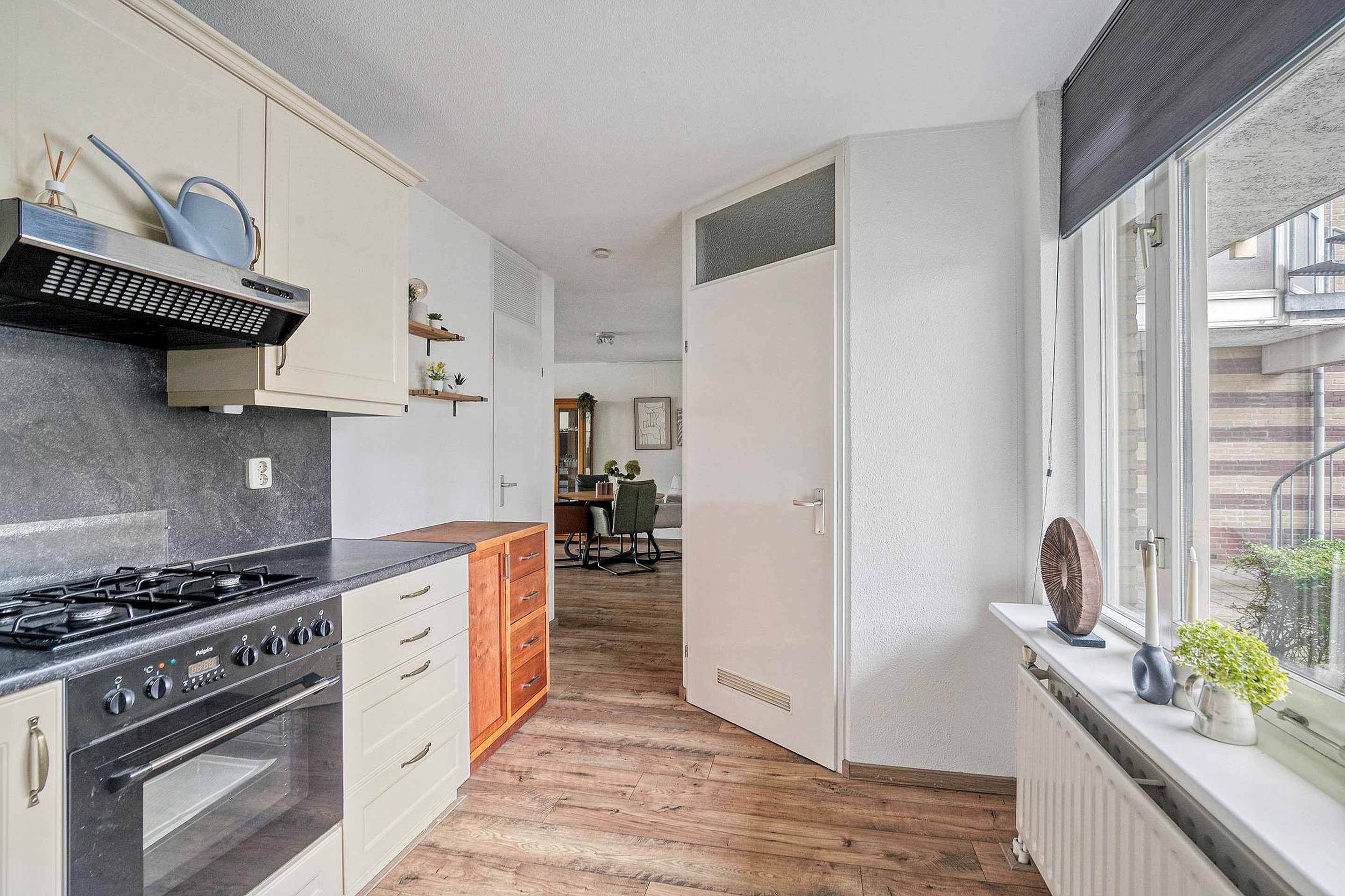 Bij binnenkomst valt direct de prettige lichtinval op. De ruime woonkamer heeft grote raampartijen en een tuindeur naar het terras, waardoor binnen en buiten naadloos in elkaar overlopen. Vanuit uw zithoek kijkt u uit op het groene plantsoen, wat een gevoel van rust en privacy geeft. De eethoek sluit aan op de halfopen keuken, die is ingericht met crèmekleurige fronten, een donker werkblad en diverse inbouwapparatuur zoals een gaskookplaat, oven, afzuigkap en koelkast.