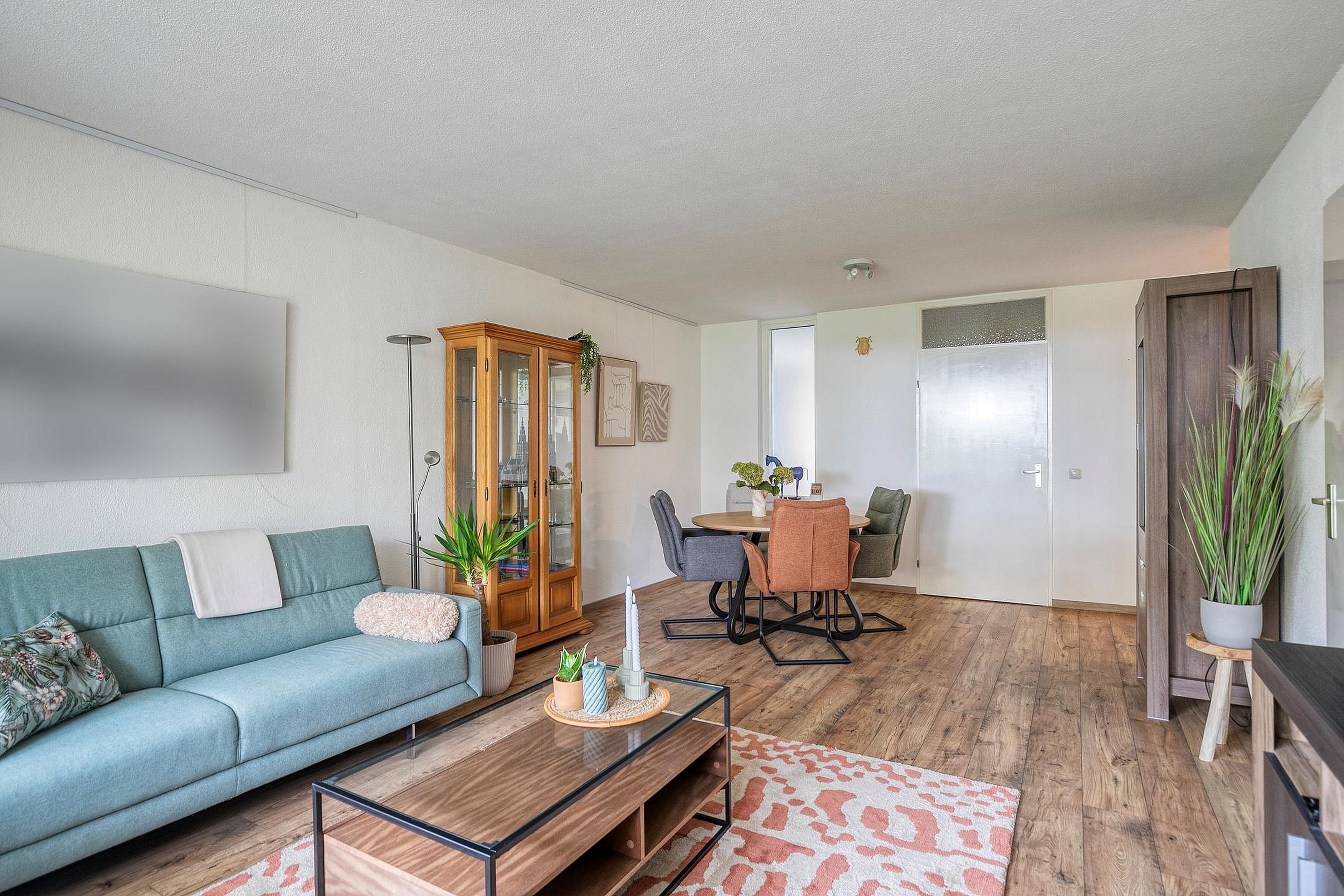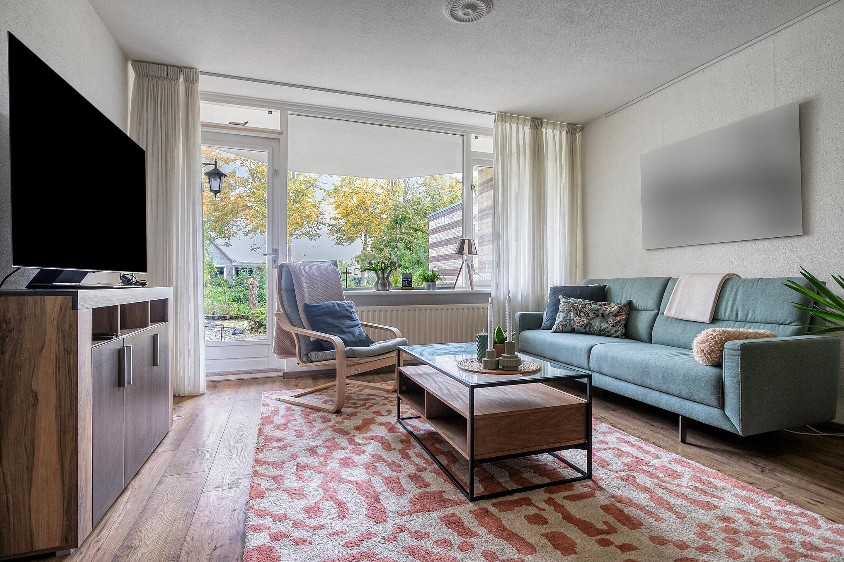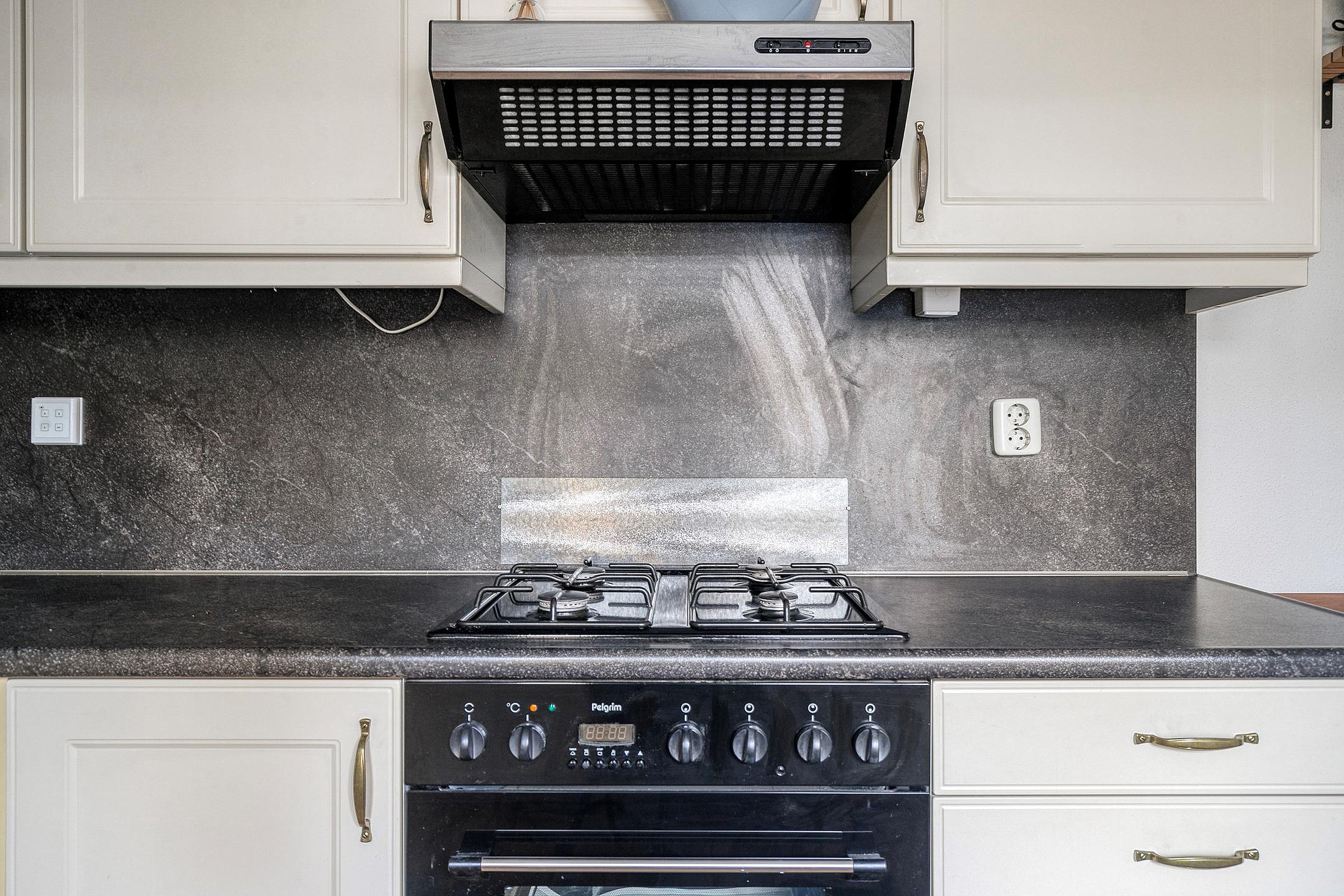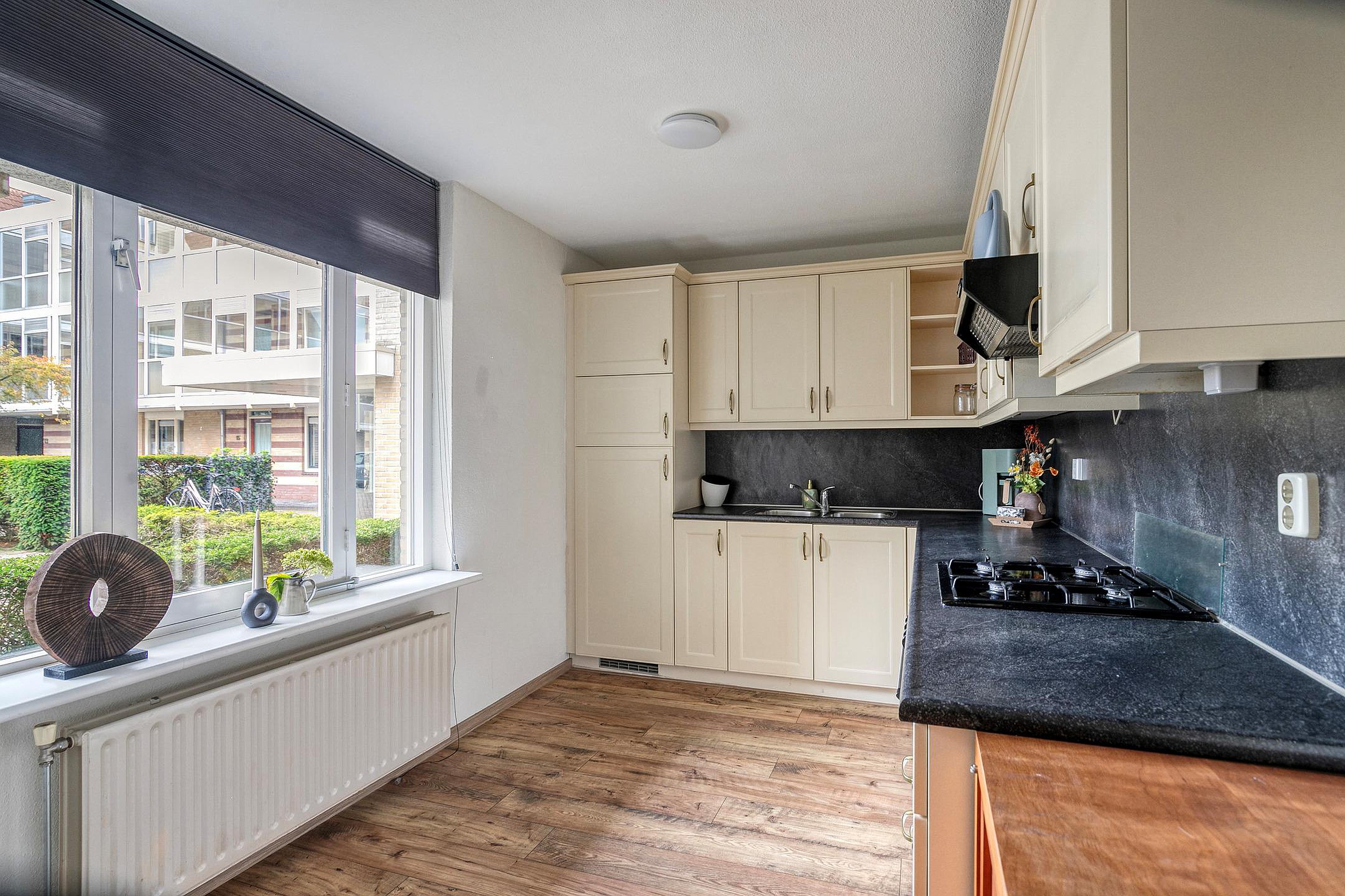 Bij binnenkomst valt direct de prettige lichtinval op. De ruime woonkamer heeft grote raampartijen en een tuindeur naar het terras, waardoor binnen en buiten naadloos in elkaar overlopen. Vanuit uw zithoek kijkt u uit op het groene plantsoen, wat een gevoel van rust en privacy geeft. De eethoek sluit aan op de halfopen keuken, die is ingericht met crèmekleurige fronten, een donker werkblad en diverse inbouwapparatuur zoals een gaskookplaat, oven, afzuigkap en koelkast.