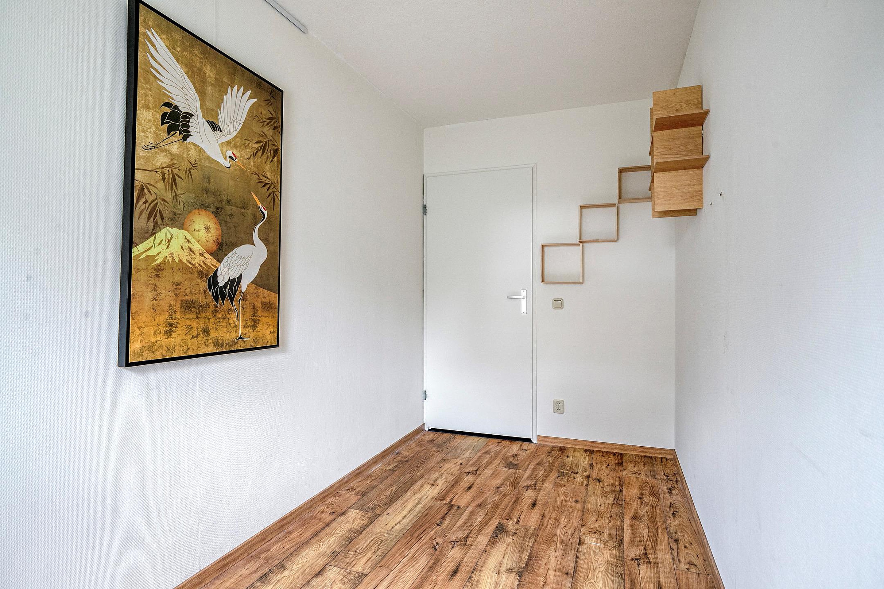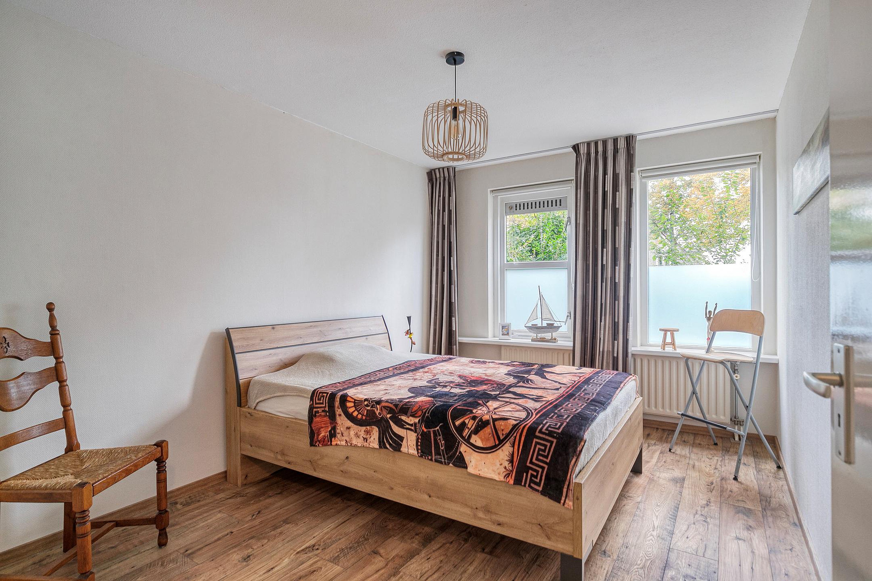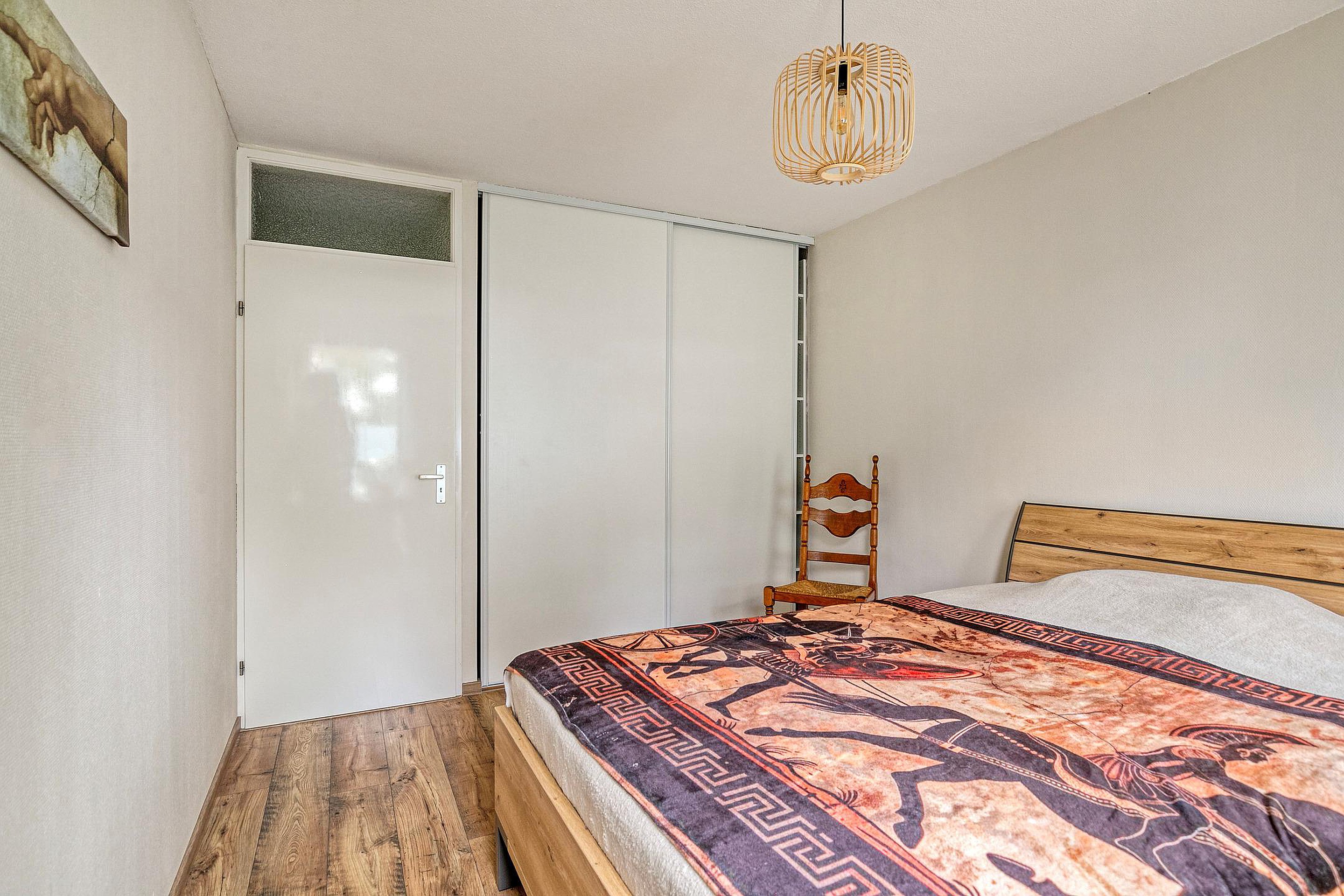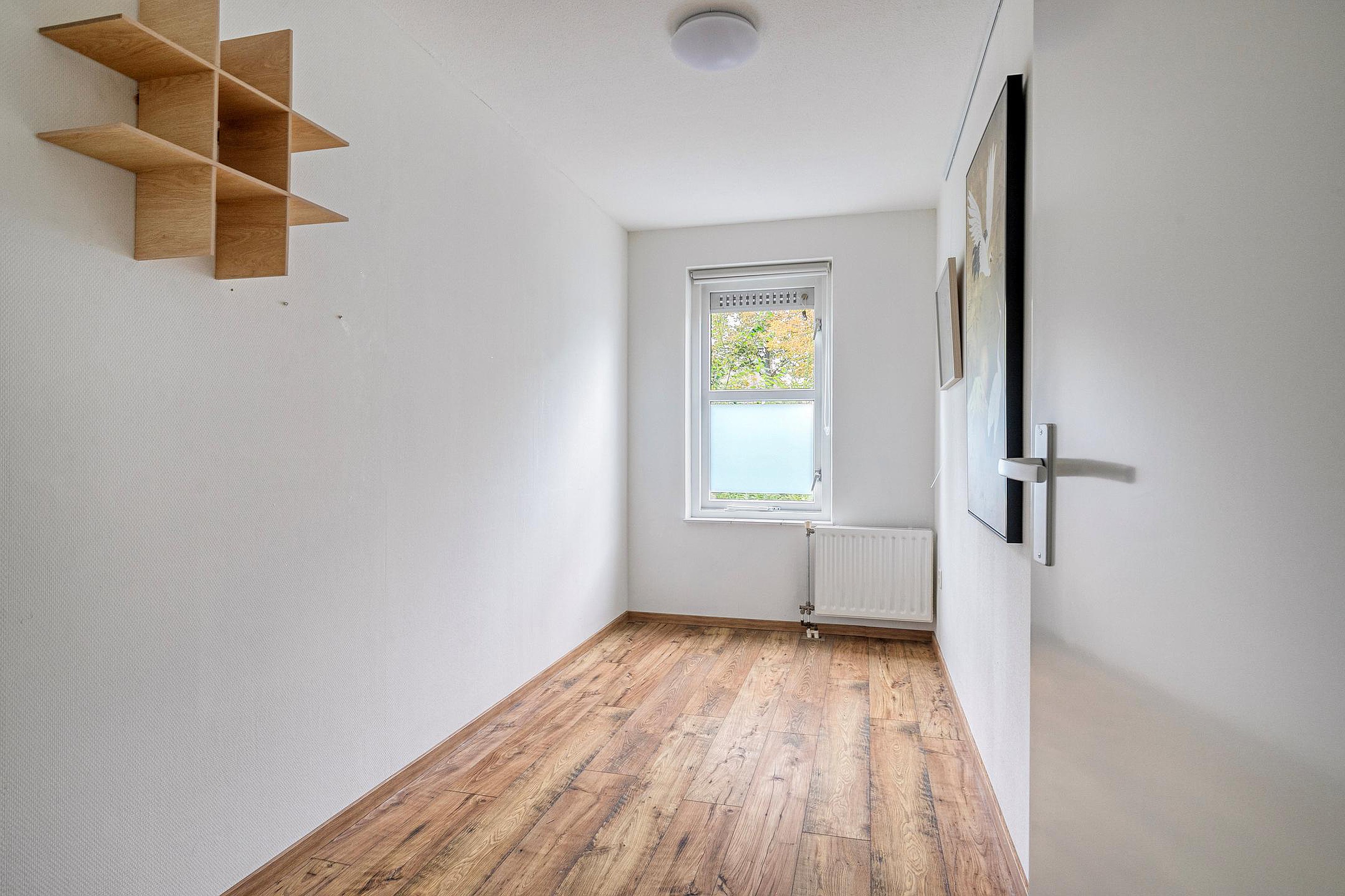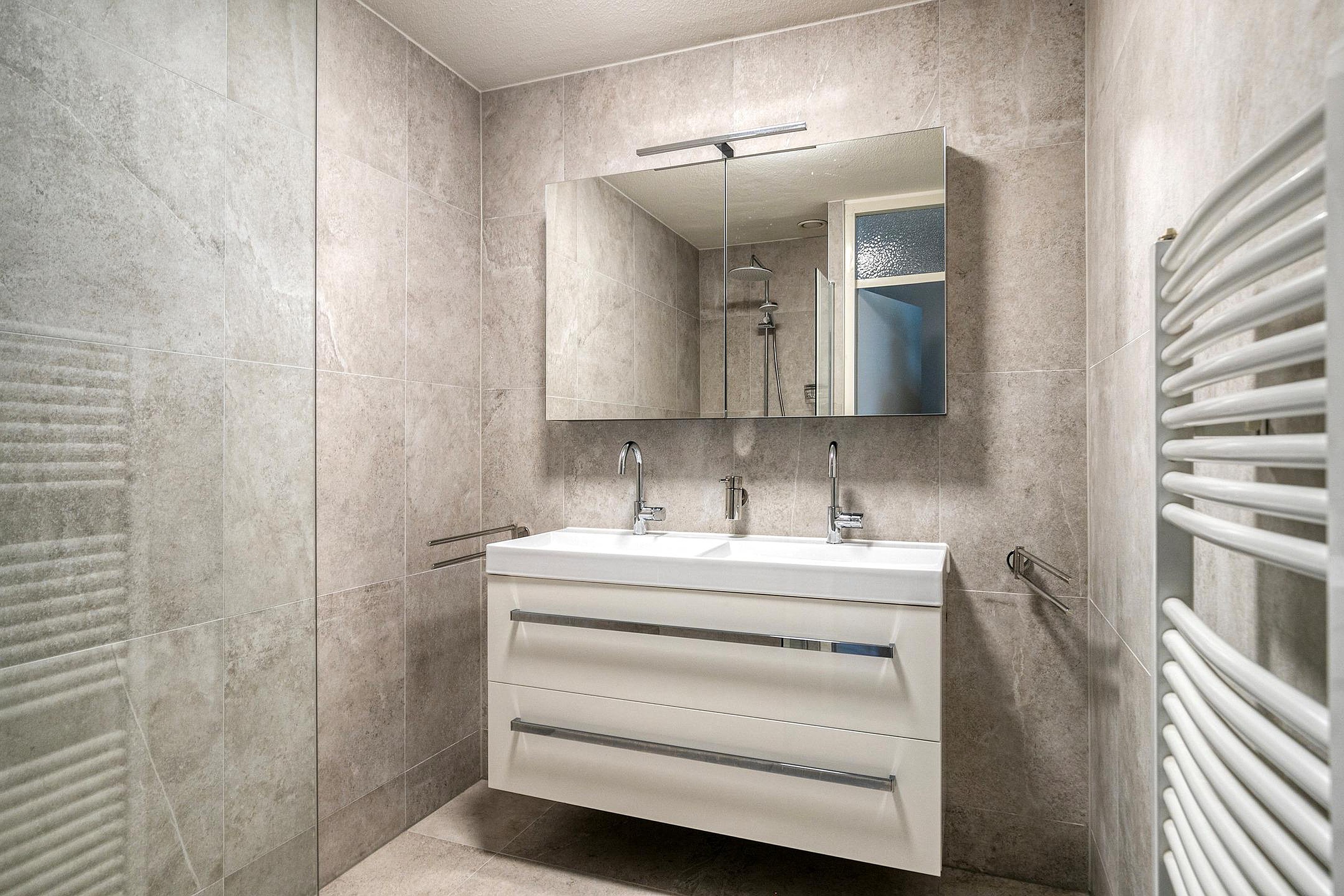 De hal geeft toegang tot de twee slaapkamers, beide met een rustige uitstraling en nette afwerking. Er is voldoende ruimte voor een tweepersoonsbed in de hoofdslaapkamer; deze is tevens voorzien van een inbouwkast. De tweede slaapkamer is ideaal als logeerkamer of werkplek. De badkamer is, evenals het toilet, modern en strak afgewerkt met grote betonlook tegels, een wastafelmeubel met dubbele kraan, inloopdouche en designradiator. Daarnaast is er een praktische bergkast met ruimte voor wasapparatuur.