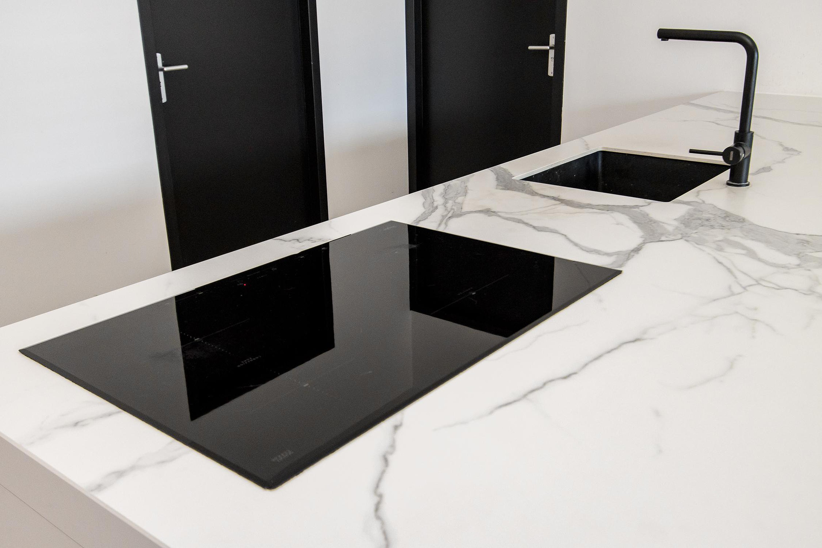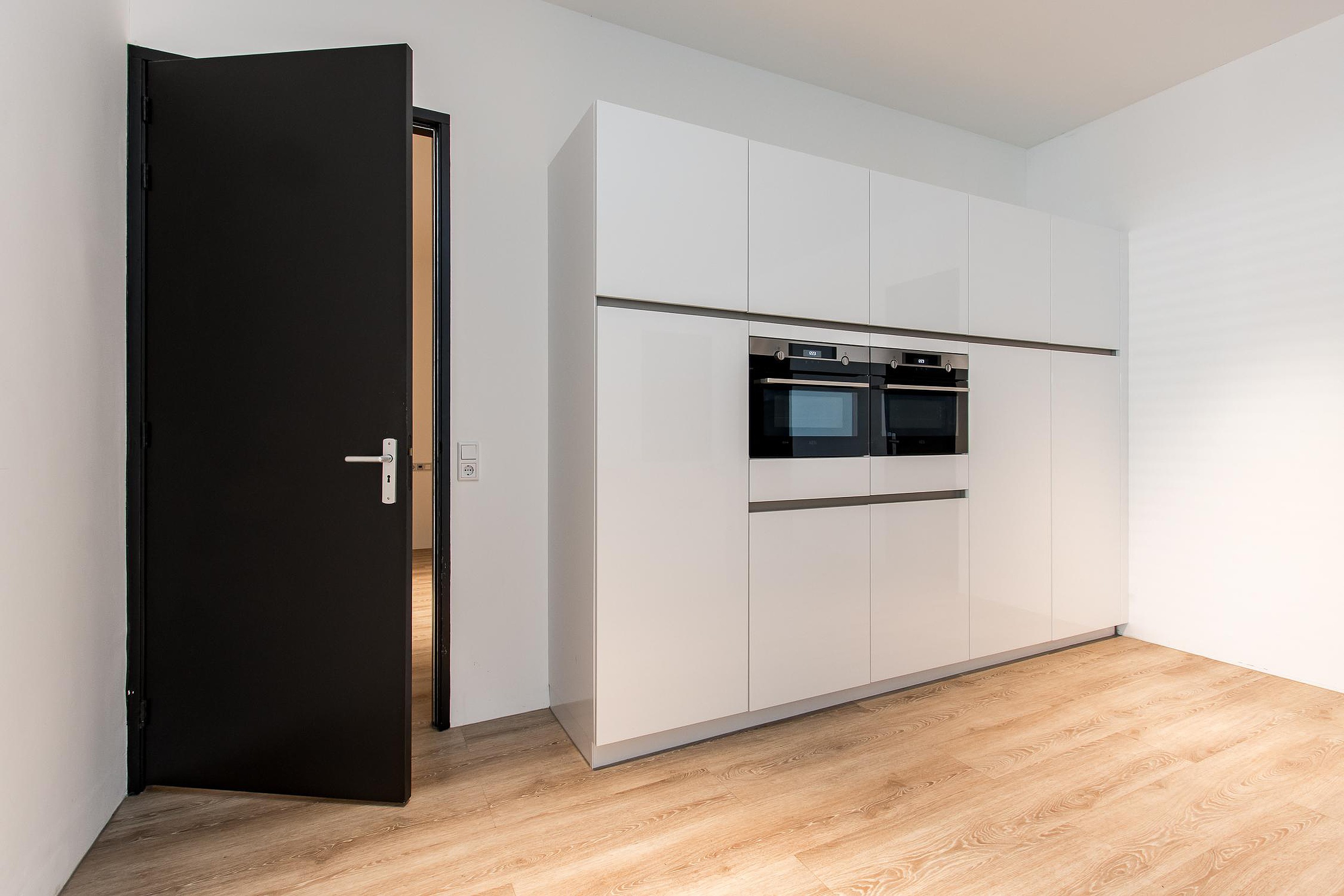 Bij binnenkomst in het appartement wordt direct de stijlvolle en luxe keuken zichtbaar. Het grote keukenblok biedt aan beide zijden veel bergruimte en is uitgerust met moderne inbouwapparatuur, waaronder een inductiekookplaat, een vaatwasser en een kastenwand met twee combi-ovens, een koelkast met vriesvak.