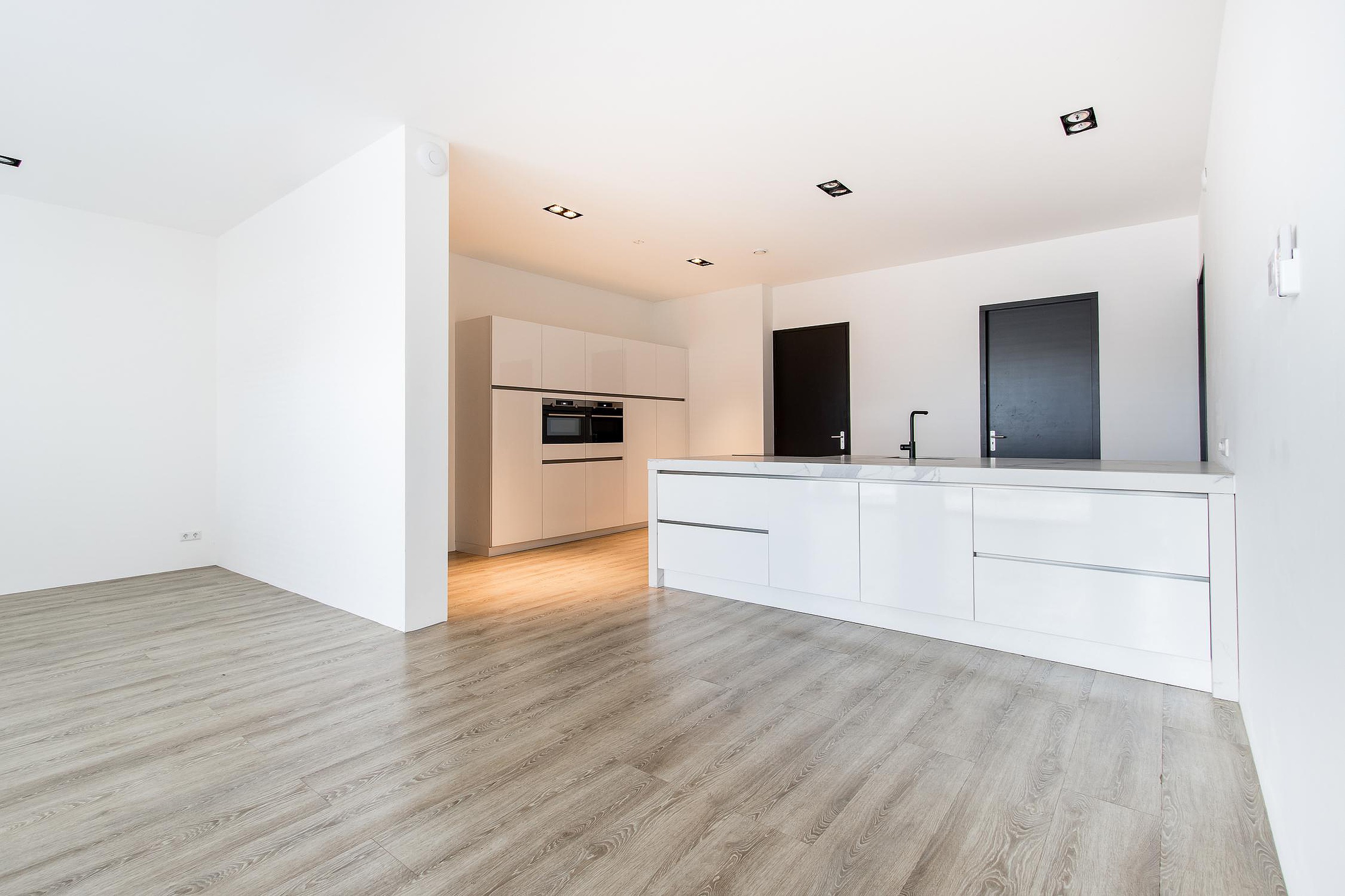 De open keuken staat in verbinding met de royale en lichte woonkamer, die samen maar liefst 54 m2 beslaat. Dankzij de grote raampartijen, van vloer tot plafond, geniet de ruimte van veel natuurlijk lichtinval en een ruimtelijk gevoel.