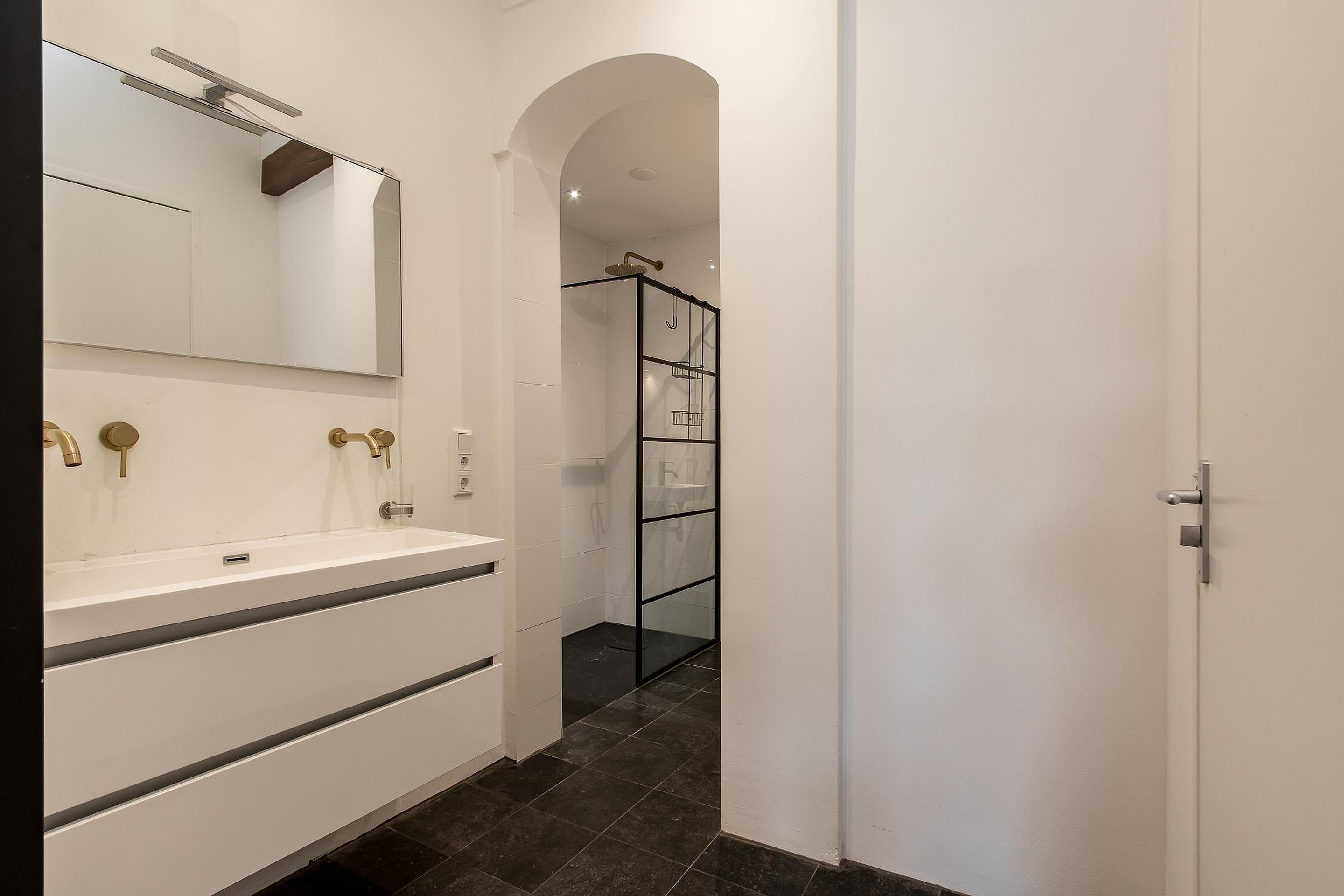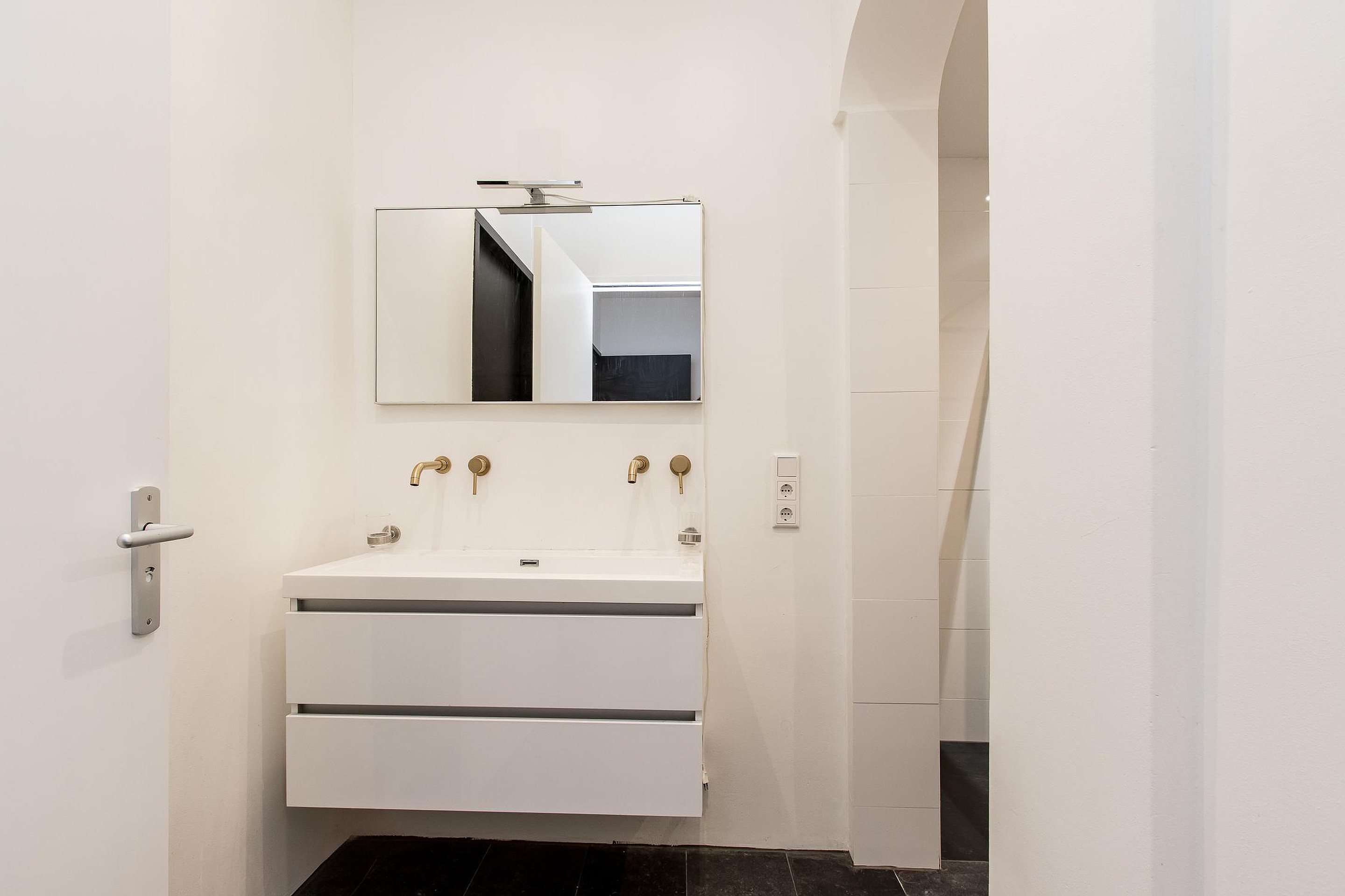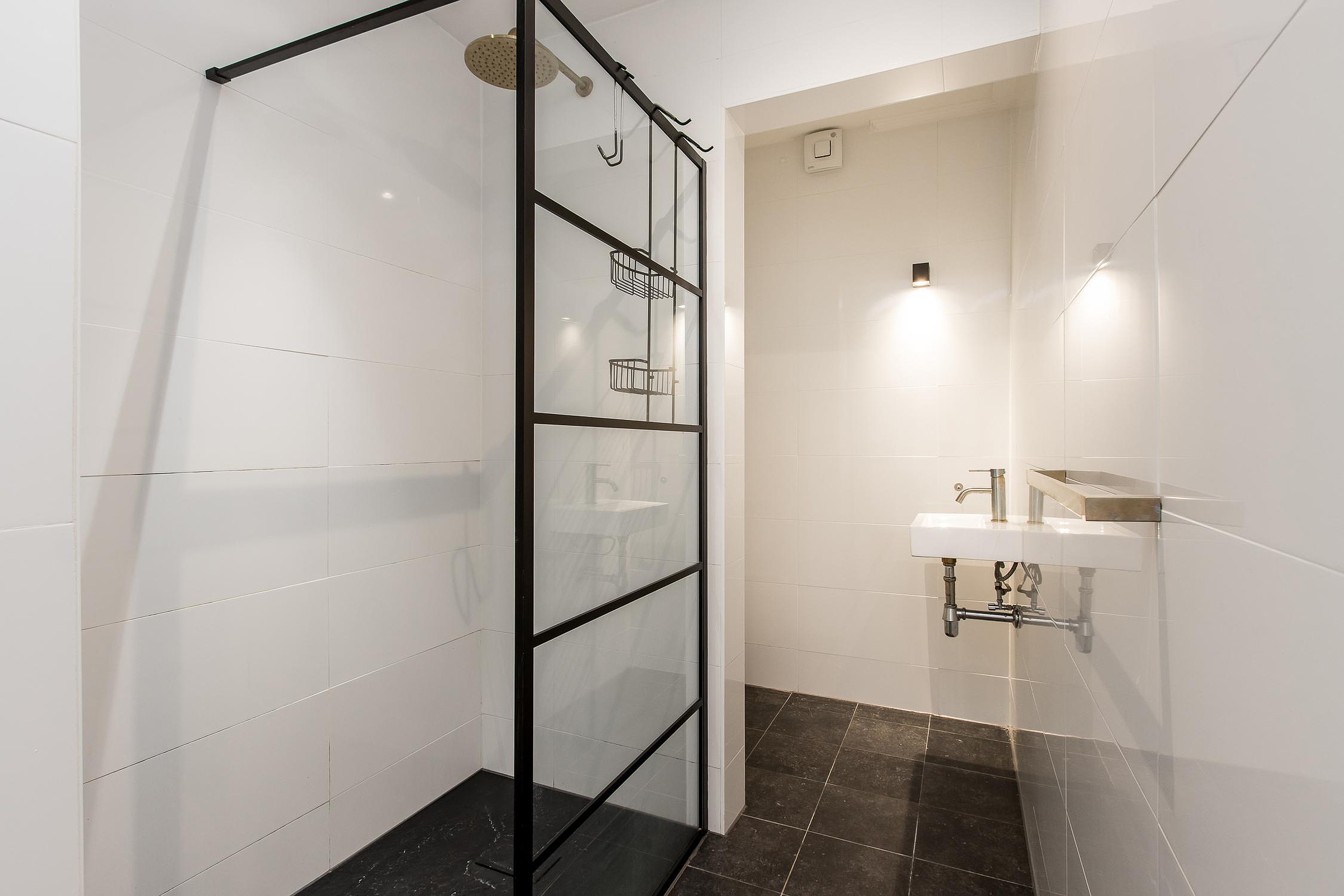 De eerste badkamer is modern en stijlvol afgewerkt en voorzien van een inloopdouche, wastafelmeubel en toilet met fonteintje. De tweede badkamer, gelegen naast de bijkeuken, is praktisch ingericht en ideaal als extra voorzieningenruimte.