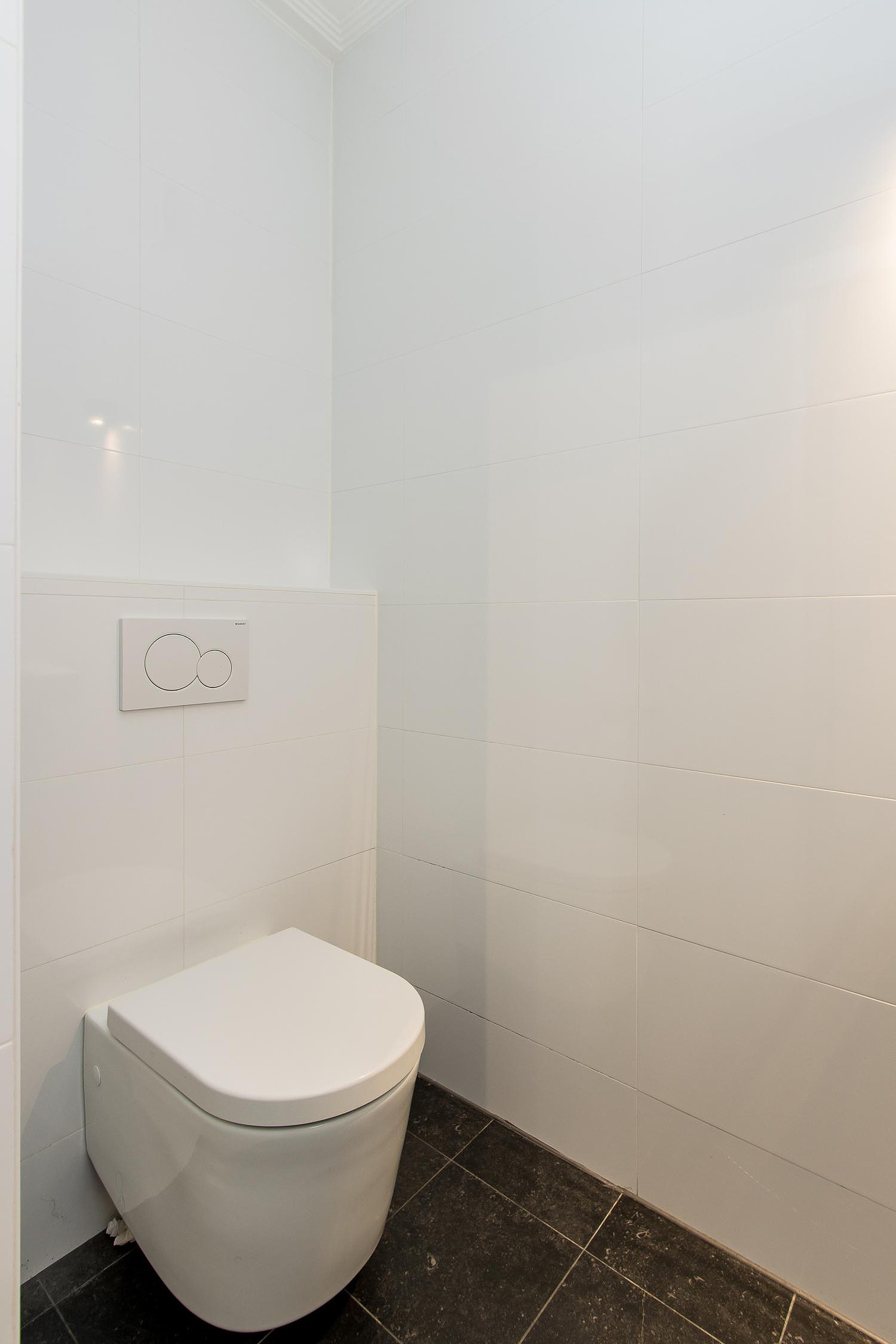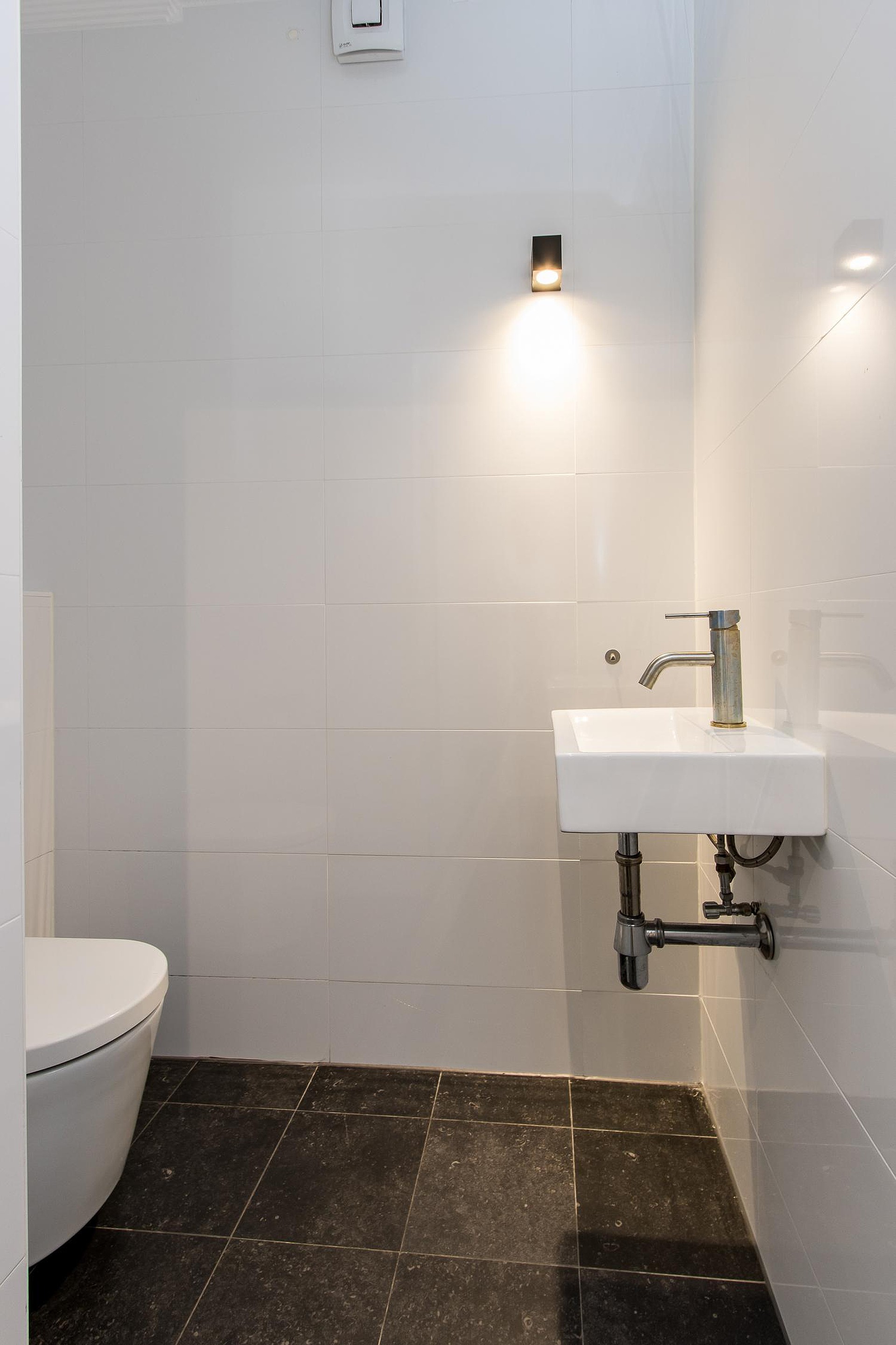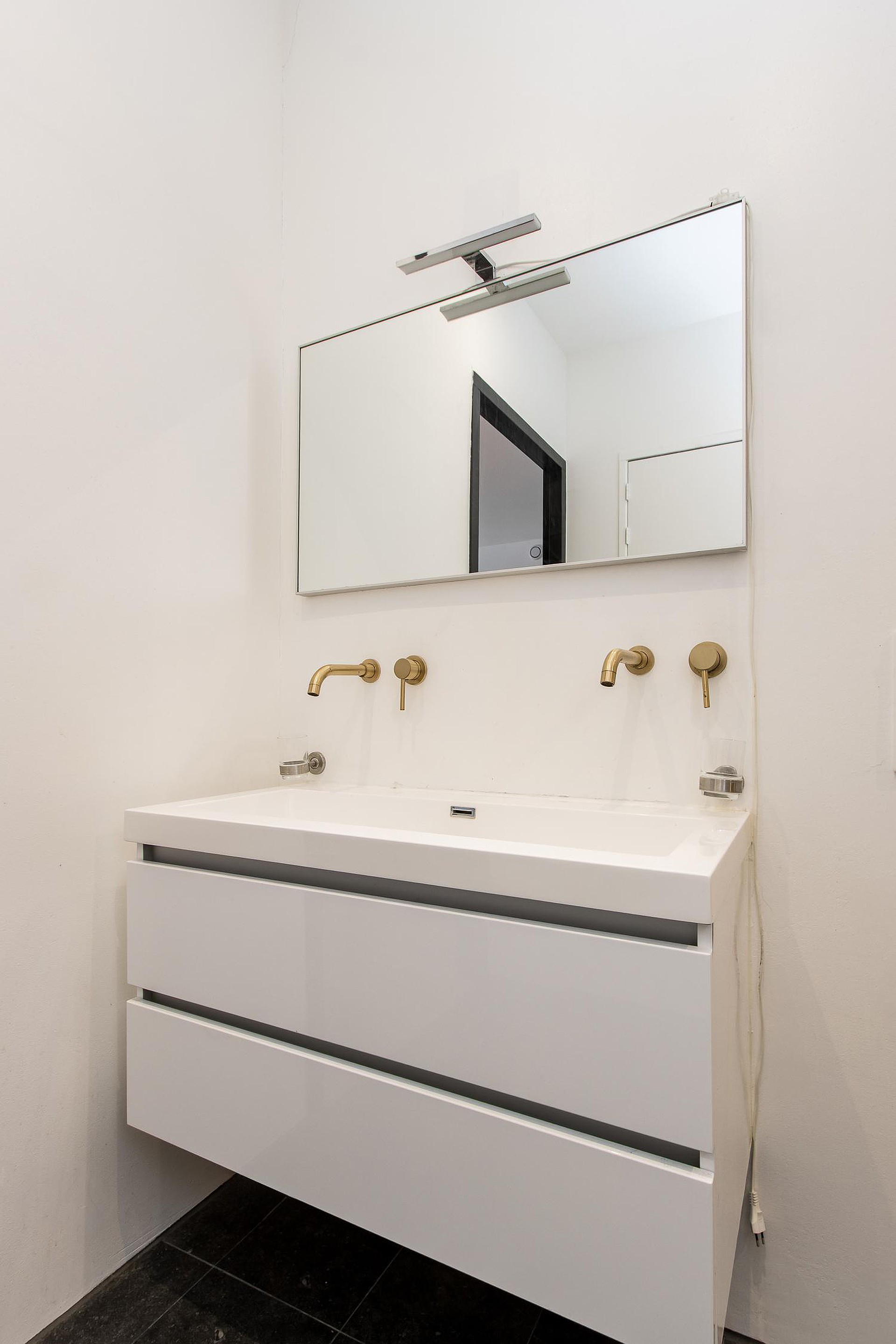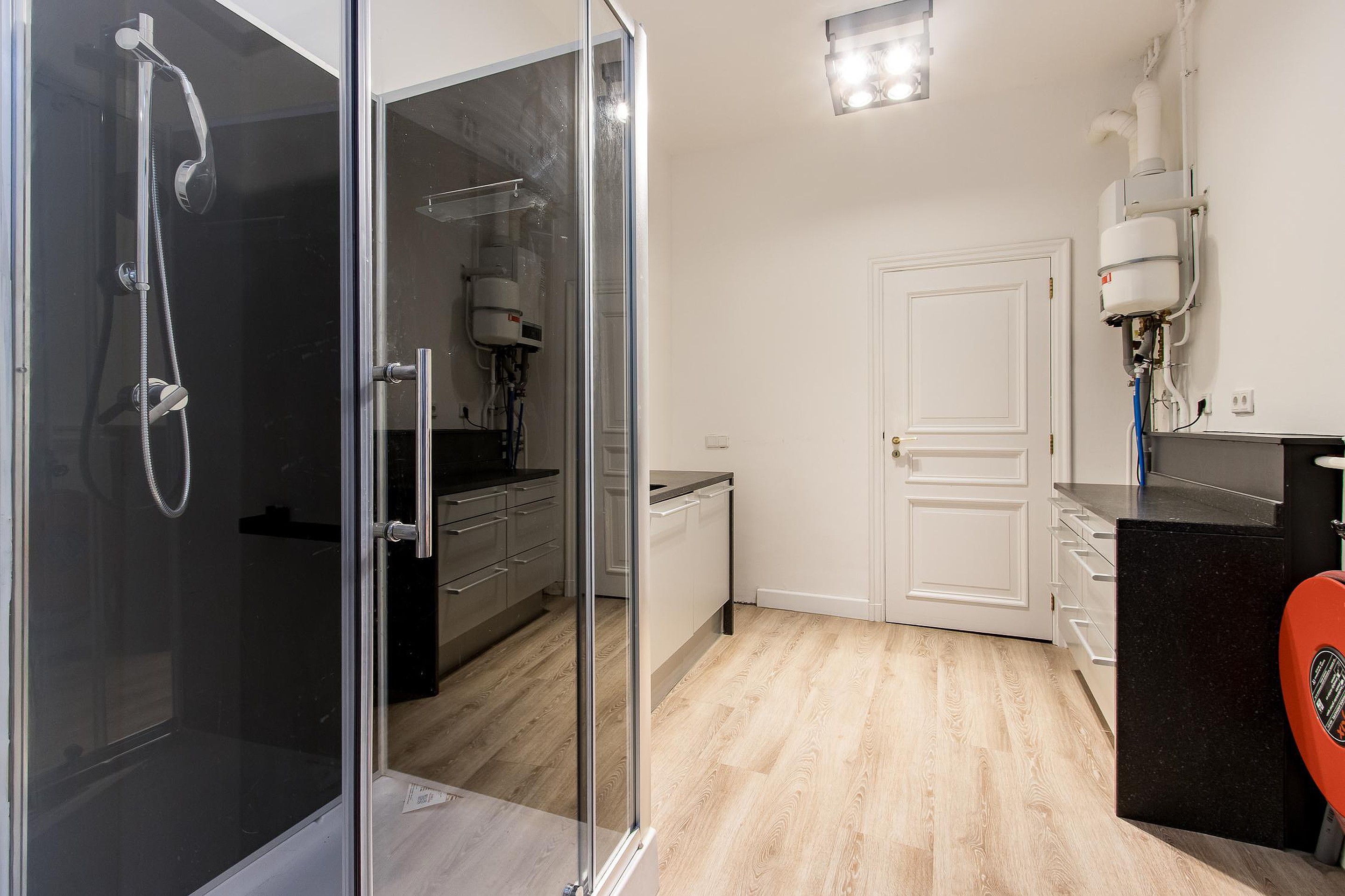 De eerste badkamer is modern en stijlvol afgewerkt en voorzien van een inloopdouche, wastafelmeubel en toilet met fonteintje. De tweede badkamer, gelegen naast de bijkeuken, is praktisch ingericht en ideaal als extra voorzieningenruimte.