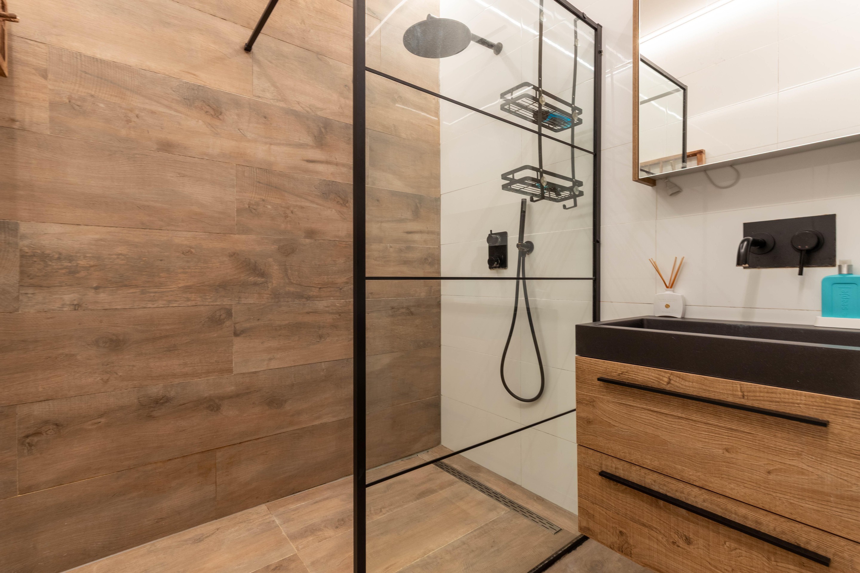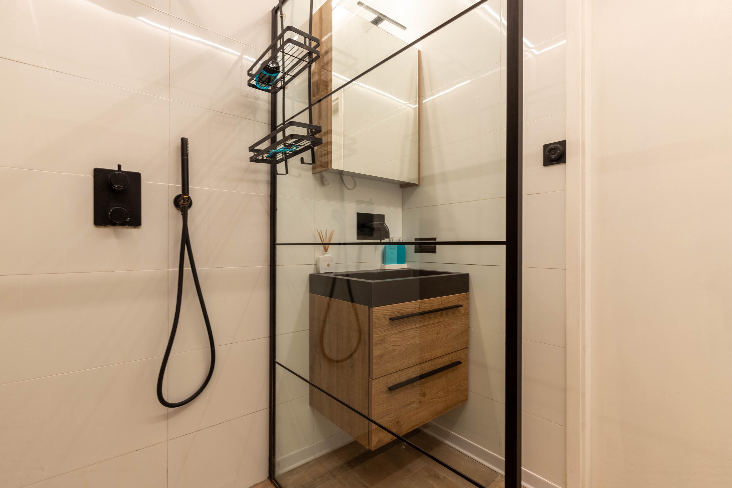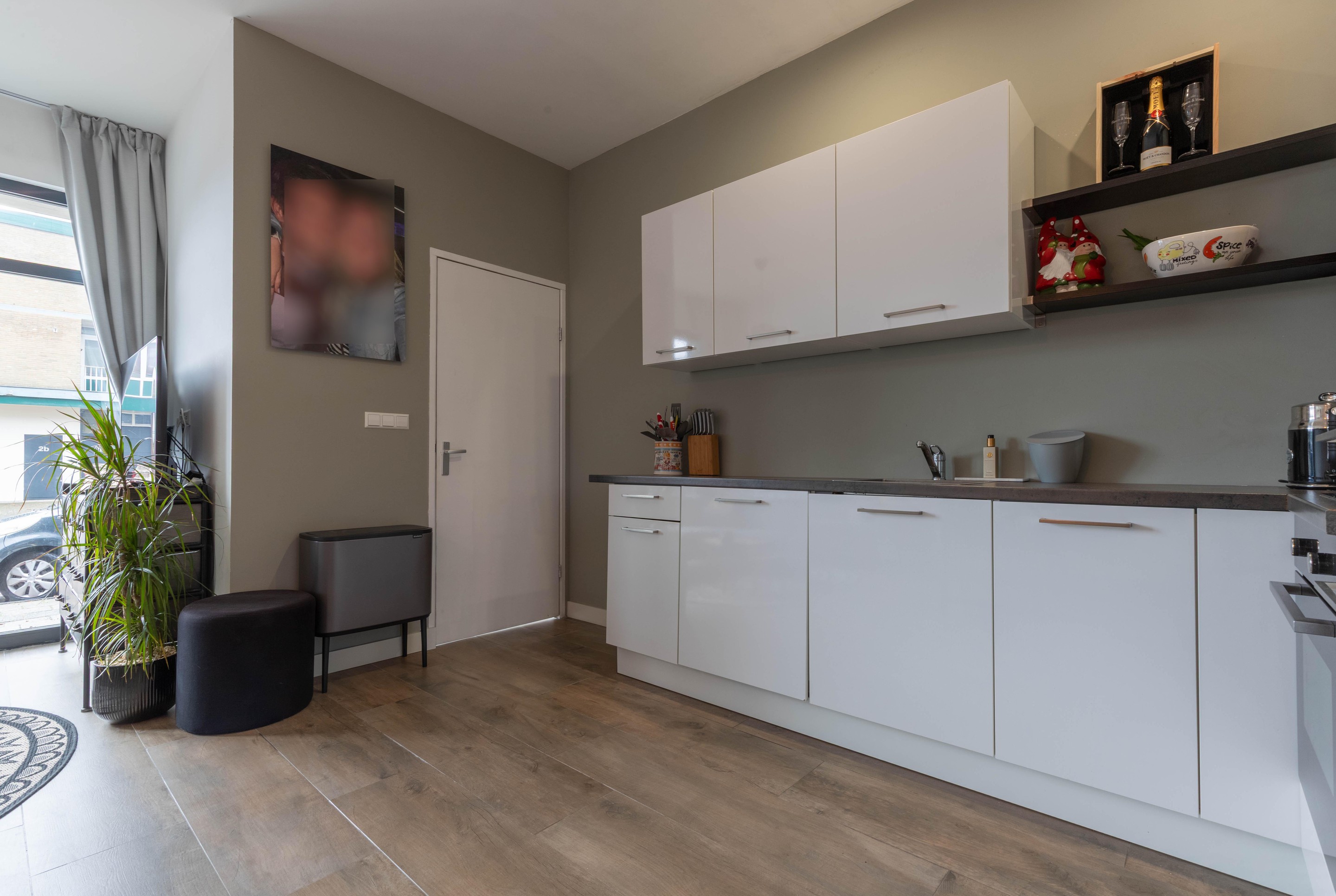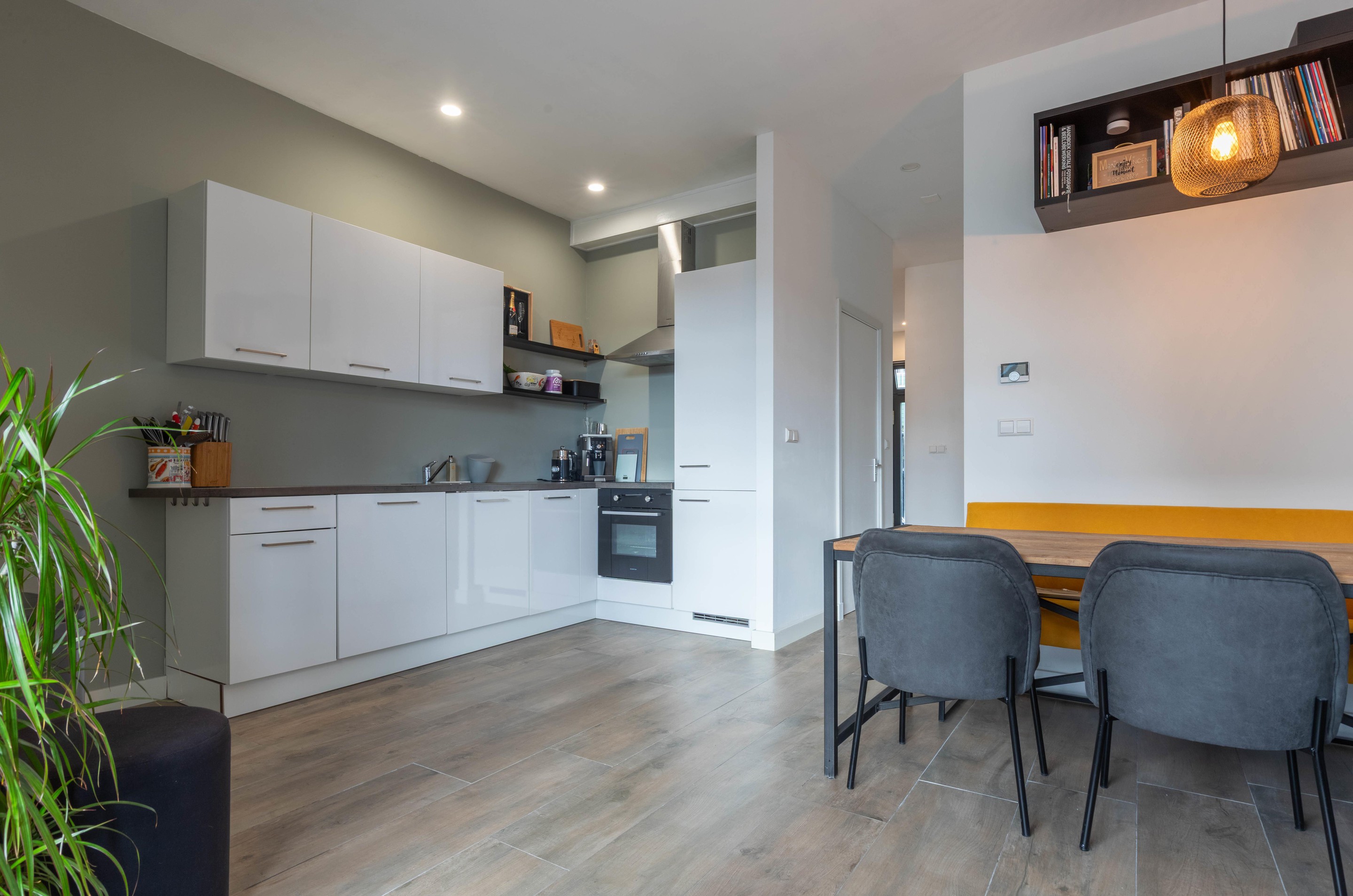 Begane grond De sfeervolle woonkamer heeft hoge plafonds en grote ramen, wat zorgt voor een mooie lichtinval. De L-vormige keuken is uitgevoerd in hoogglans wit met een antraciet werkblad en voorzien van diverse inbouwapparatuur. Vanuit de hal bereikt u de toiletruimte met fonteintje, een handige bergkast met aansluiting voor wasmachine en droger, en de moderne badkamer met wastafelmeubel, inloopdouche met stalen wand en regendouche.