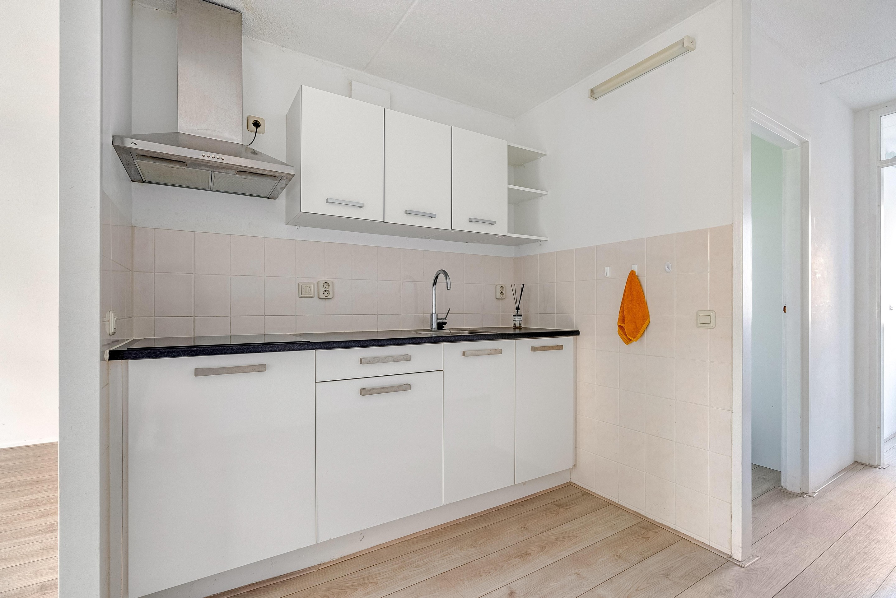 De keuken is netjes en voorzien van nette witte frontjes.