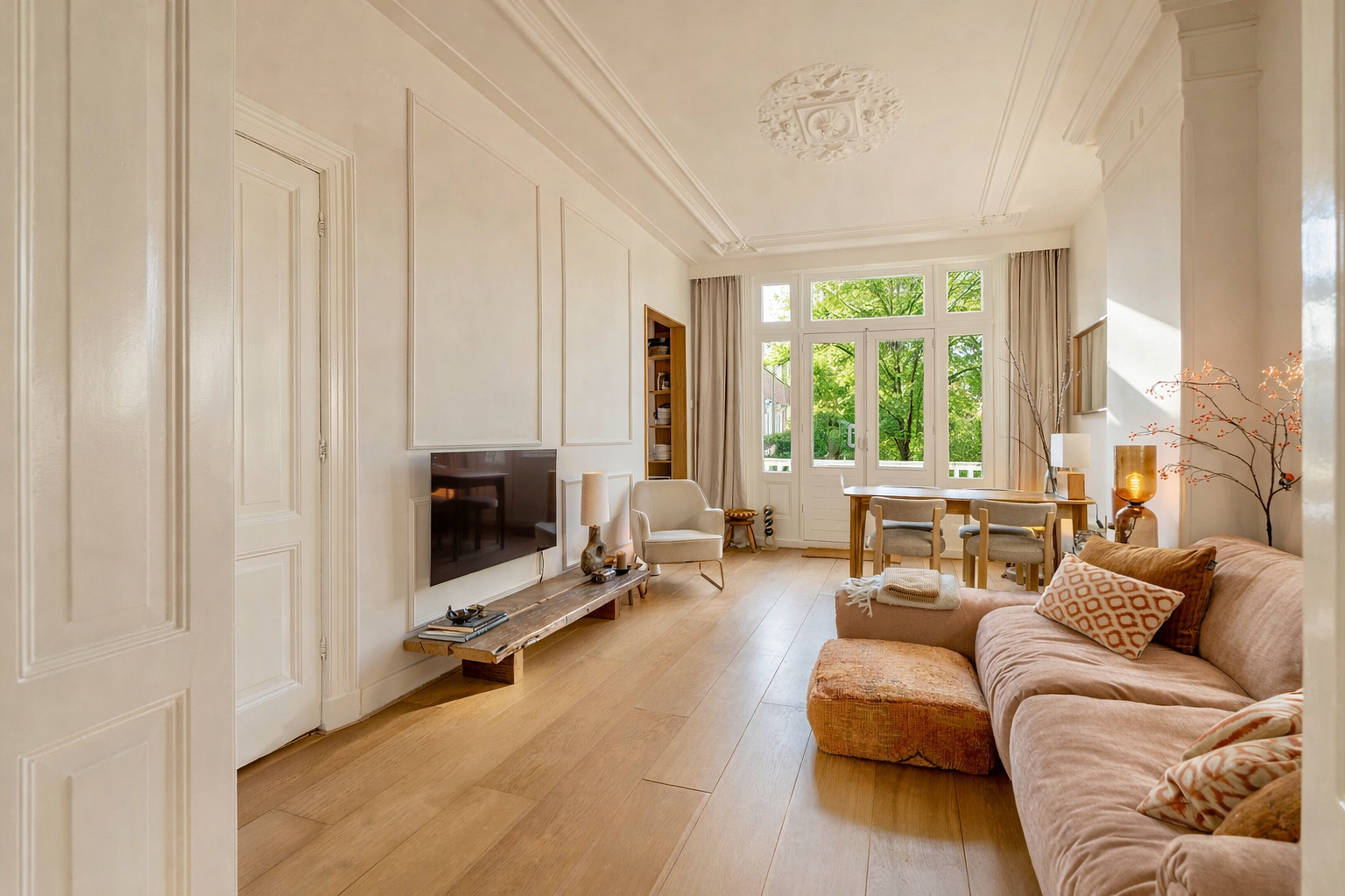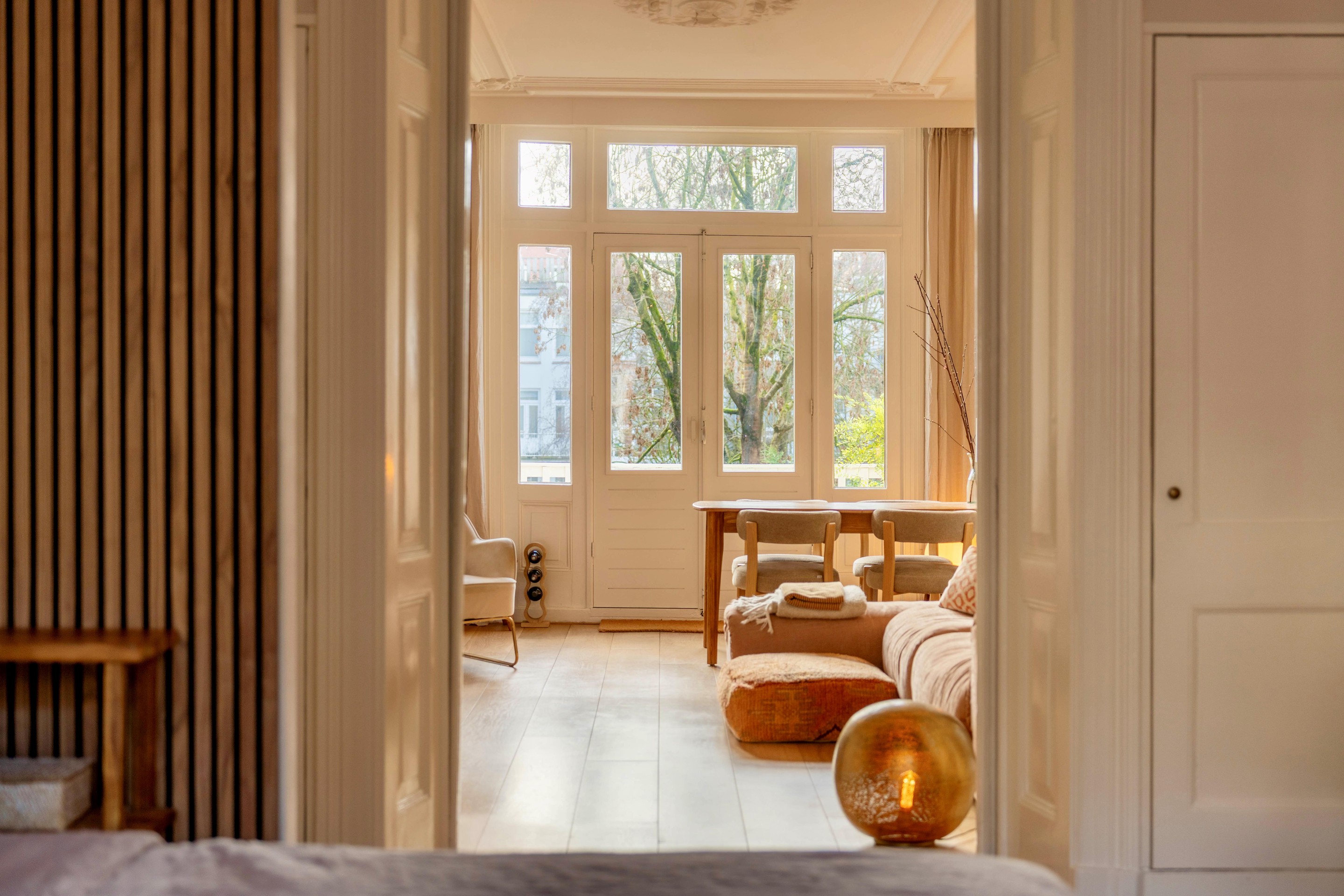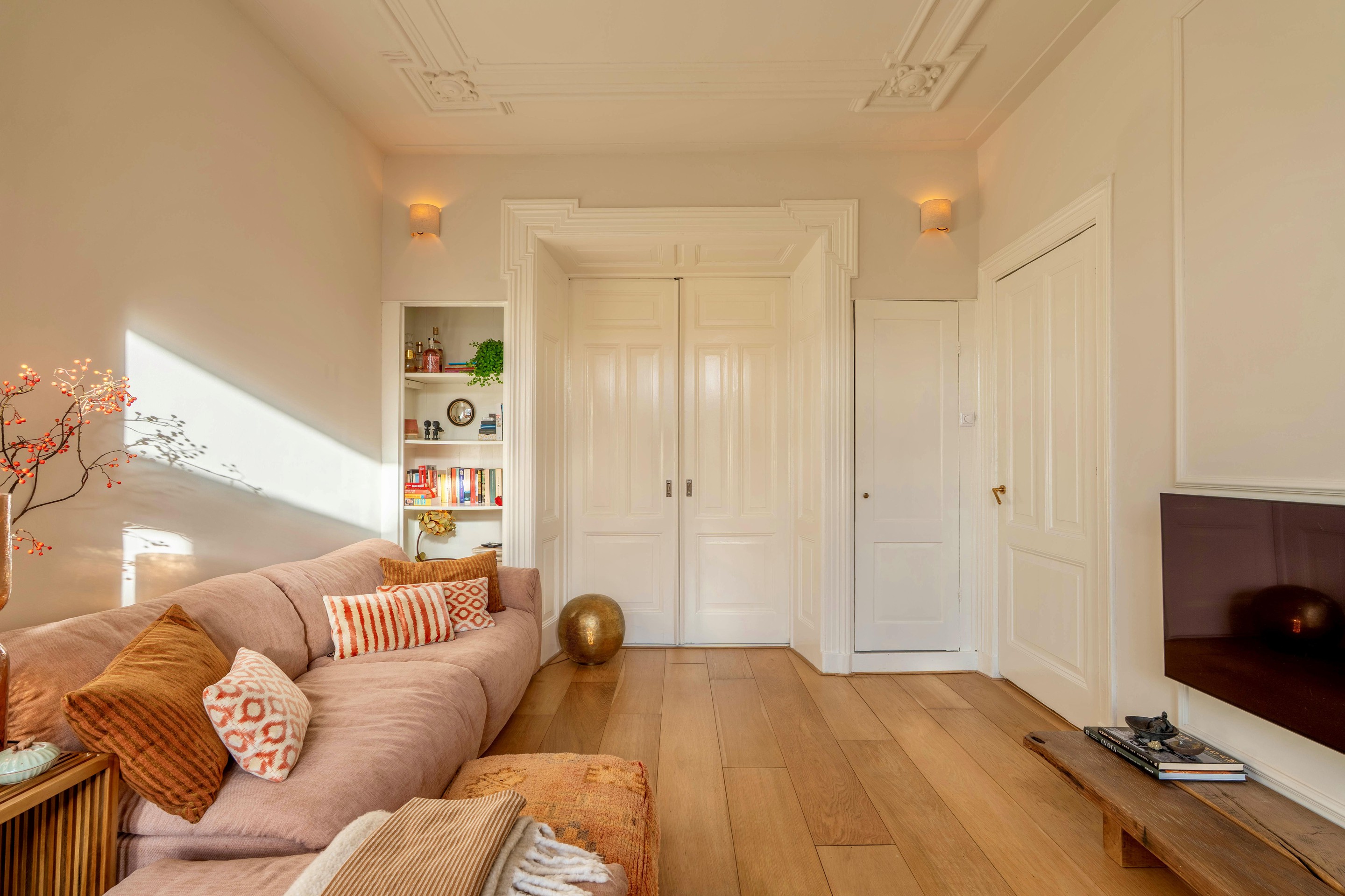 De woonkamer ligt aan de achterzijde en heeft openslaande deuren naar het zonnige balkon op het zuidwesten. Het daglicht valt hier rijkelijk naar binnen en benadrukt de fraaie plafondhoogte en de sierlijke ornamenten. De karakteristieke ensuite deuren vormen het stijlvolle middelpunt van de woning en verbinden de woonruimte met de slaapkamer aan de voorzijde. Ze geven flexibiliteit én versterken het authentieke karakter van het appartement. Open voor een ruimtelijk effect, gesloten voor privacy — precies zoals je het wilt.