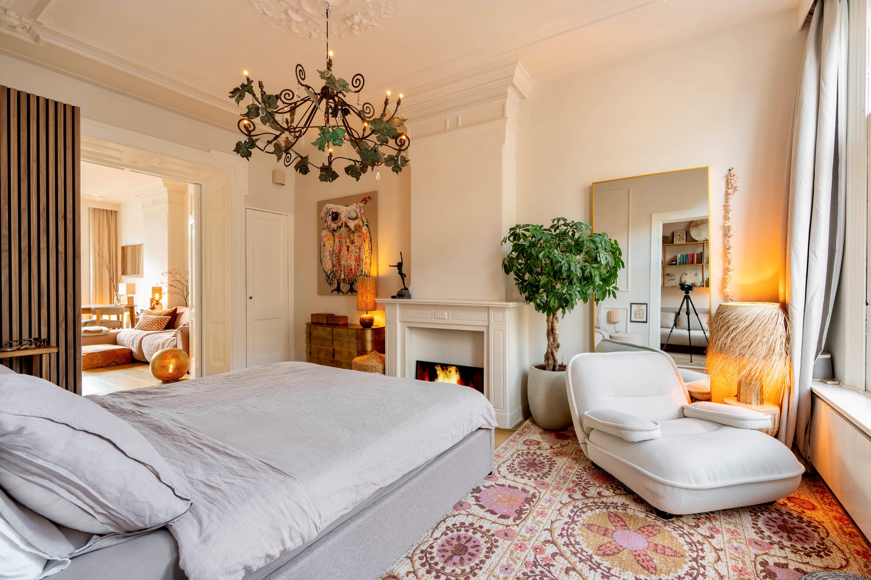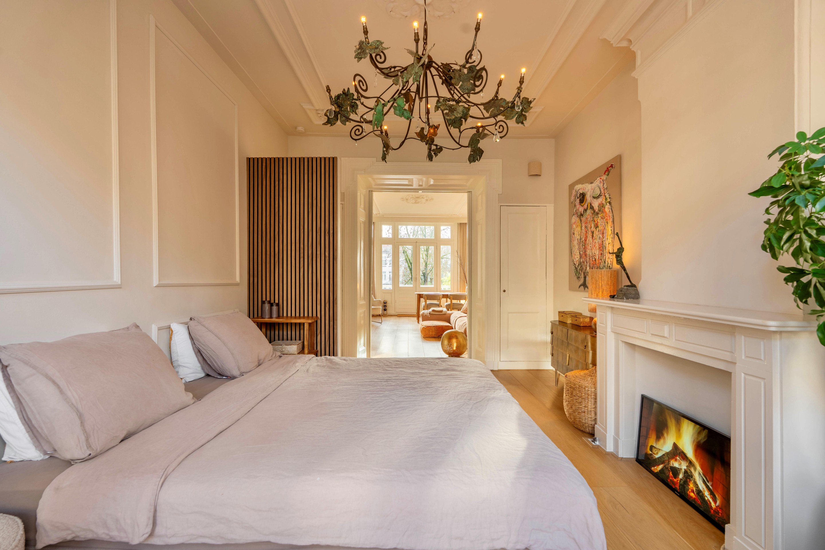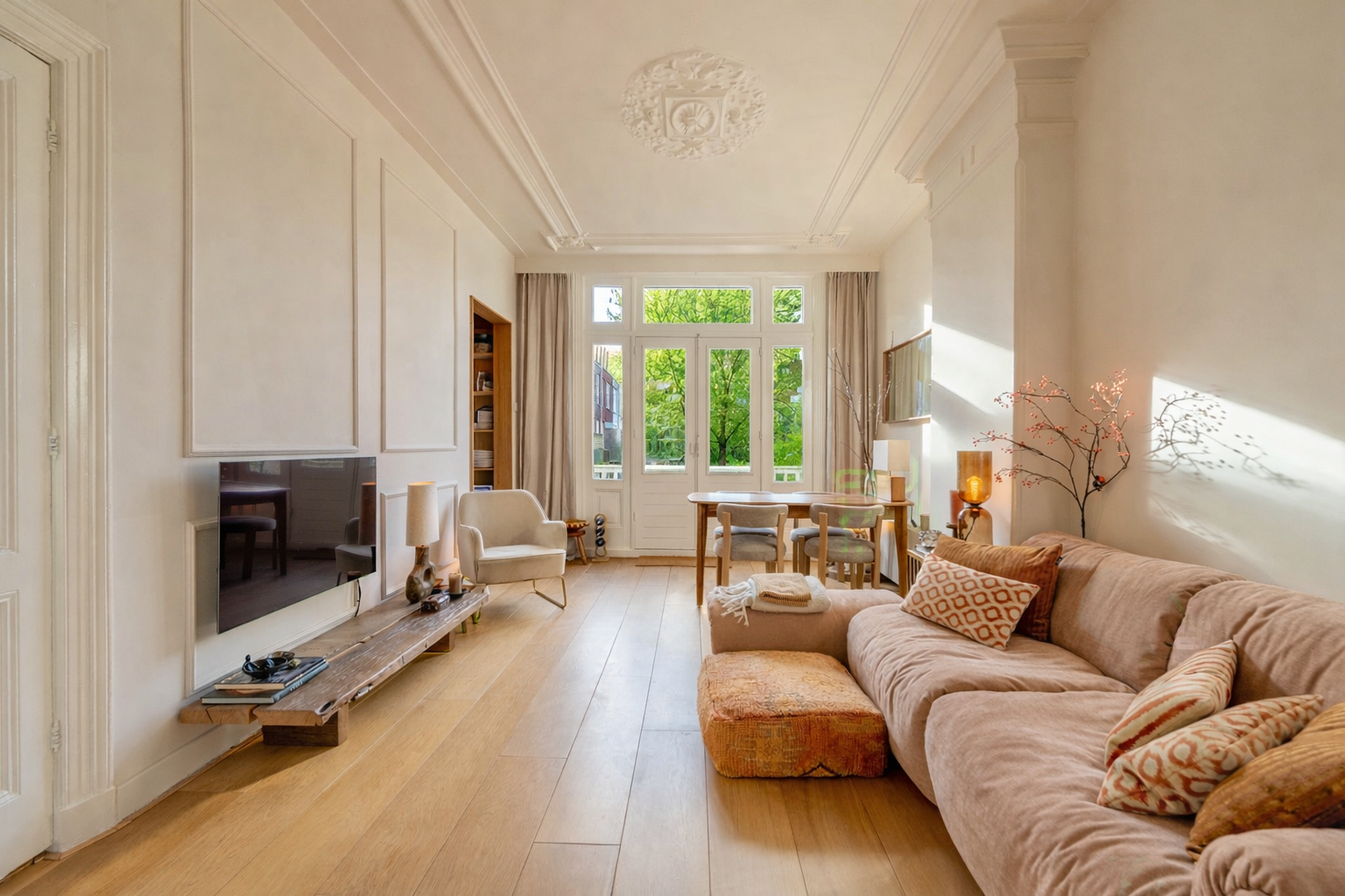 De woonkamer ligt aan de achterzijde en heeft openslaande deuren naar het zonnige balkon op het zuidwesten. Het daglicht valt hier rijkelijk naar binnen en benadrukt de fraaie plafondhoogte en de sierlijke ornamenten. De karakteristieke ensuite deuren vormen het stijlvolle middelpunt van de woning en verbinden de woonruimte met de slaapkamer aan de voorzijde. Ze geven flexibiliteit én versterken het authentieke karakter van het appartement. Open voor een ruimtelijk effect, gesloten voor privacy — precies zoals je het wilt.