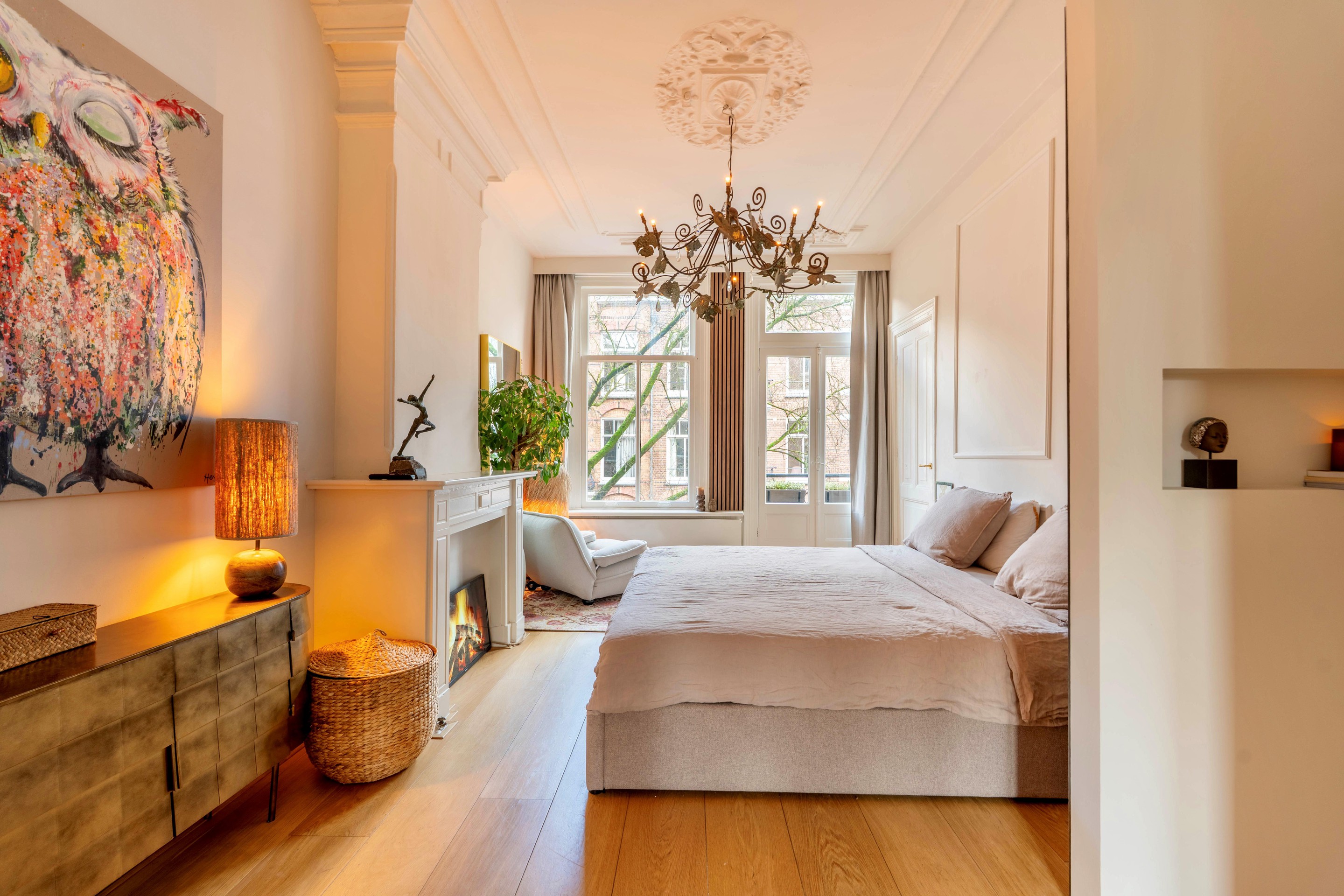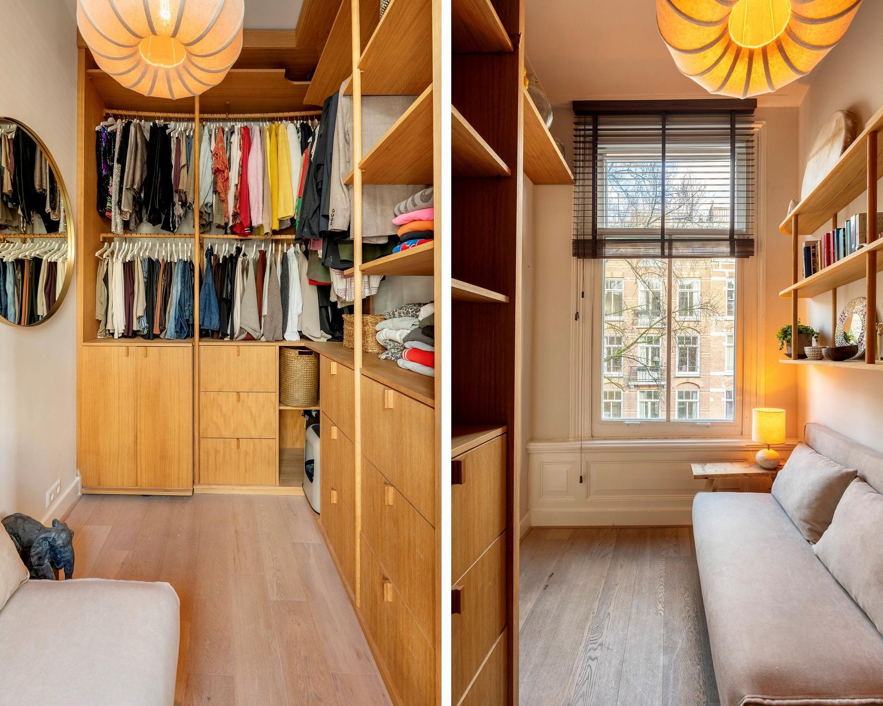 Aan de voorzijde bevindt zich de ruime slaapkamer met openslaande deuren naar het Franse balkon. Hier geniet je van het zachte ochtendlicht en de indrukwekkende plafondhoogte van circa drie meter, verrijkt met authentieke ornamenten en sierlijsten. Aangrenzend ligt de tweede kamer, momenteel ingericht als kledingkamer. Deze ruimte beschikt over een op maat gemaakte inbouwkast, waardoor elke centimeter optimaal benut wordt. Uiteraard is deze kamer ook perfect geschikt als werkkamer of logeerruimte.