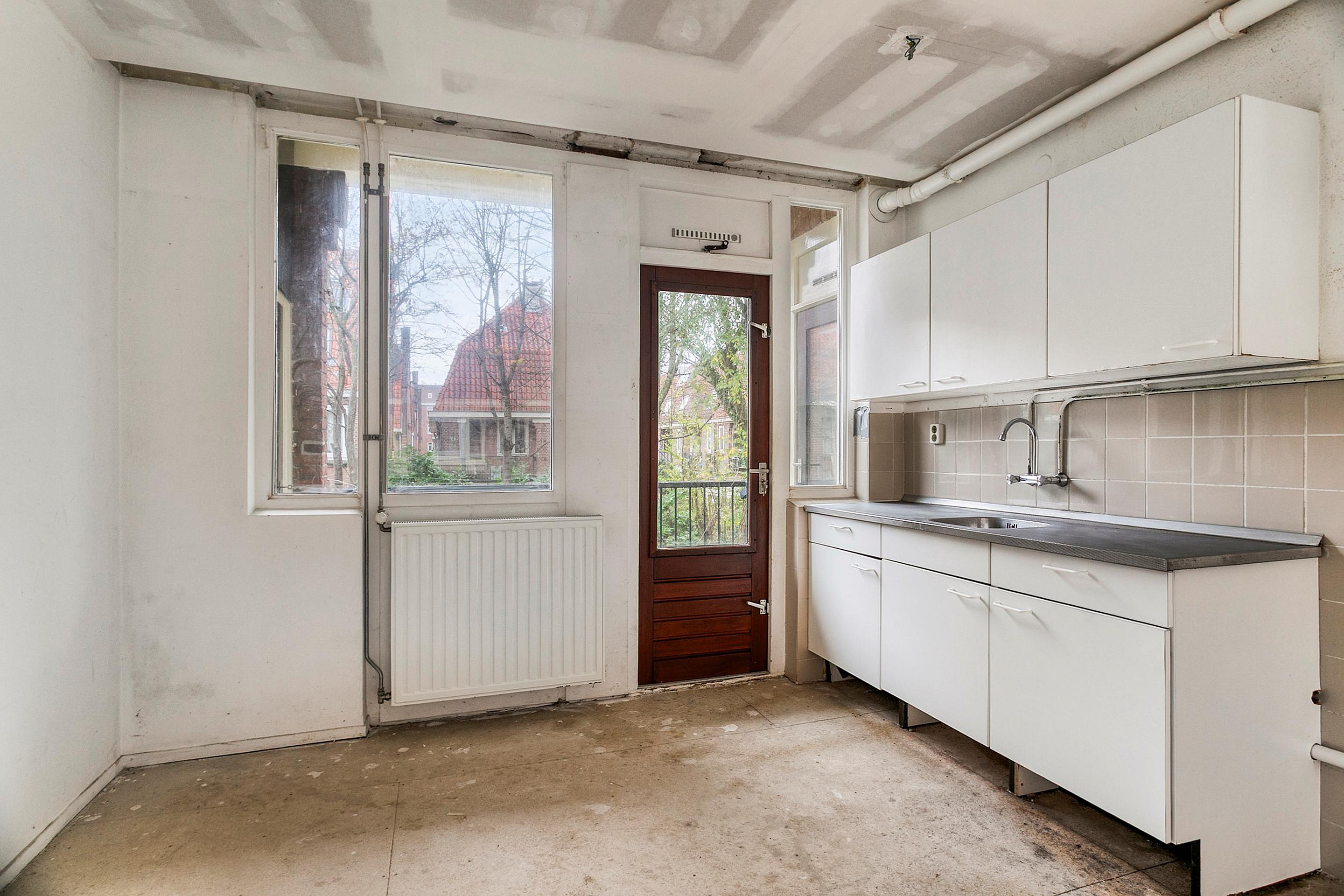 Aan de achterzijde ligt de keuken, uitgevoerd met een eenvoudig keukenblok. Vanuit de keuken is er toegang tot het balkon, gelegen aan de achterzijde van de woning. Op deze verdieping bevindt zich tevens een slaapkamer met toegang tot het balkon, een separaat toilet.