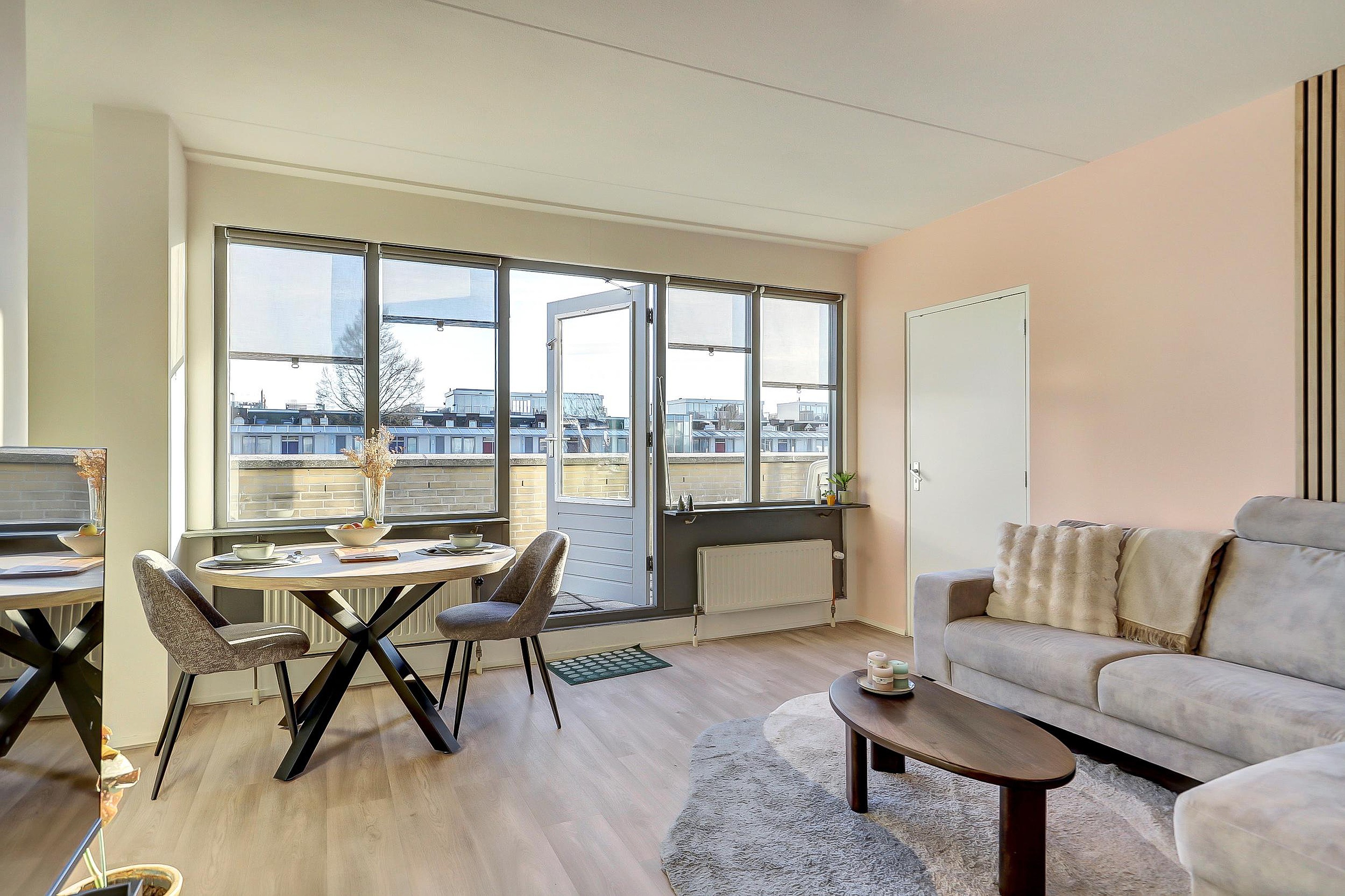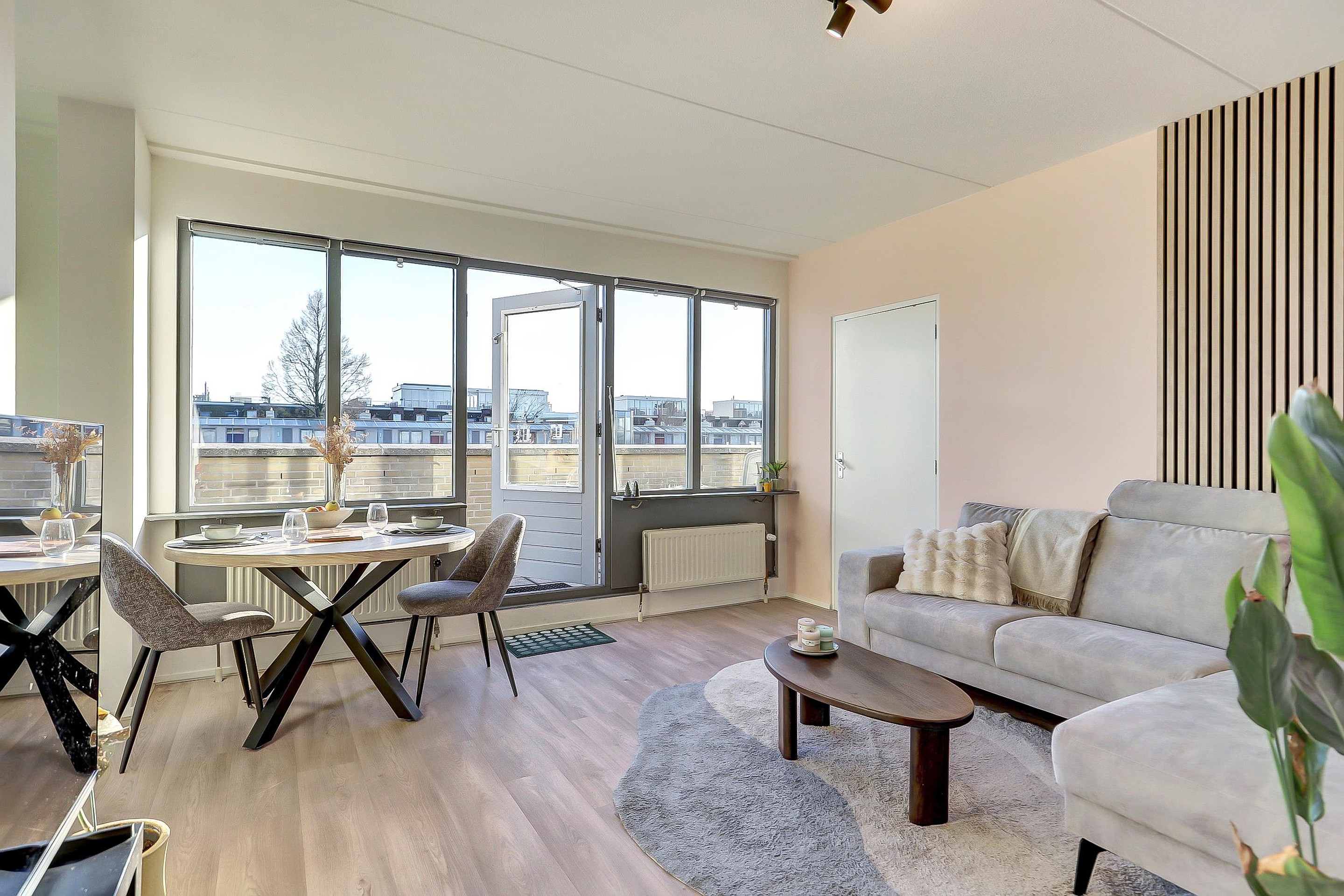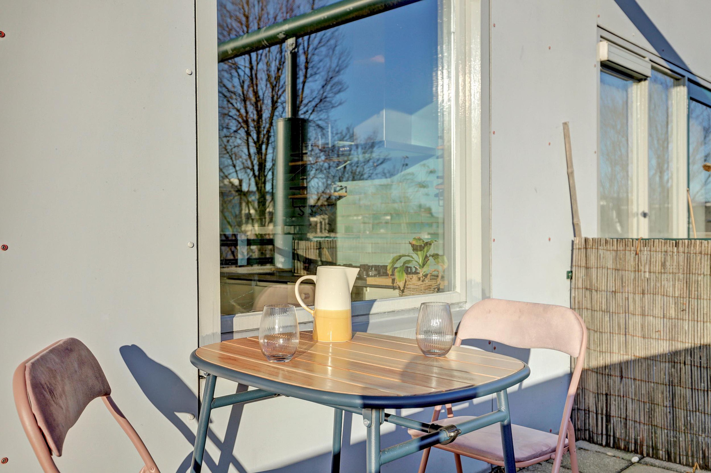 Upon entering you immediately enter the bright living room, which flows seamlessly into a modern open kitchen, perfect for both daily use and for receiving guests. The two spacious bedrooms are not adjacent to each other, giving the whole a practical and nice layout. The bathroom is large by Amsterdam standards and is in modern condition. Beautiful dark tiles, a walk-in rain shower with a glass shower wall. Toilet, bidet, radiator and a washbasin with large mirror. This apartment has been repainted in 2024 and has a new PVC floor which is very practical with the large balcony -terrace. This attractive balcony terrace of no less than 20m2! The perfect place for a cup of coffee in the morning sun or a relaxing glass of wine in the evening with friends, nicely around the BBQ. And do realize that there is no higher building in the surrounding then this apartment complex, so a lot of sun if its shining.