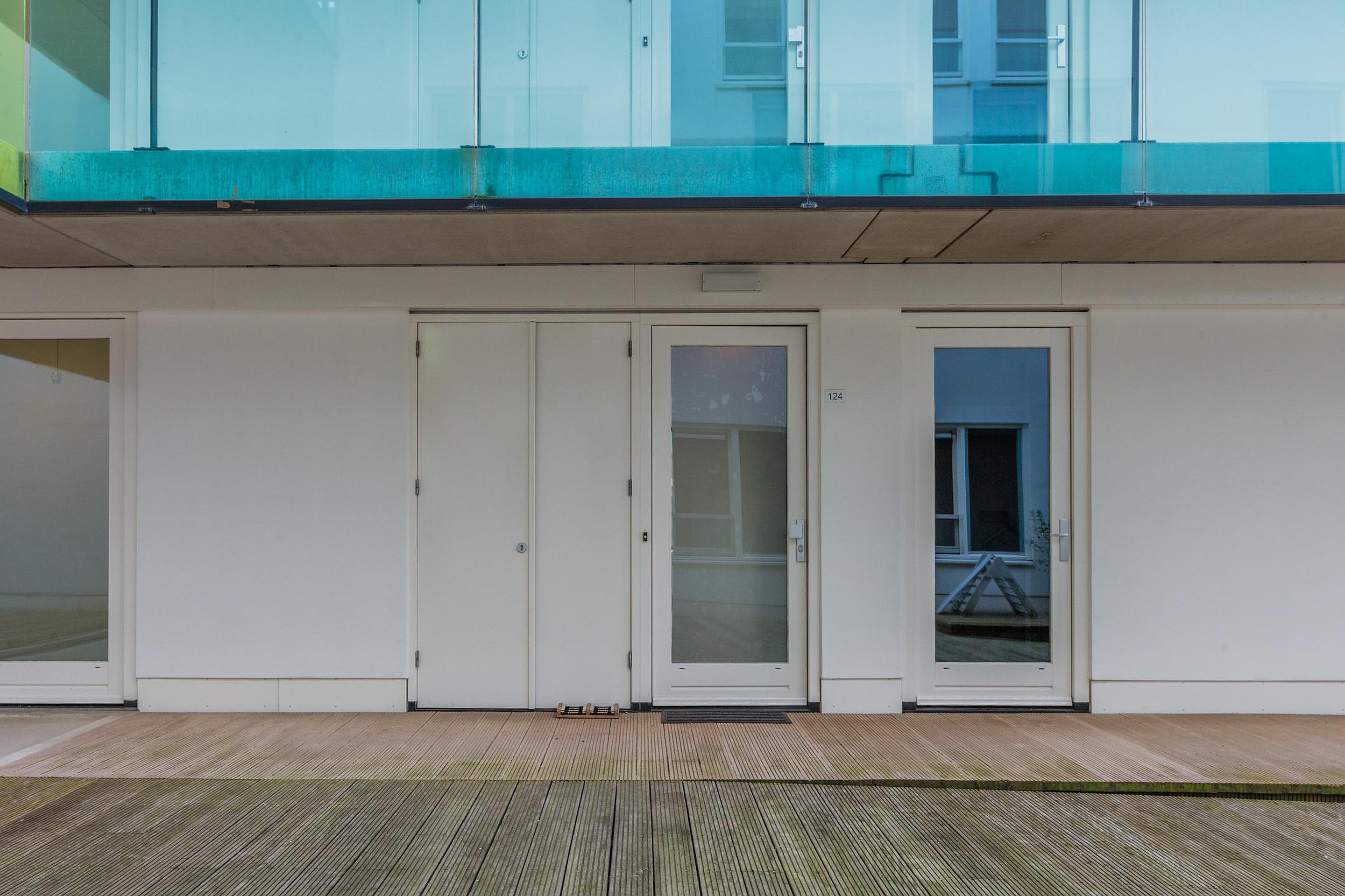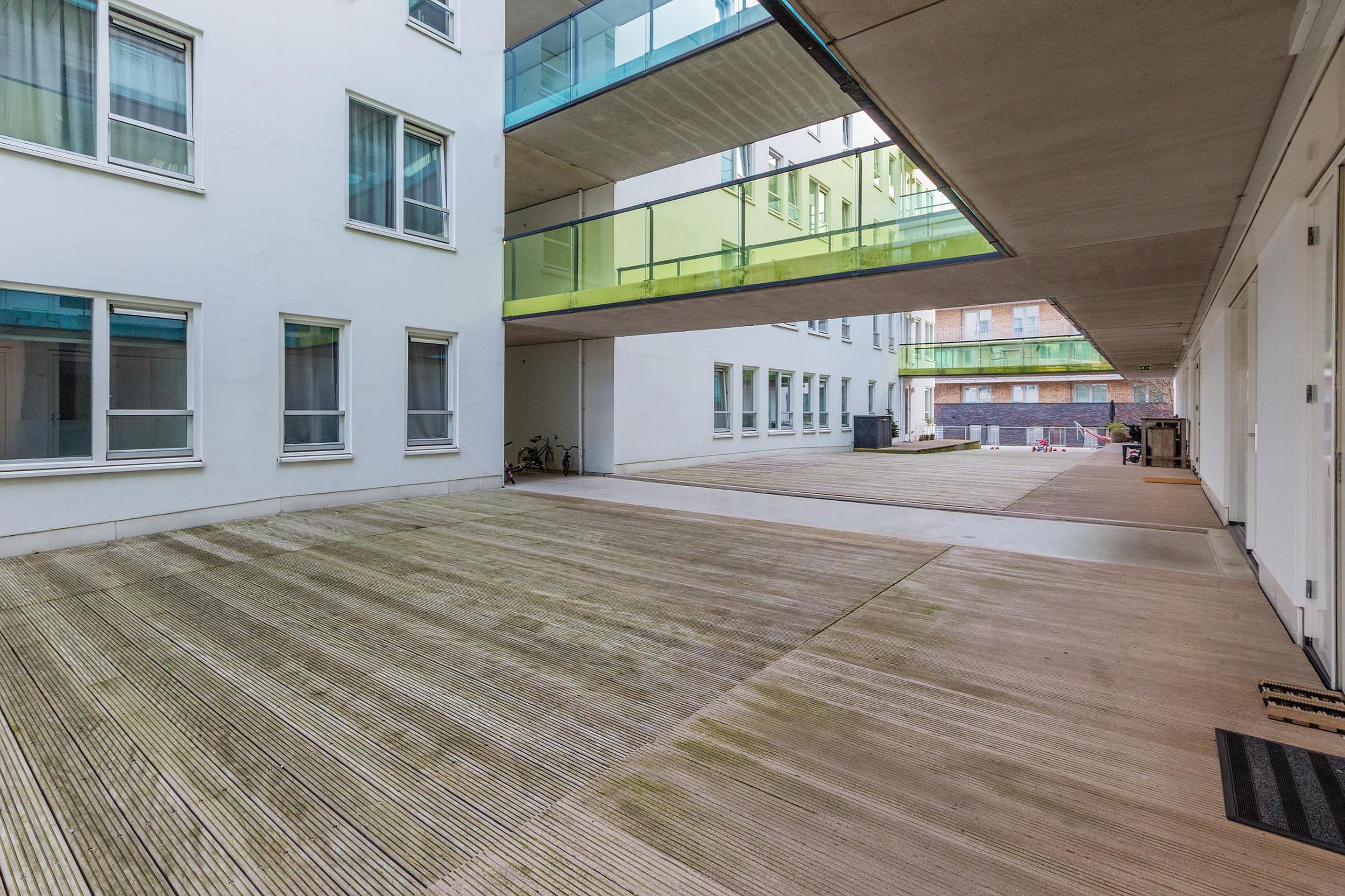 De privéparkeerplaats bevindt zich in de afgesloten parkeergarage en is via de centrale entree of lift bereikbaar met het C-lock systeem. Het appartement grenst direct aan het houten leefdek, wat zorgt voor een extra ruimtelijk gevoel en een prettige, rustige woonbeleving midden in de stad.
