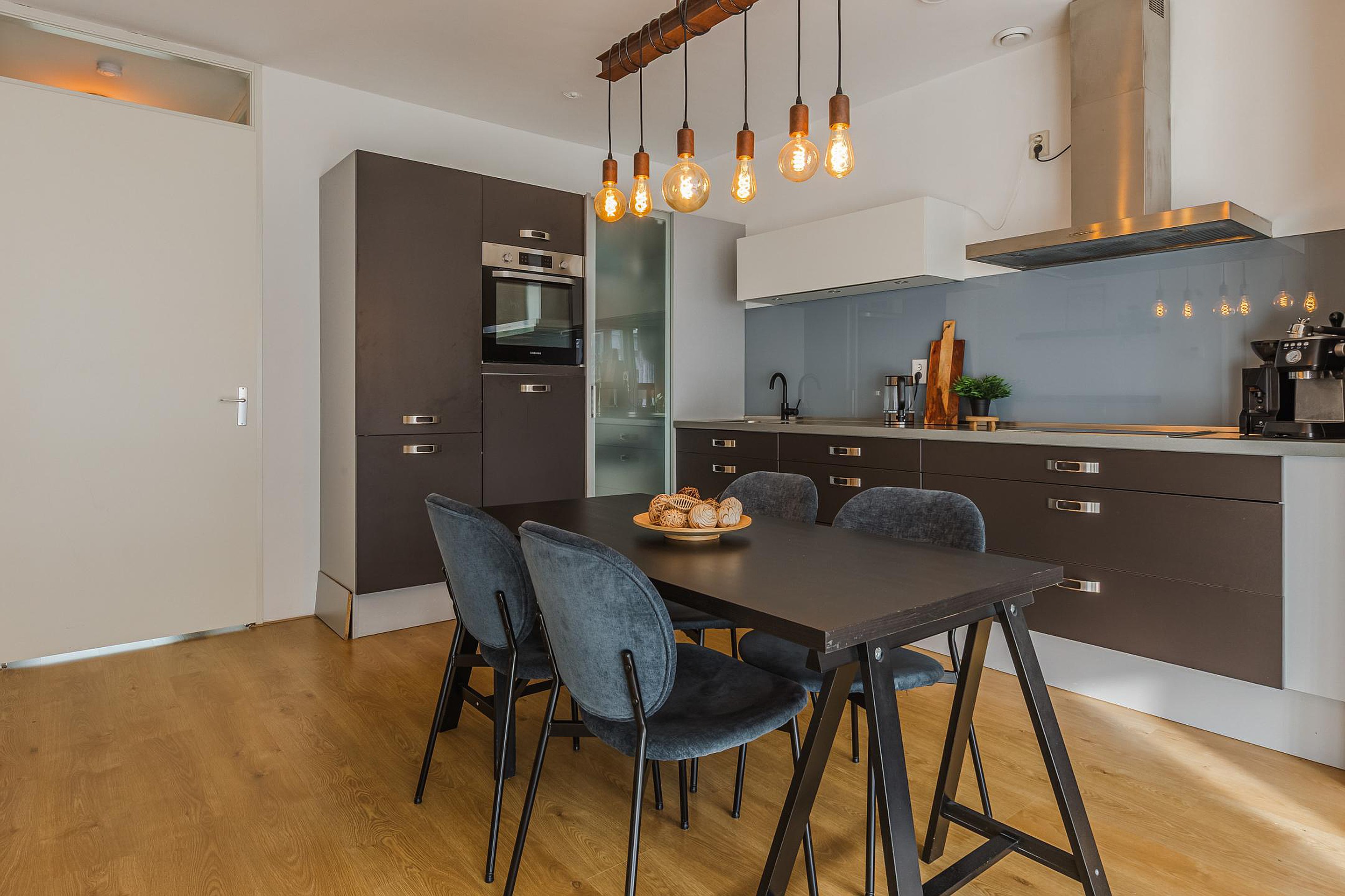 De open keuken is compleet uitgevoerd met diverse inbouwapparatuur, waaronder een verhoogde vaatwasser, elektrische kookplaat, afzuigkap, koel-/vriescombinatie en oven. Dankzij de brede lades en praktische hoekkast met ingebouwde sensorverlichting is er volop opbergruimte.