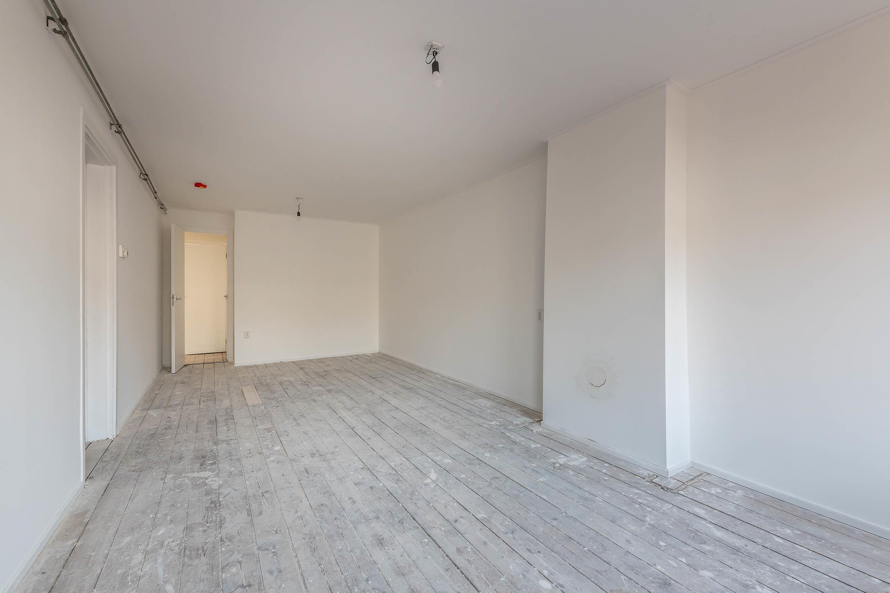 De woonkamer bevindt zich aan de voorzijde van het appartement en wordt gekenmerkt door grote ramen met glas-in-lood. Dit zorgt voor een bijzondere lichtinval en geeft de ruimte een eigen karakter.