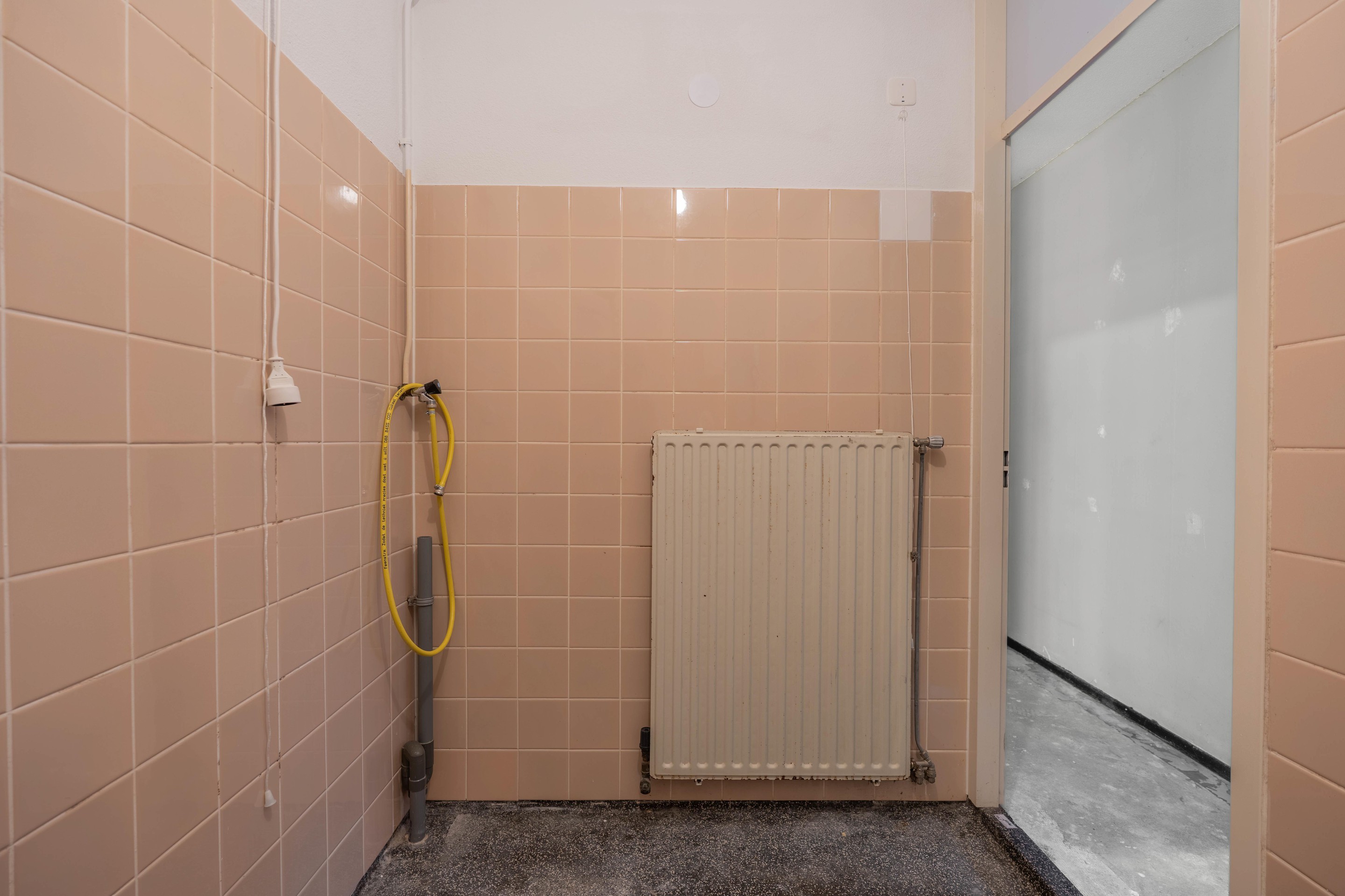 De gesloten keuken is voorzien van een eenvoudig keukenblok. Het is een functionele ruimte die volop mogelijkheden biedt voor een eigen invulling. In het midden van de woning bevindt zich de badkamer met douche en wastafel, met daarnaast een separaat toilet.